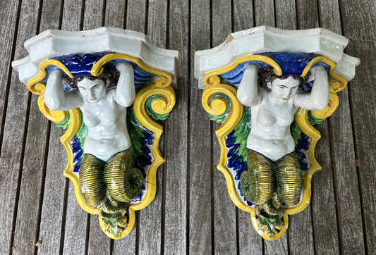 Pair of Italian Glazed Ceramic, Majolica Wall Brackets