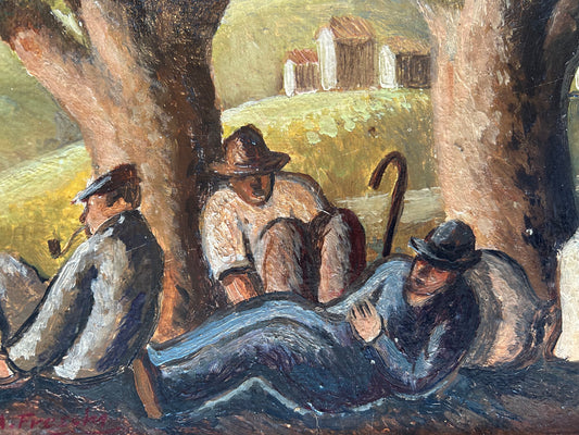 Fine Italian Landscape with Peasants at Rest, Oil on Board, Late 19th Century