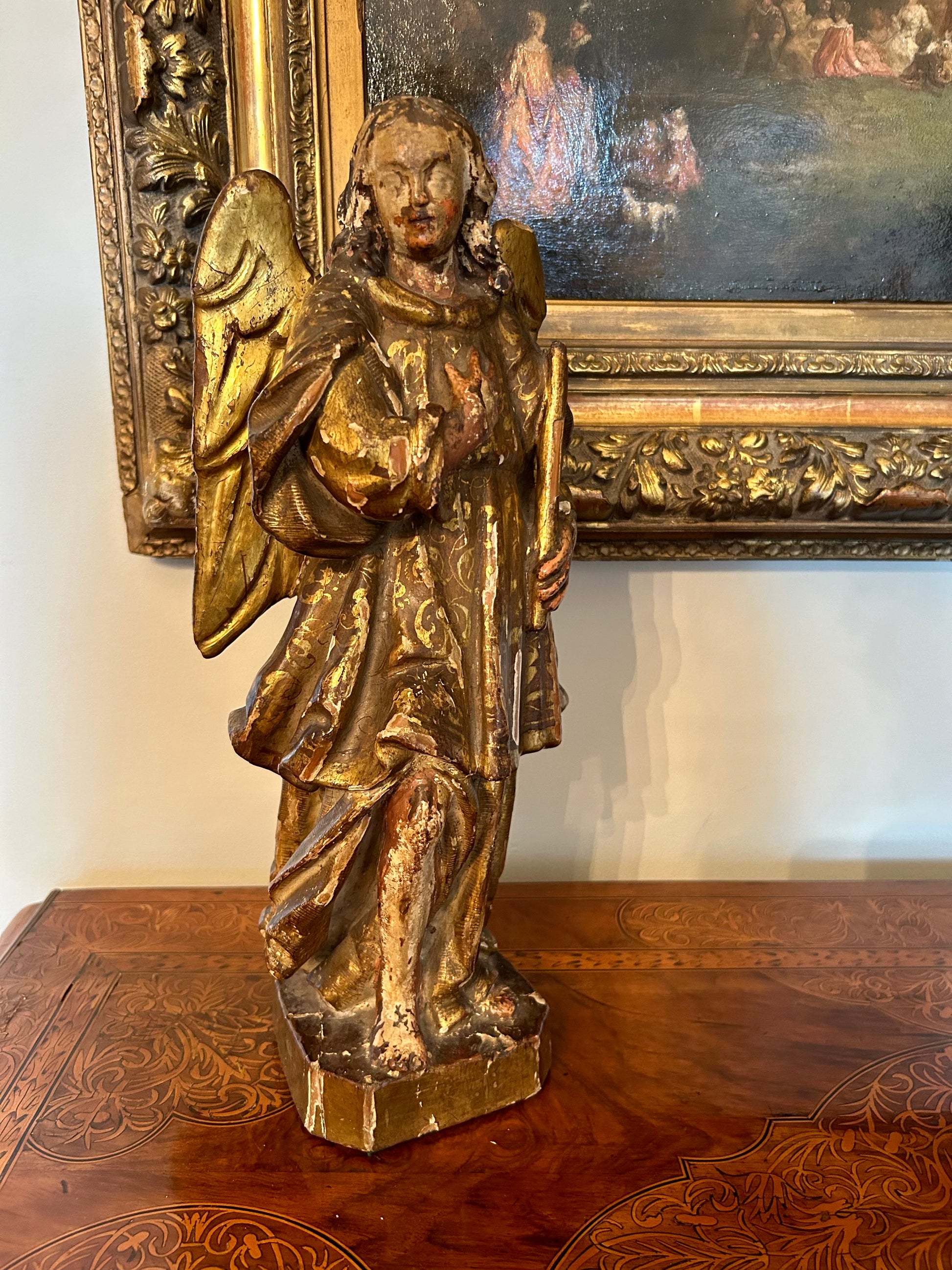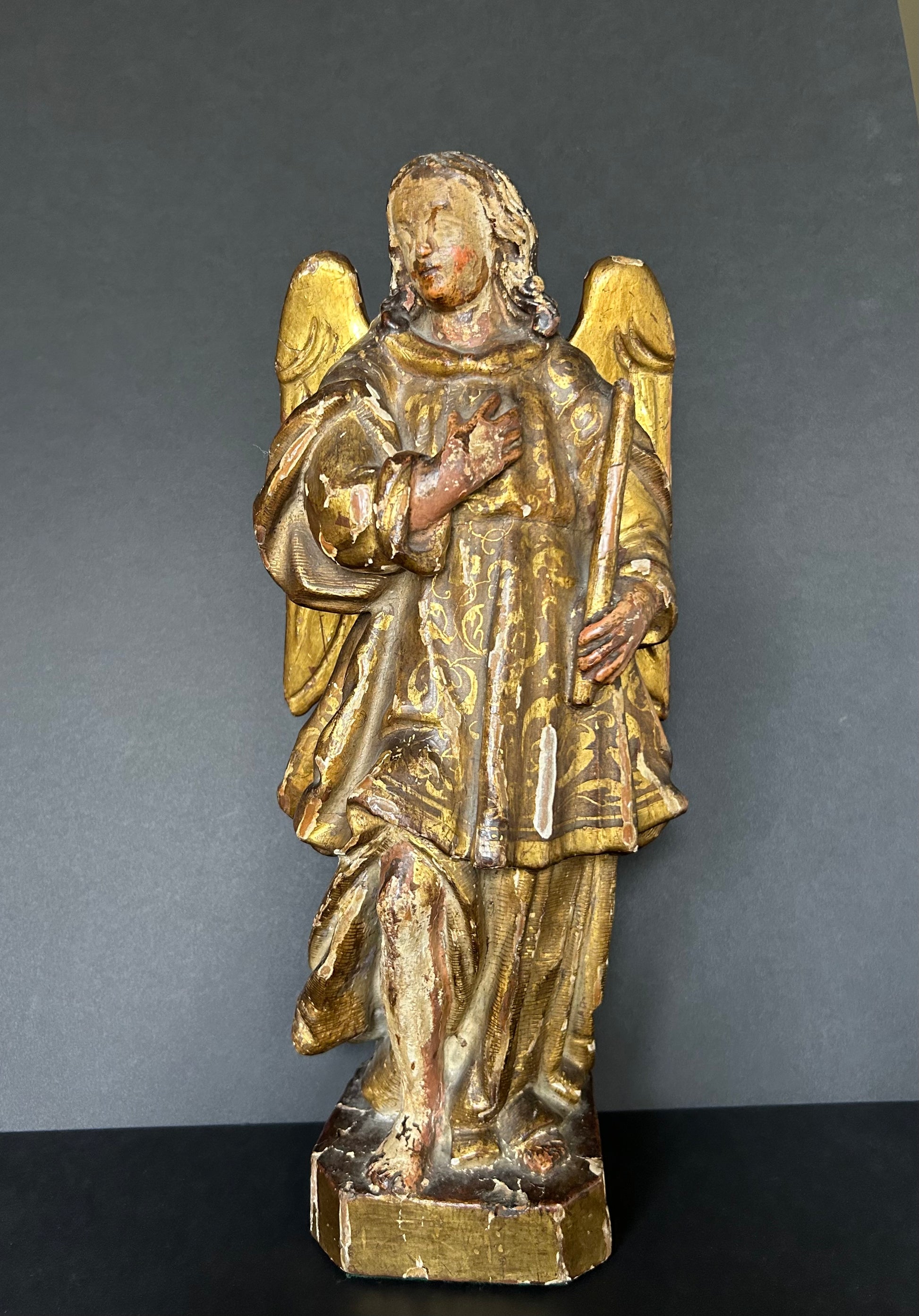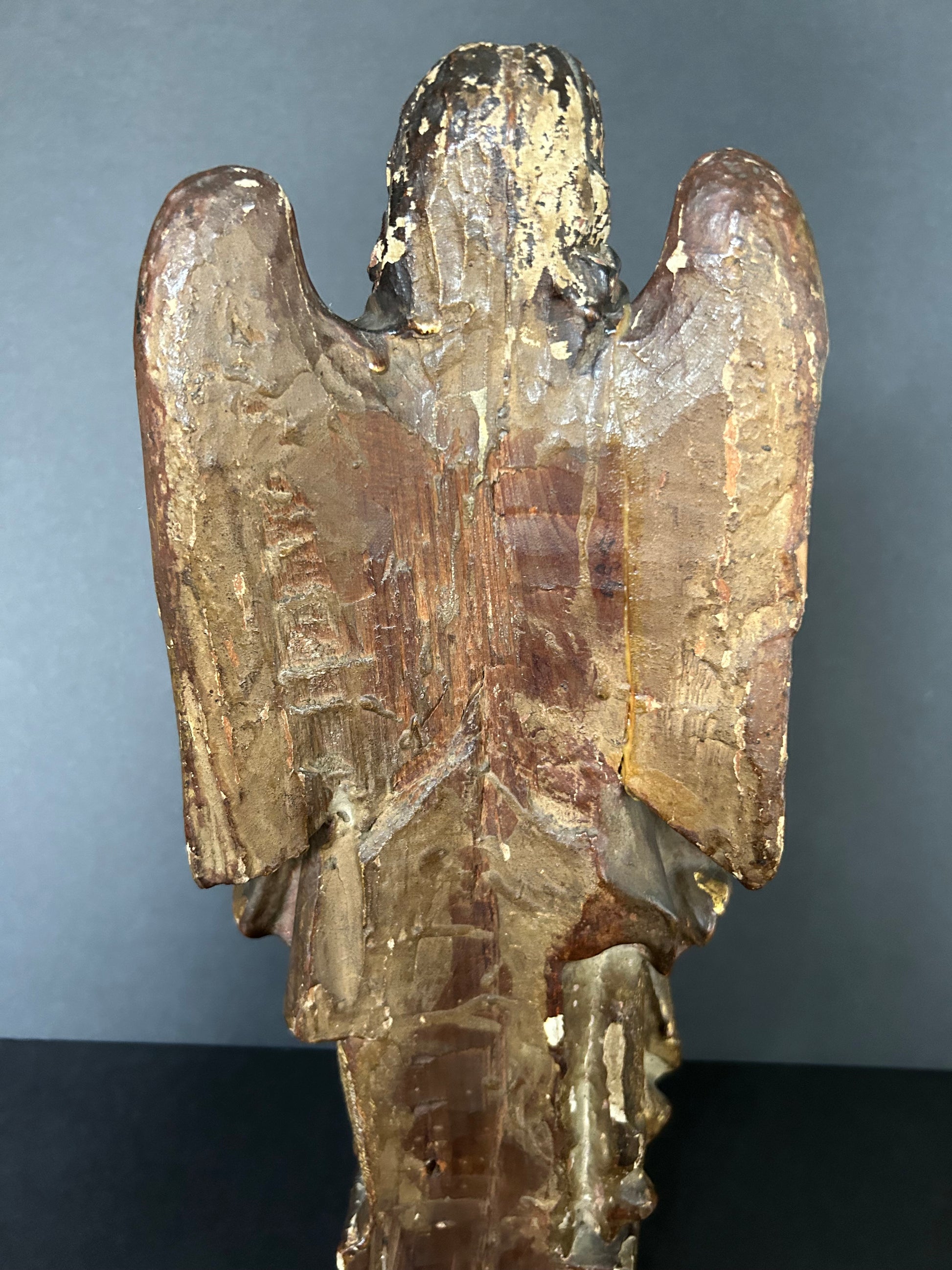 This is an exquisite, polychrome saint, or santo, possibly depicting the archangel Michael or Raphael, from the 17th or early 18th century. The statue is most likely Spanish, but possibly Italian. Beautifully carved and gilded with remnants of flesh-toned paint on the limbs and face. The figure still possesses its two wings intact, which is rare for statues of this age, and the turned head and forward leg give the piece a wonderful sense of movement. Gorgeously carved flowing robes are painted and gilded in an intricate, baroque pattern of swirls and flowers.