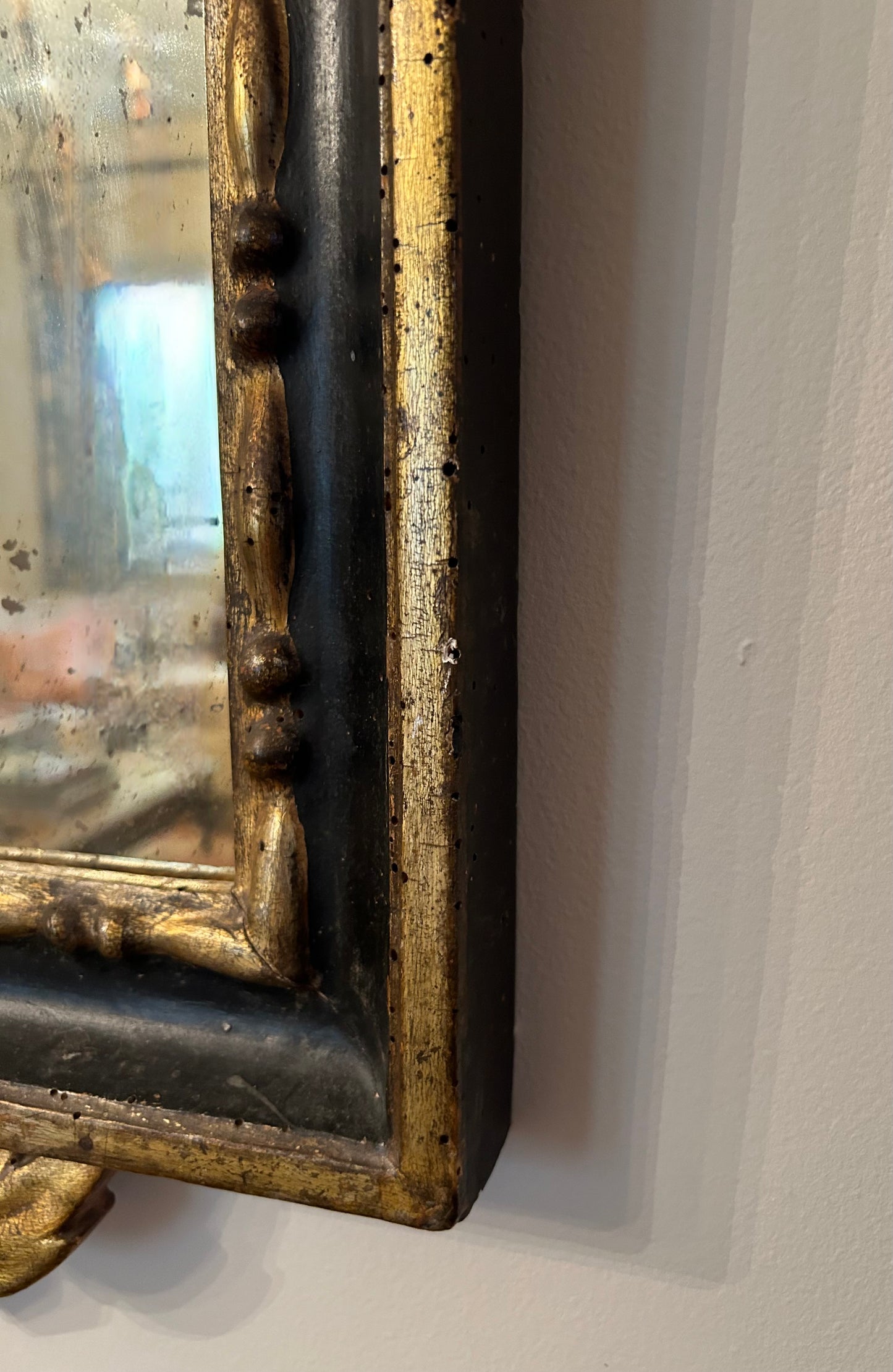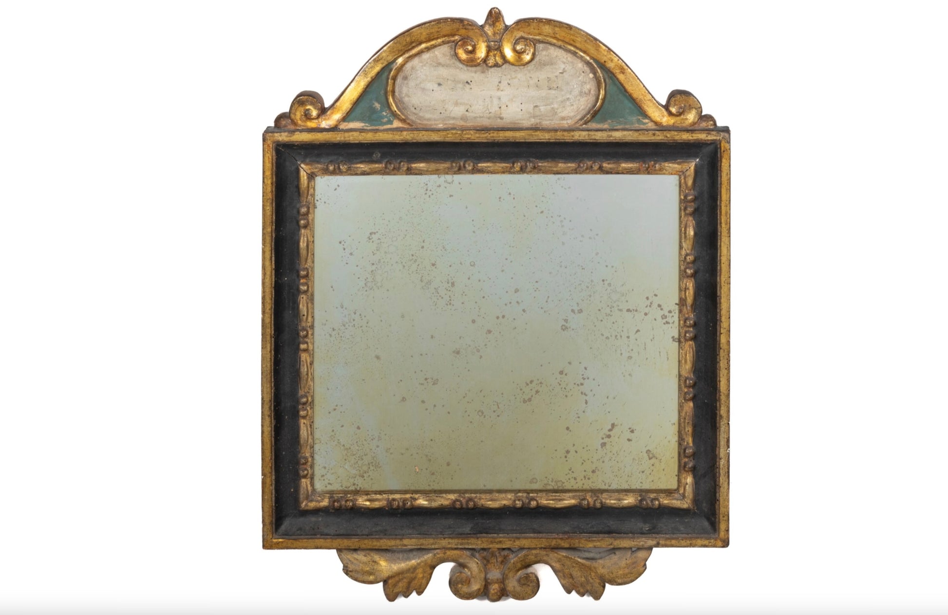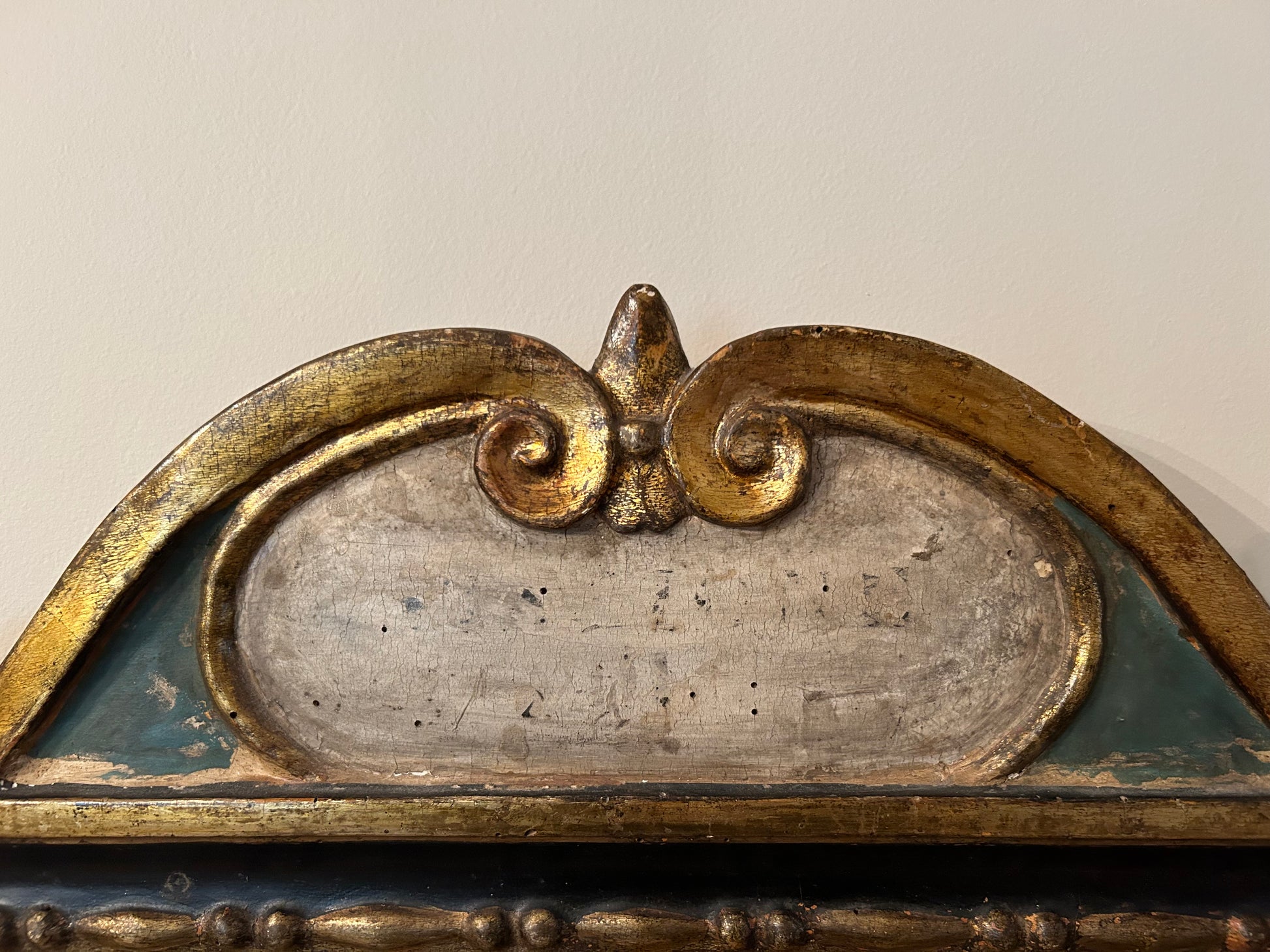 This is a wonderful 18th century mirror with its original glass, most probably from France or Italy. Painted in black and green with beautiful gilding on the frame and the upper and lower scrolls, with a white painted cartouche on the pediment. There is faint evidence of old lettering on the cartouche, which makes us speculate it may have hung in an ecclesiastical setting, or in the home of a prominent family.