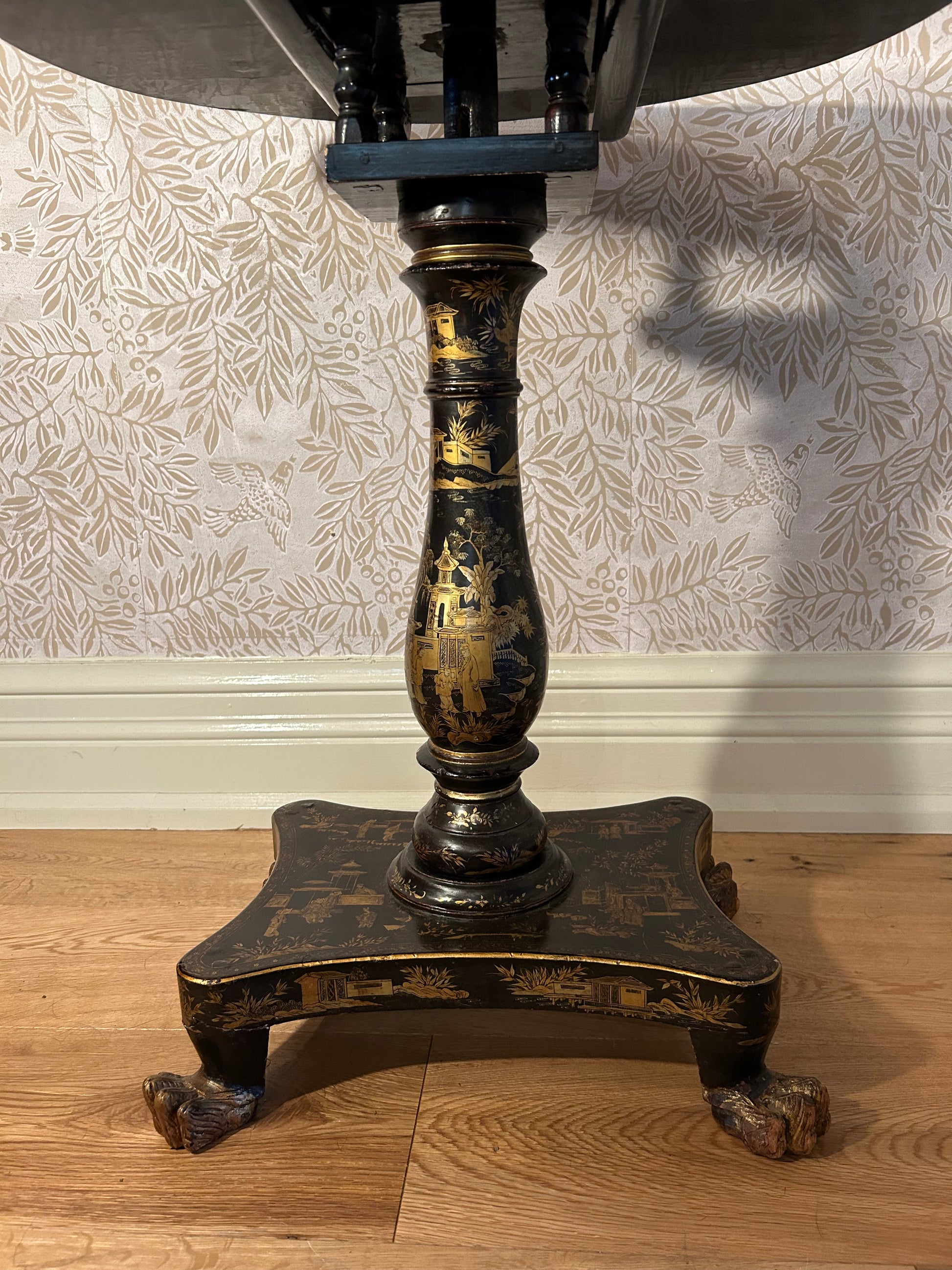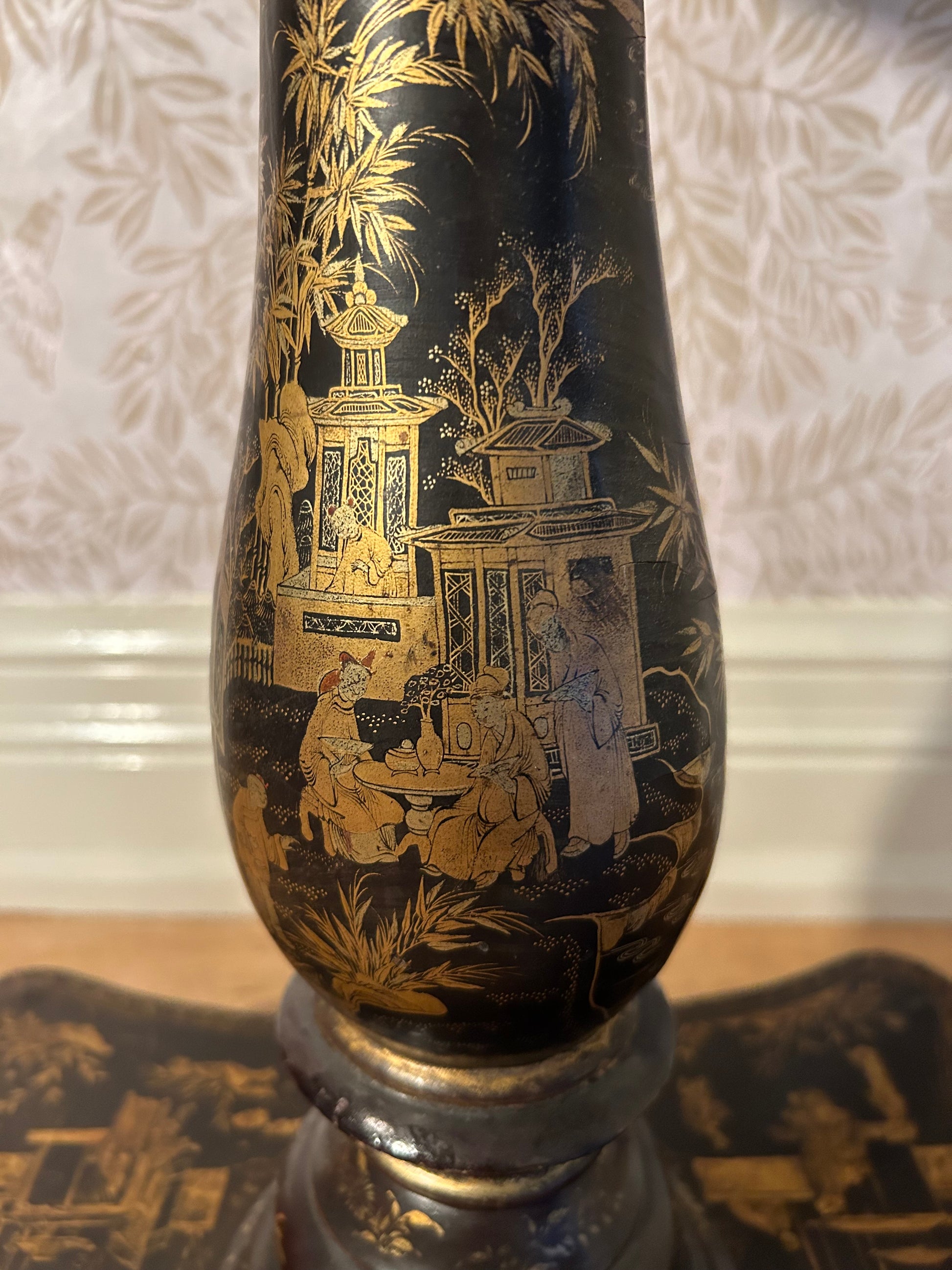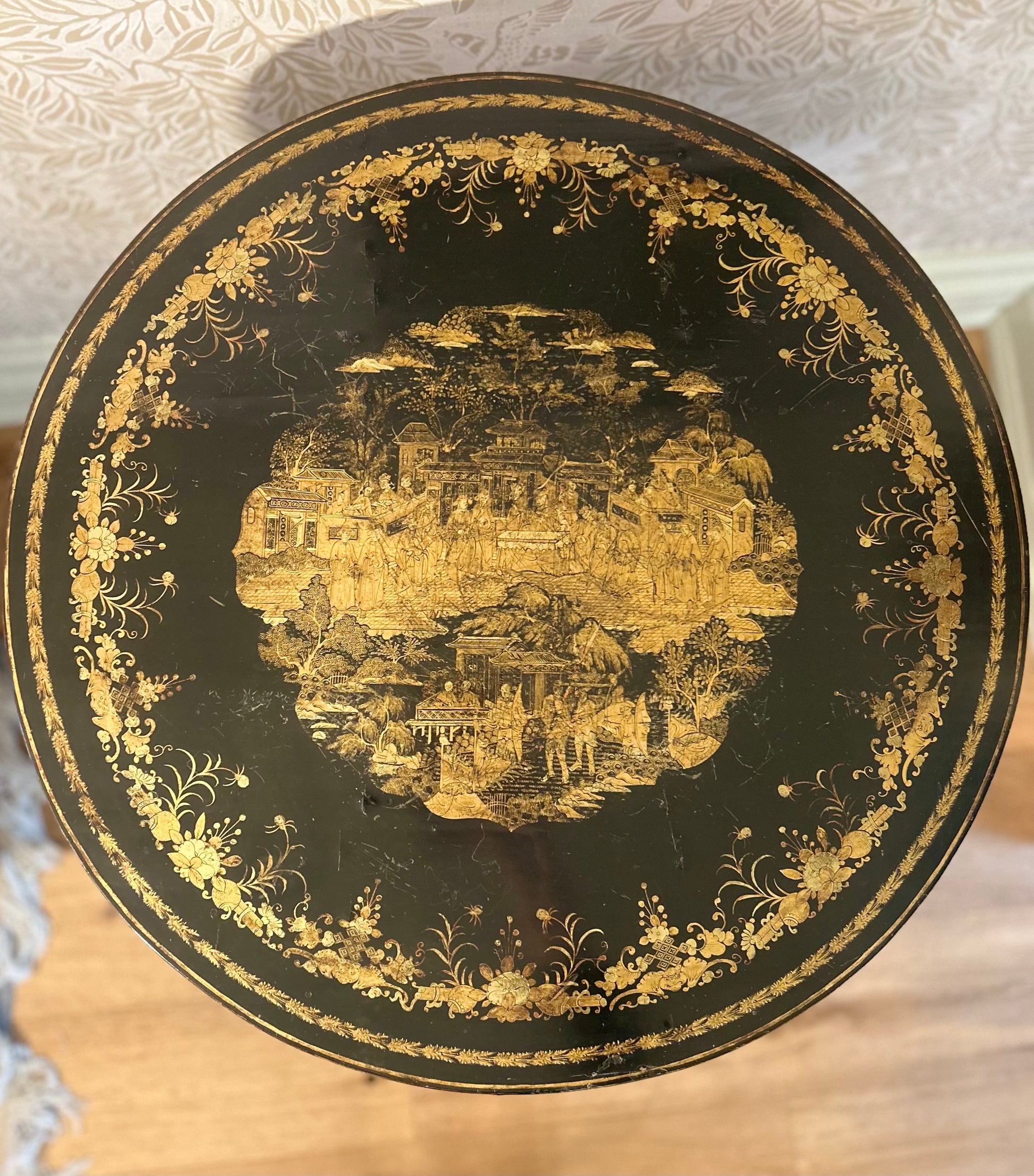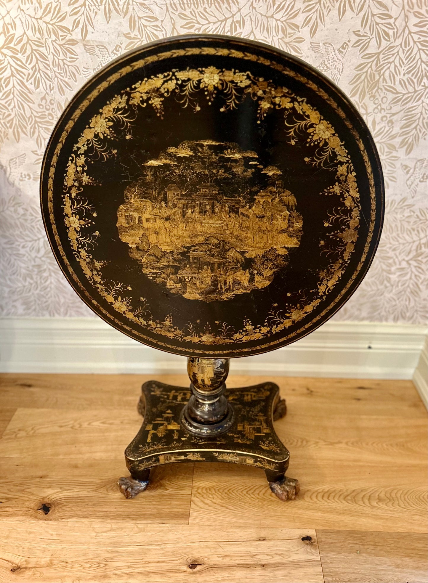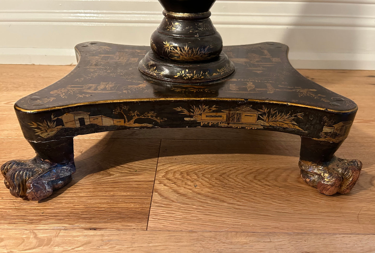This is an exquisite Chinese export tilt-top table with a quatrefoil base and four claw feet. The pedestal is in a baluster shape and the top is round. All in black lacquer with extremely fine gold chinoiserie designs throughout, depicting figures standing within a palace compound, surrounded by distant hills, trees and flowers.