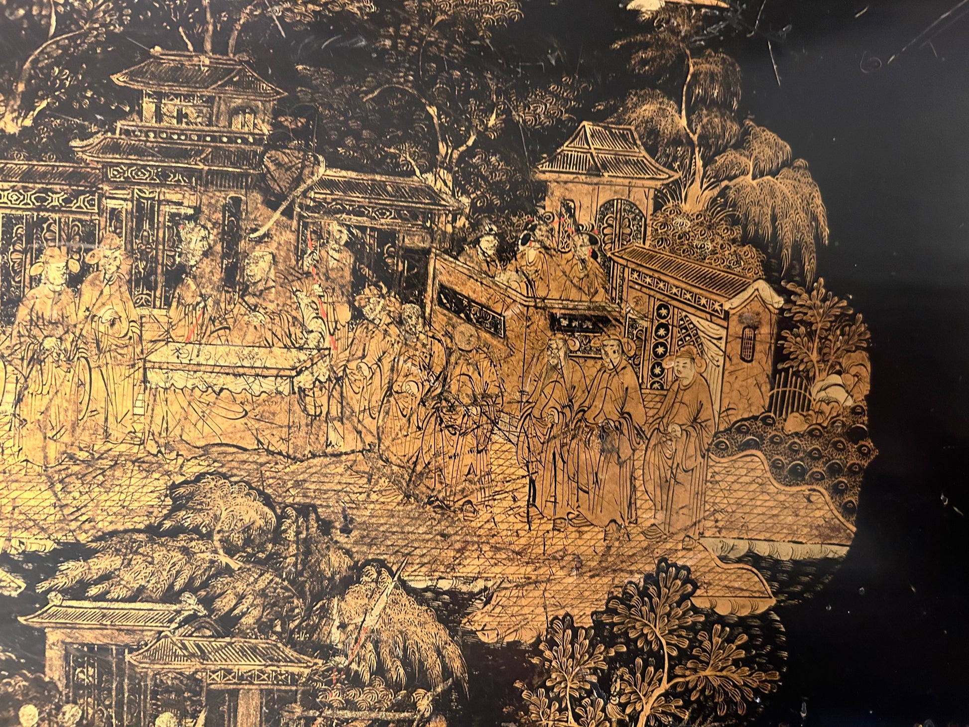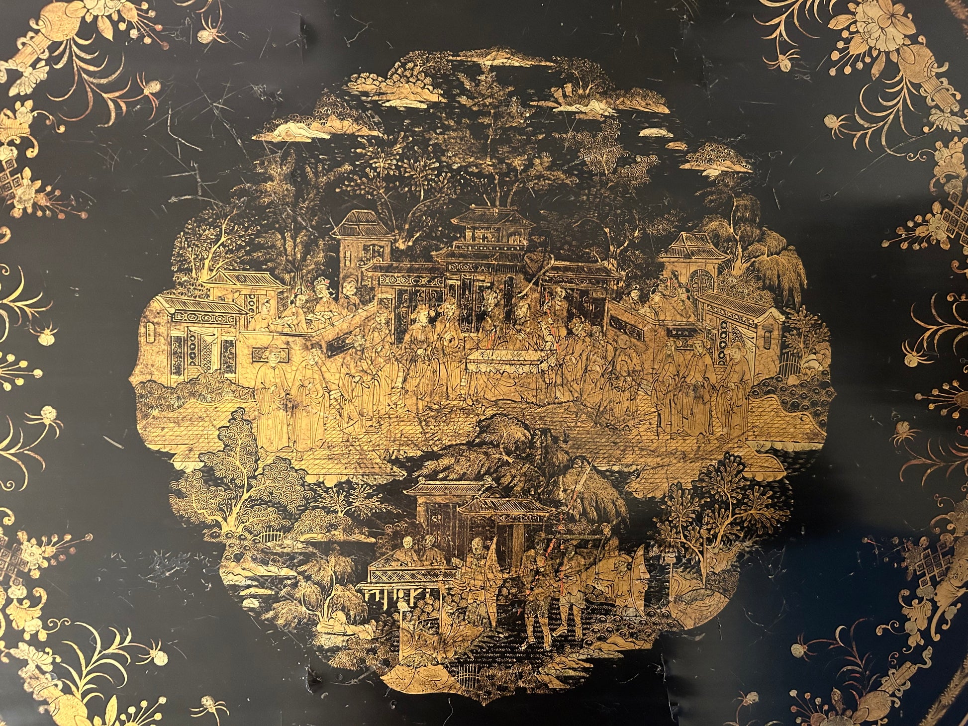 The top of the table slides on and off the base very easily. A little wobbly when sitting on the base, which can be easily remedied by inserting some padding to the top of the pedestal. (Not visible.) Some surface cracks, bubbling and very minor losses to the lacquer, please see photographs.