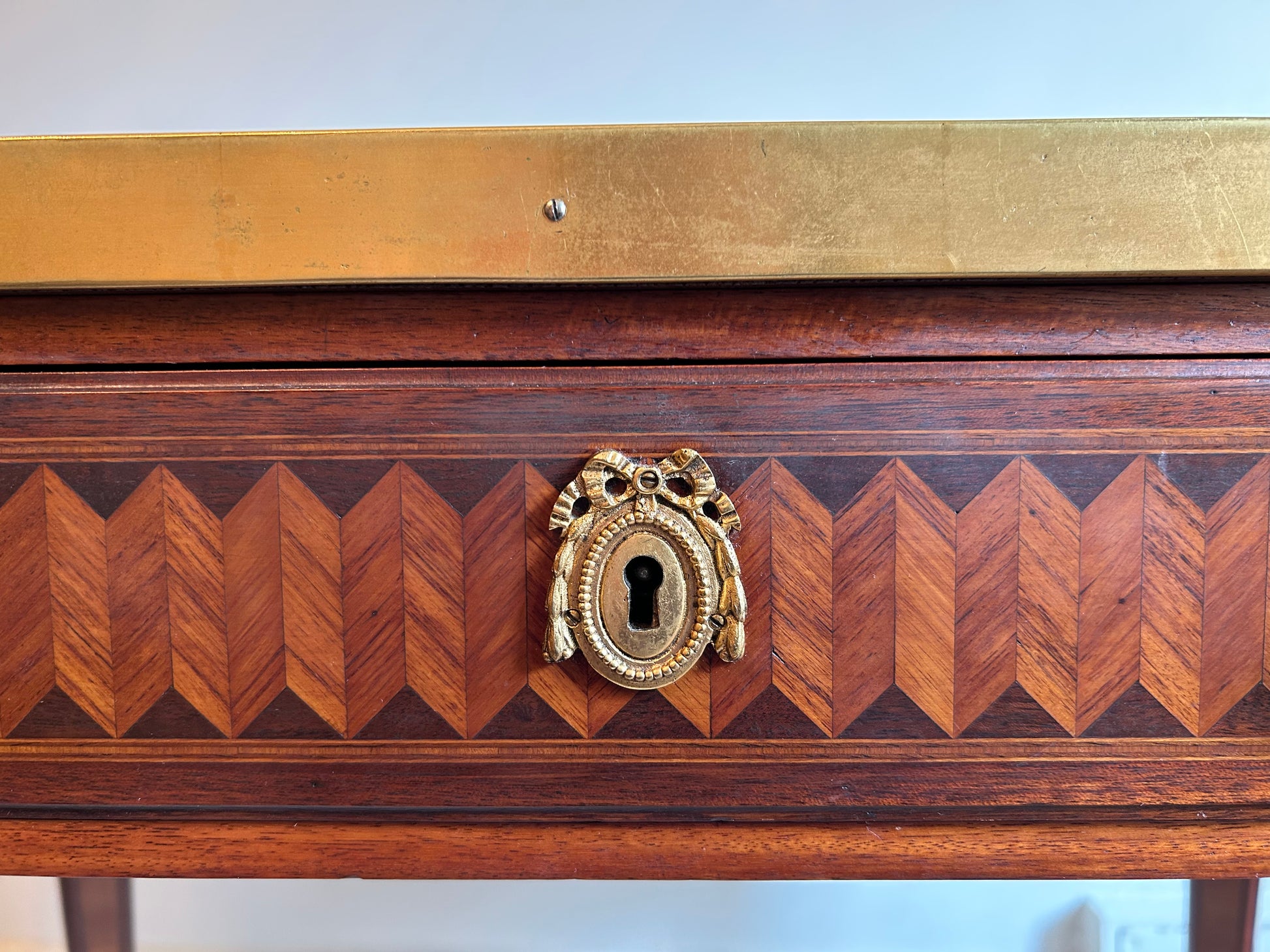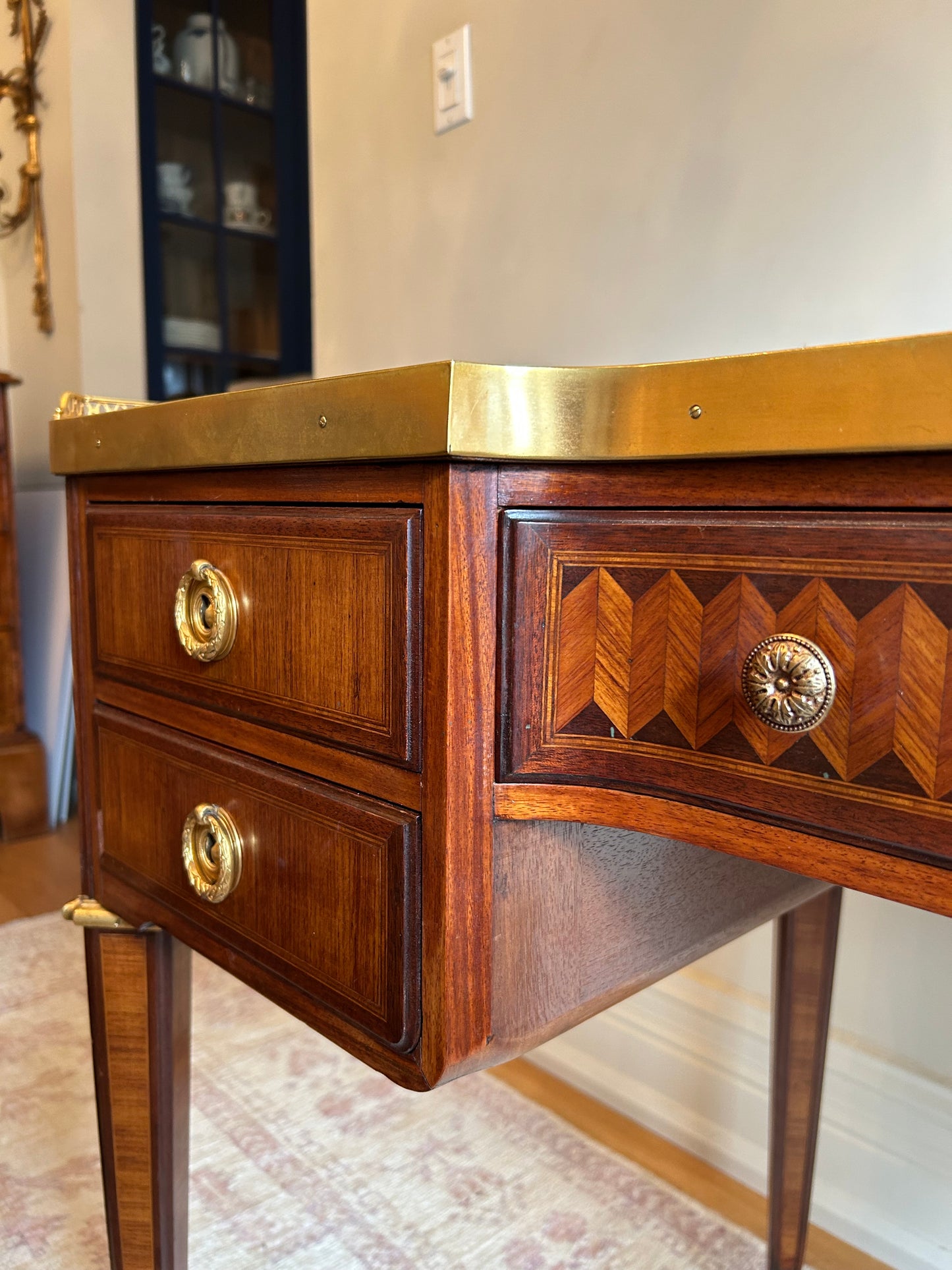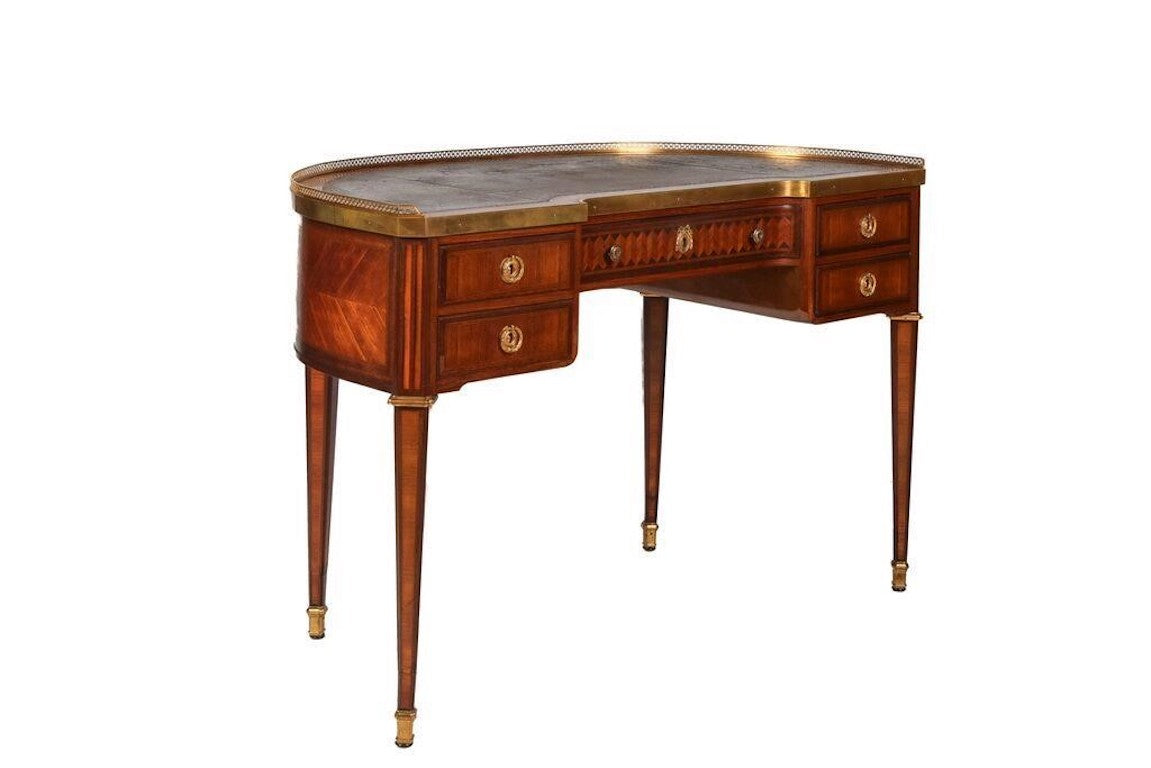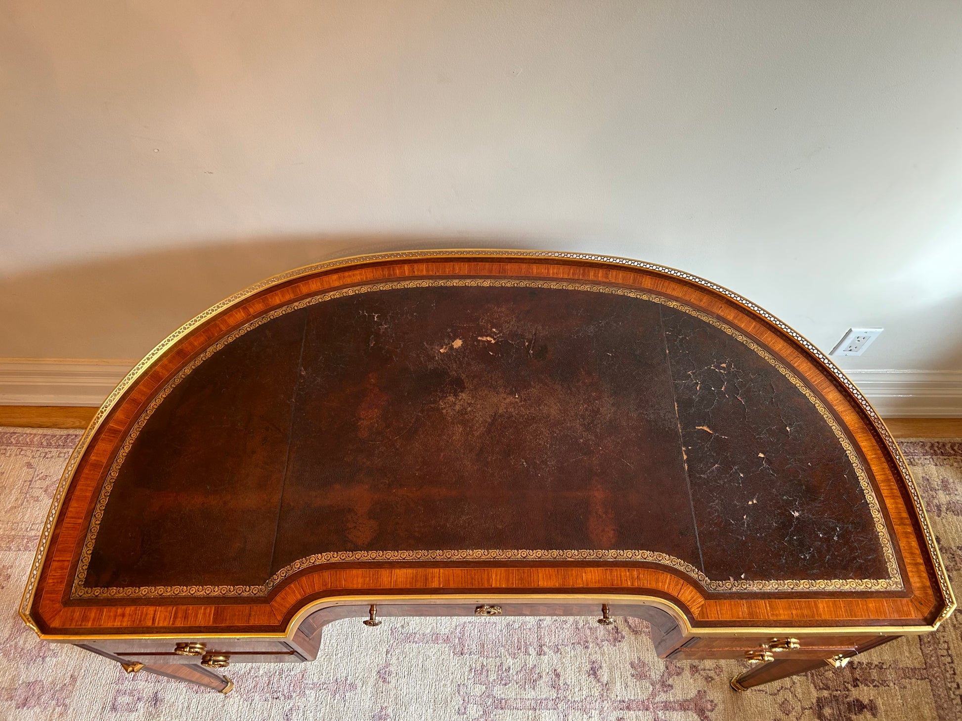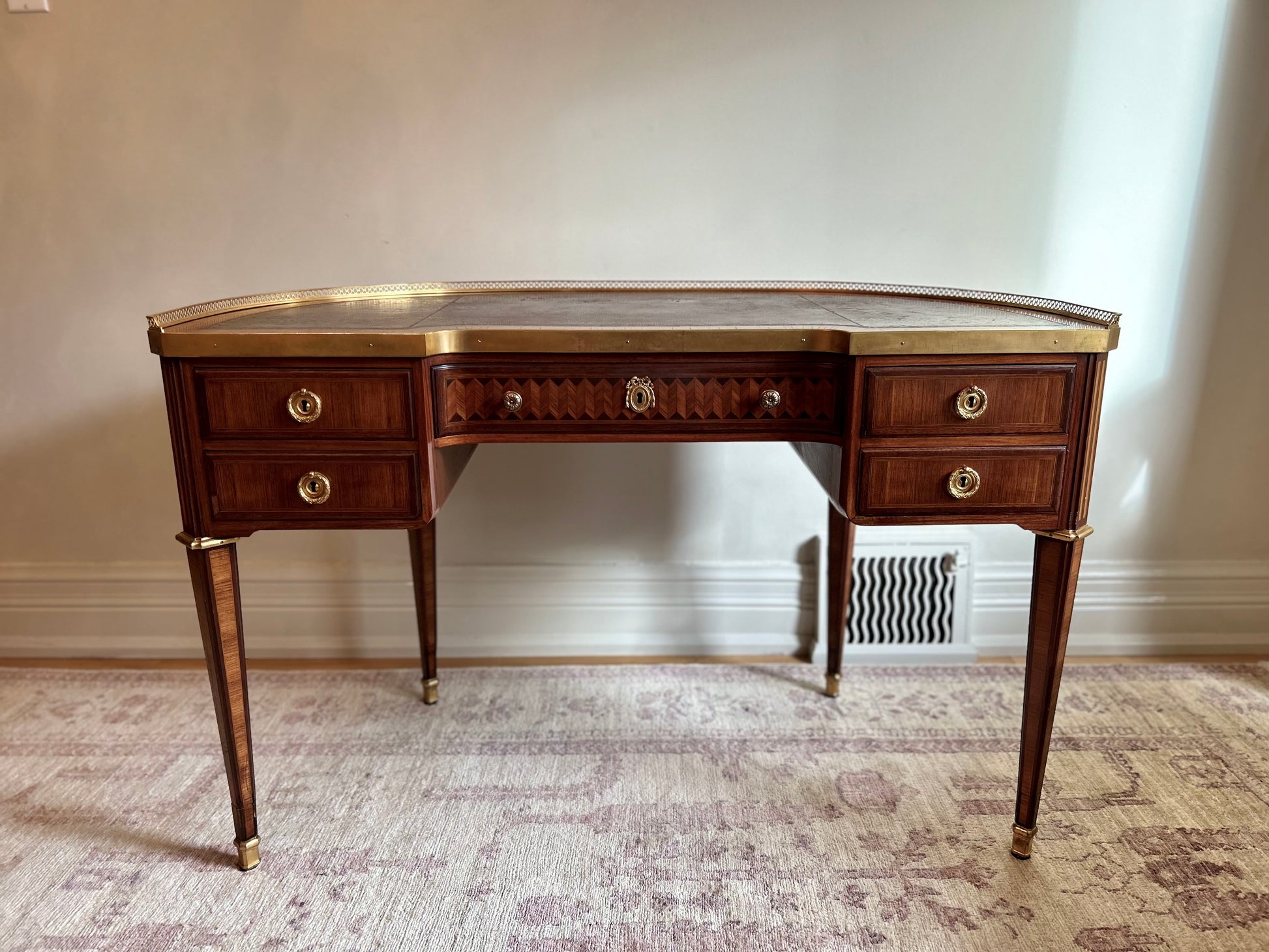 Late Nineteenth century kidney shaped desk in the stule of Louis XVI. Exquisite marquetry on the front drawers and throughout, with book matched satinwood veneers on the back. Gilt bronze galleried top and banding. Tapered legs ending in bronze feet. Leather writing surface with gold tooling. Dovetailed drawers in excellent condition.