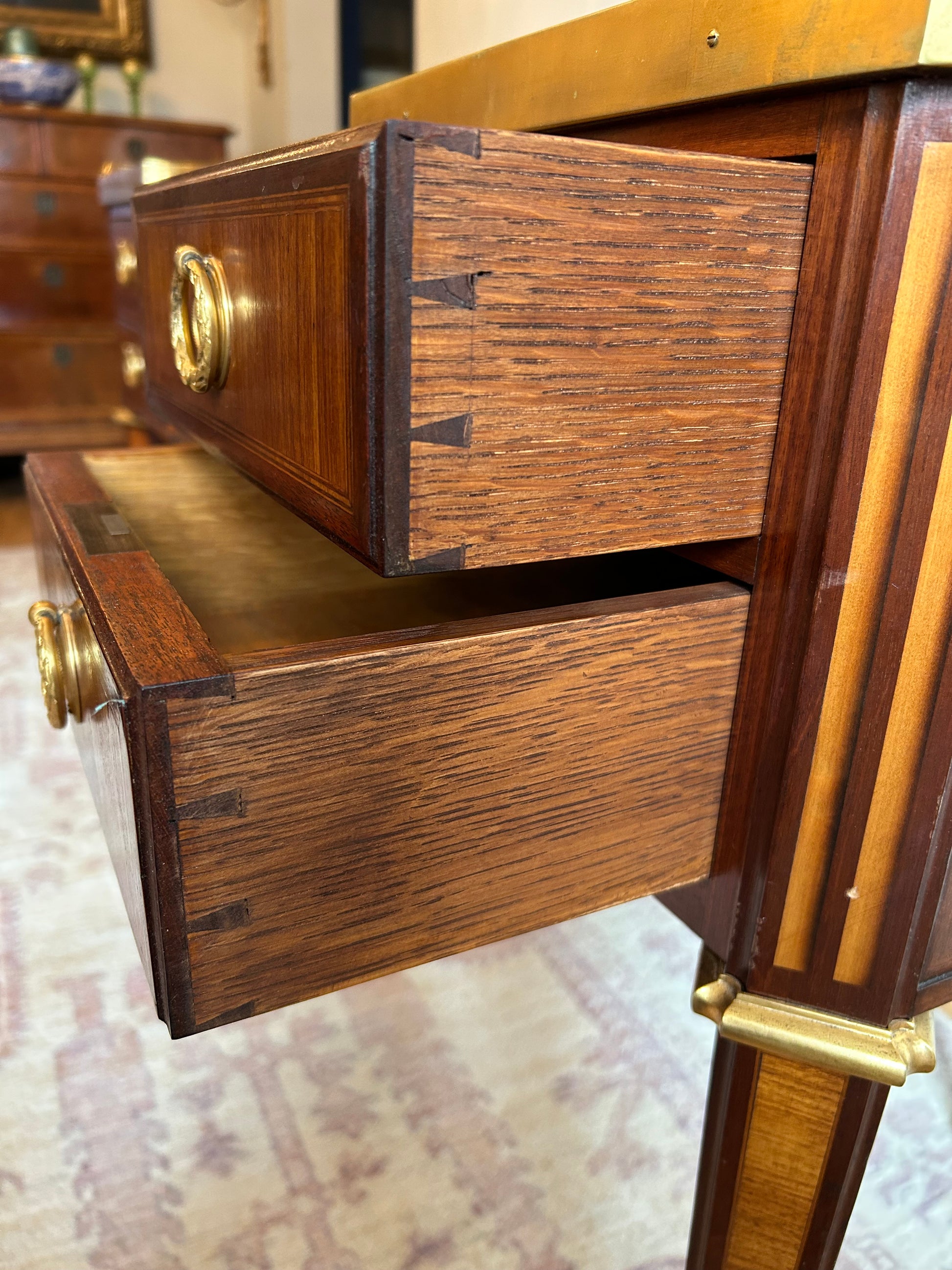Leather top has some cracks and losses and could benefit from professional restoration. The rest of the desk is in near perfect condition. Previous alteration to the legs on this desk which were elongated. This was extremely well done with matching veneers and is not noticeable except under close inspection. Structurally the desk is in fine condition.