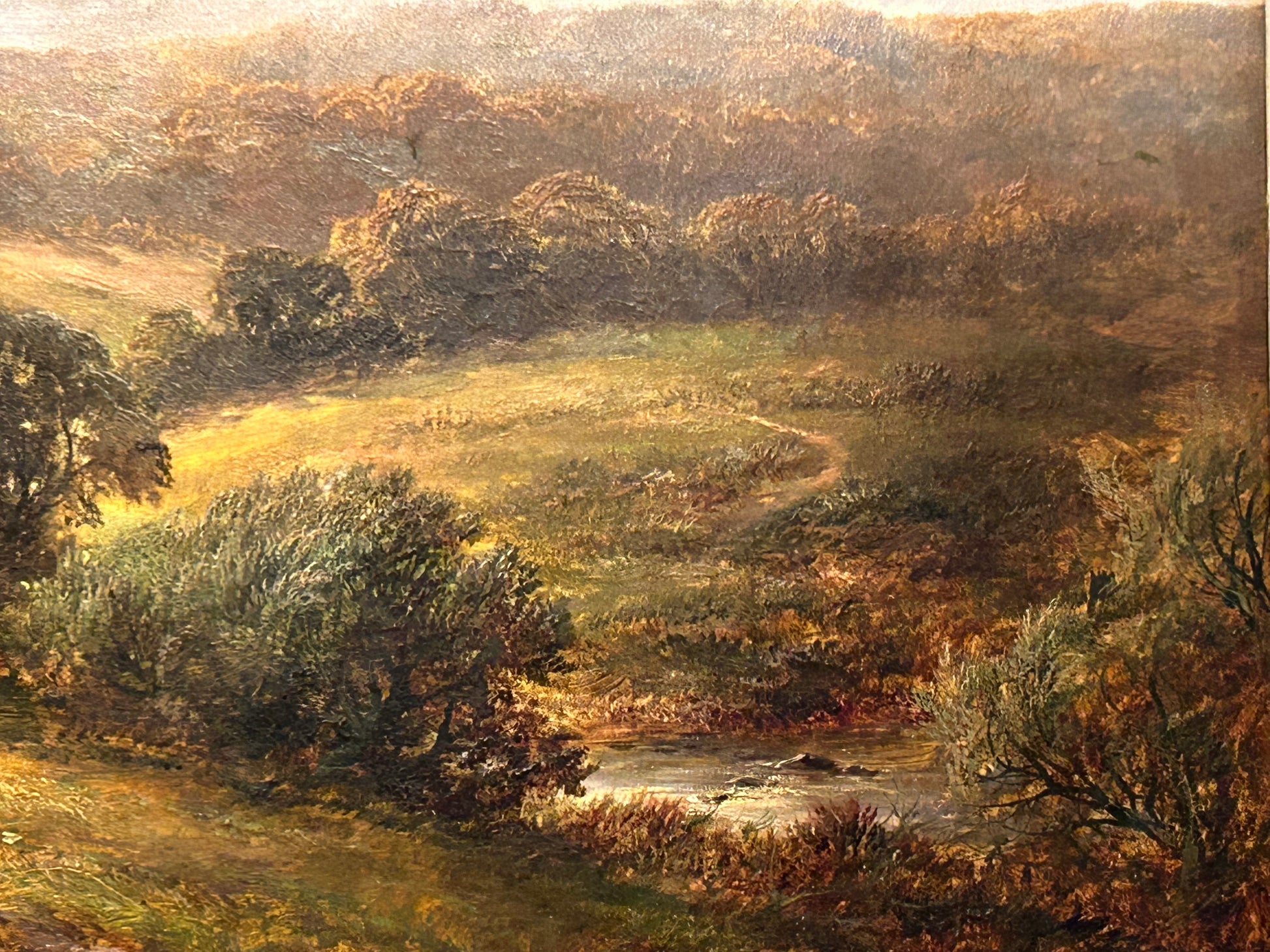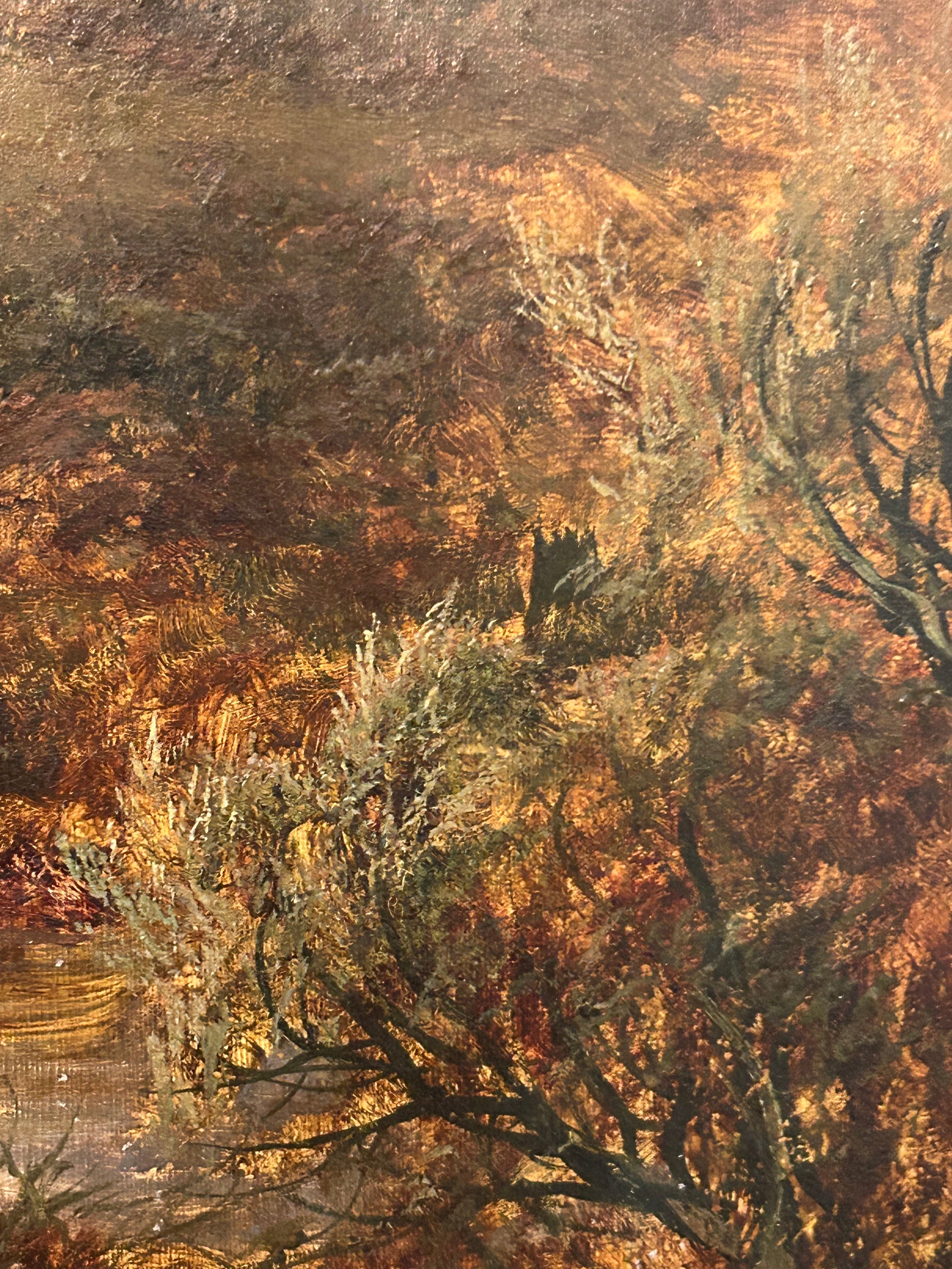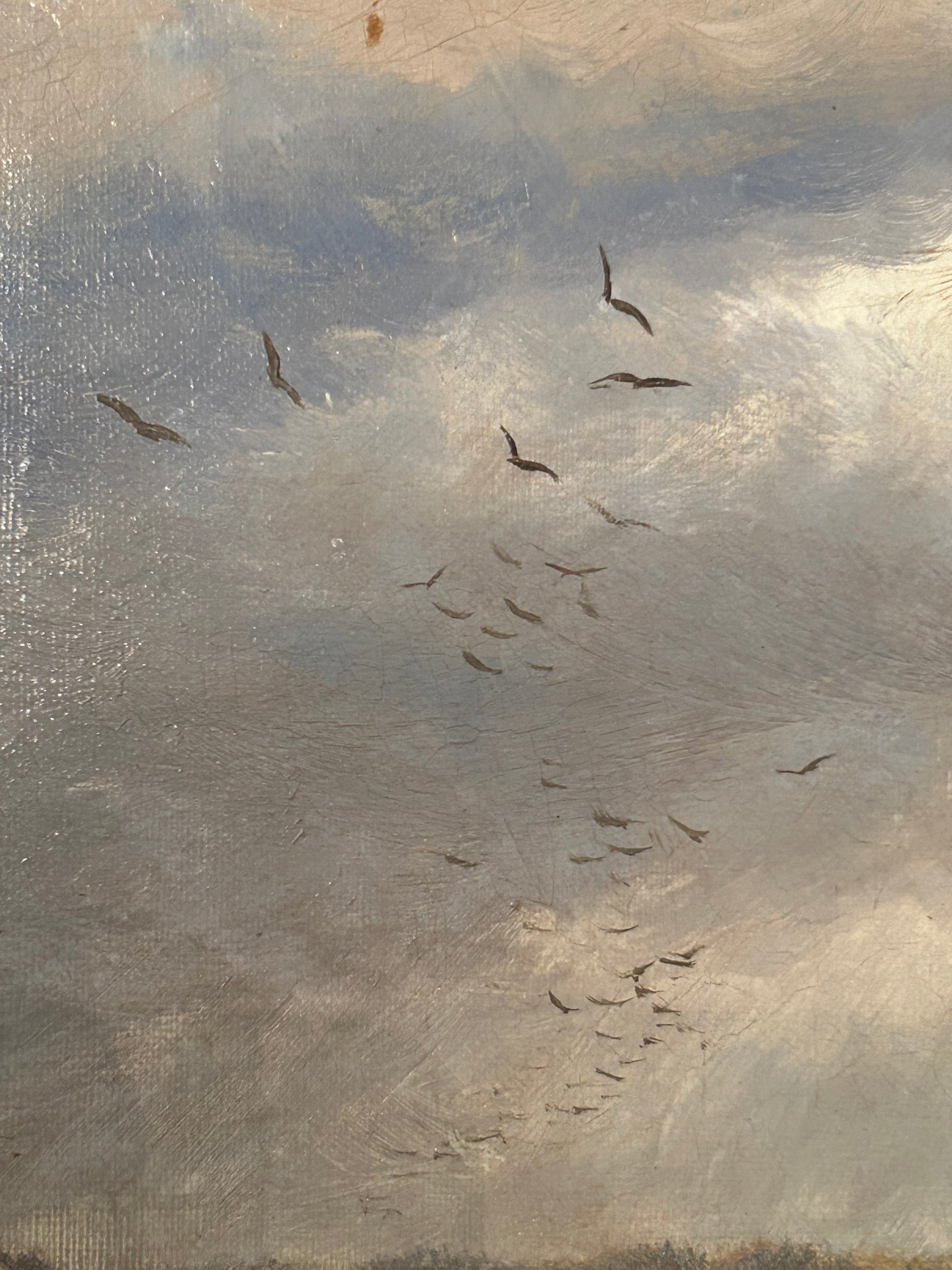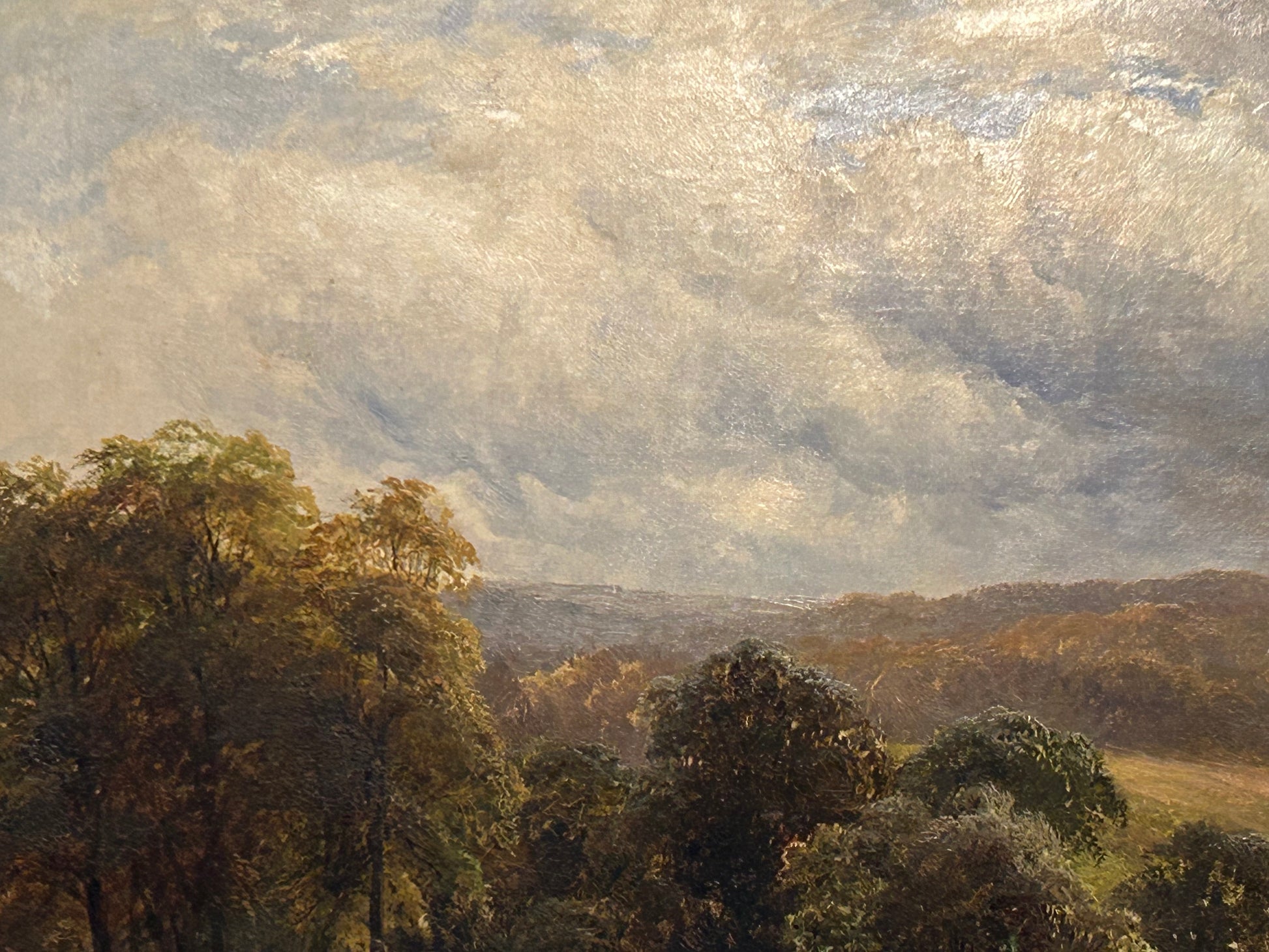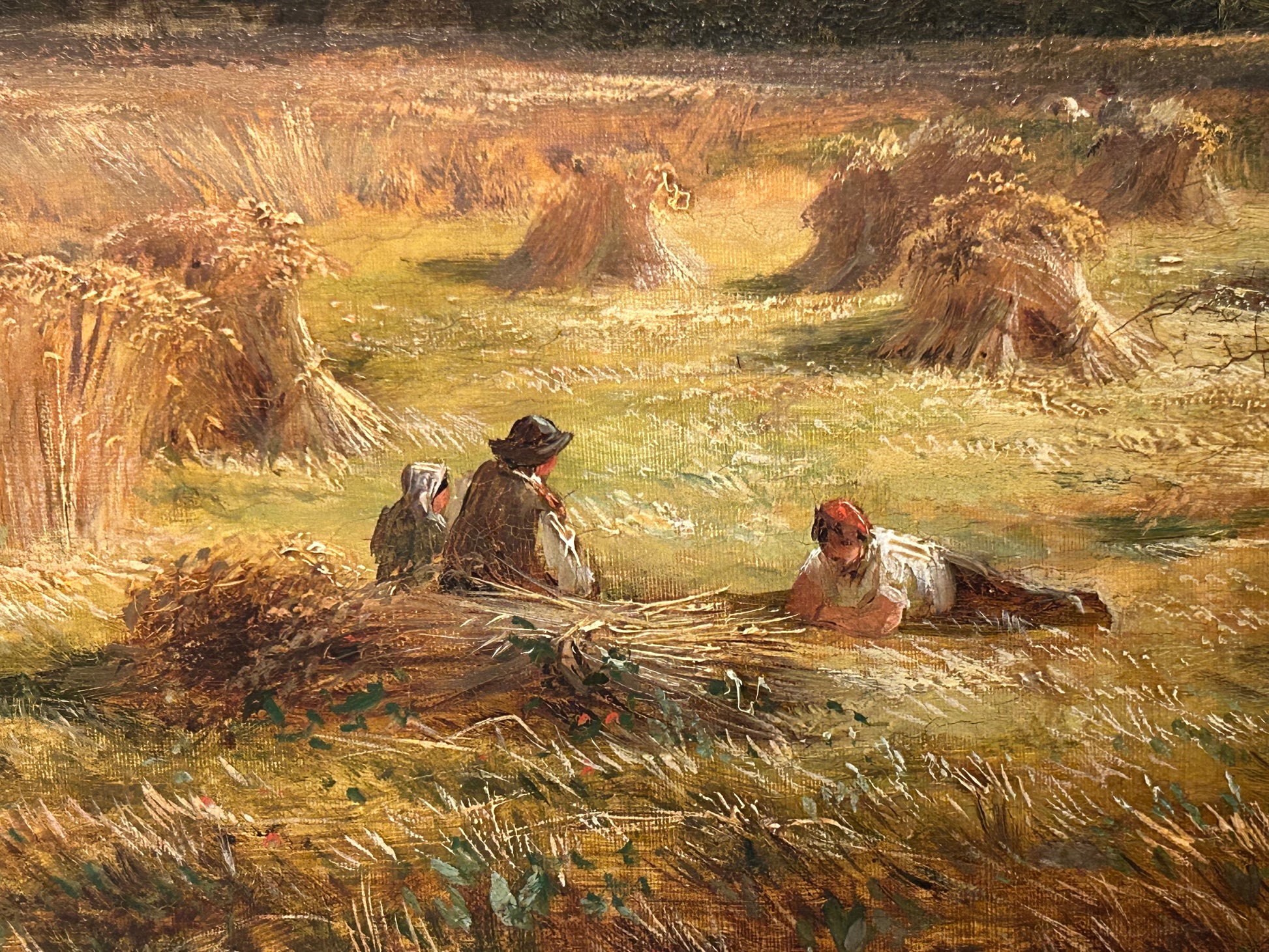 This is an incredibly evocative scene of harvesters resting on the soft, rolling hills of the English countryside, in the late afternoon sun. Photographs do not do justice to the stunning light of this painting, nor to the cloud formations in the sky above the hills with a flock of birds in the distance. The painting is both monumental and intimate, a sweeping vista that is also singularly English in feeling.