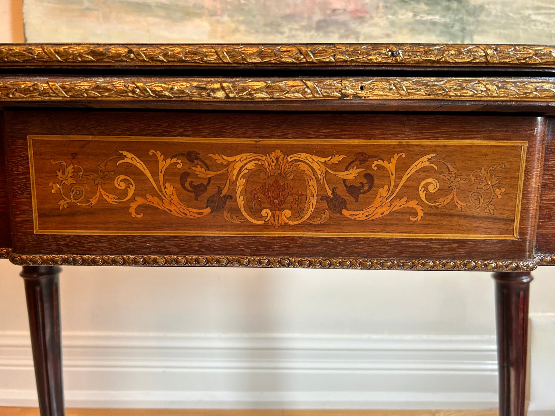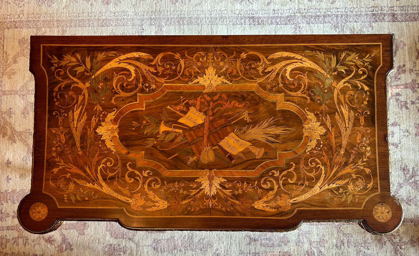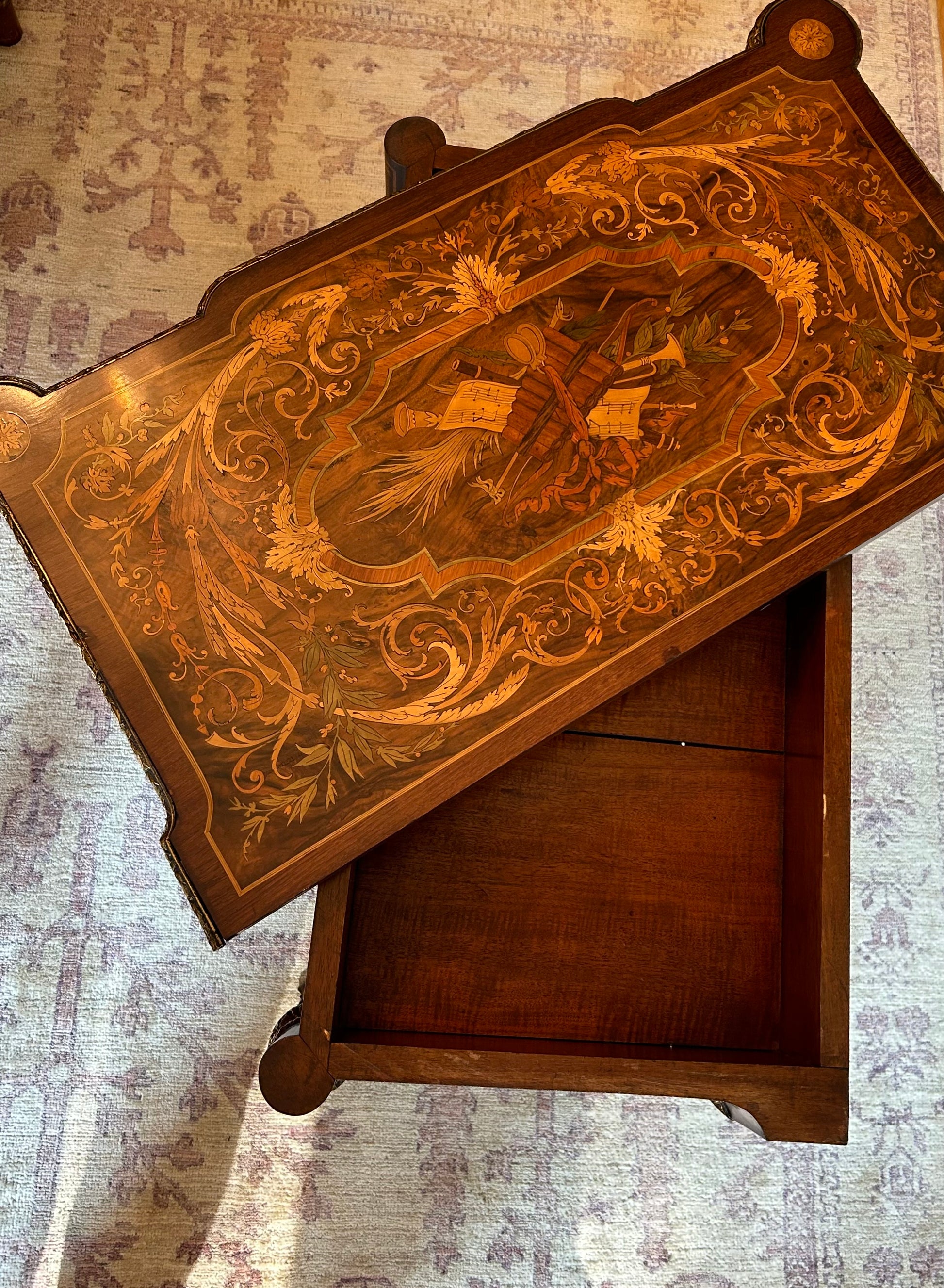 Most probably English, late nineteenth century or early 20th century. Superb marquetry on the table top with scrolls, flowers and vines surrounding a central medallion. The medallion features a number of musical instruments, including a flute, trumpet, castanets and sheet music. The apron also features marquetry with acanthus leaves, cornucopias and beautiful birds on the two front corner posts.