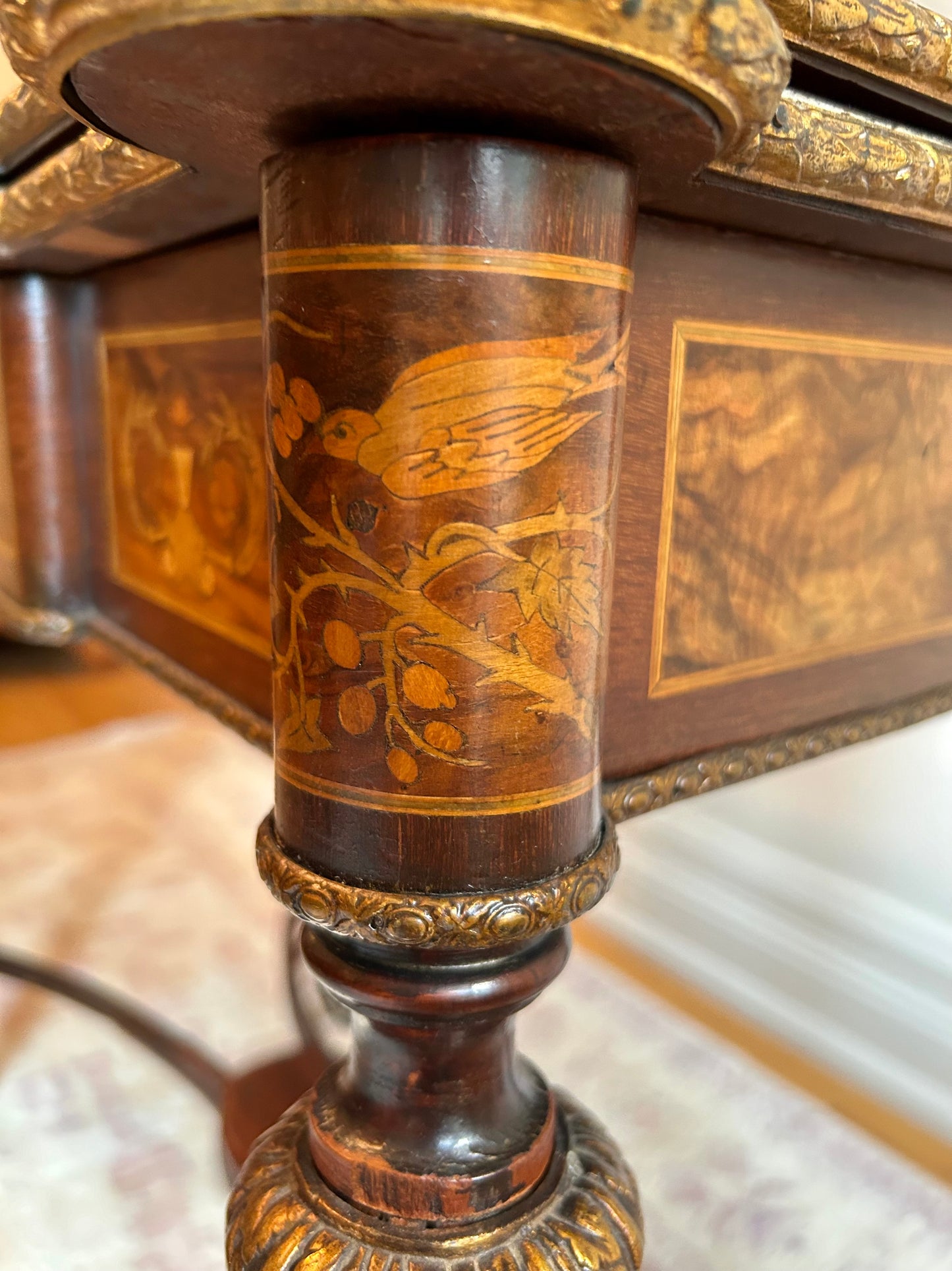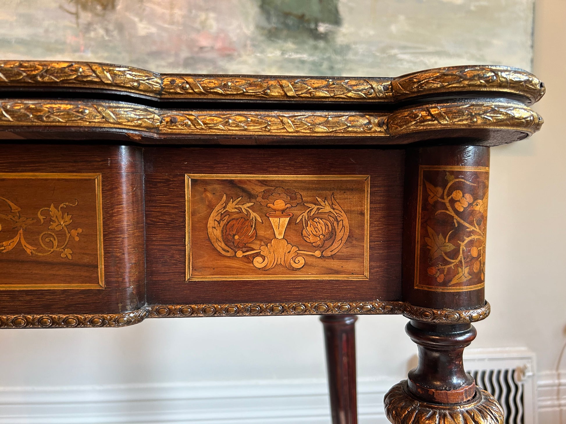 Table is in overall very good condition with no damage to the marquetry. The felted surface is faded and has some tears and needs restoration. One bronze mount has come slightly loose. Tiny nicks to one of the legs and the inside of the table. Some wobbling, but not due to any structural defect. This table works best as a side table, and would look stunning in any room.