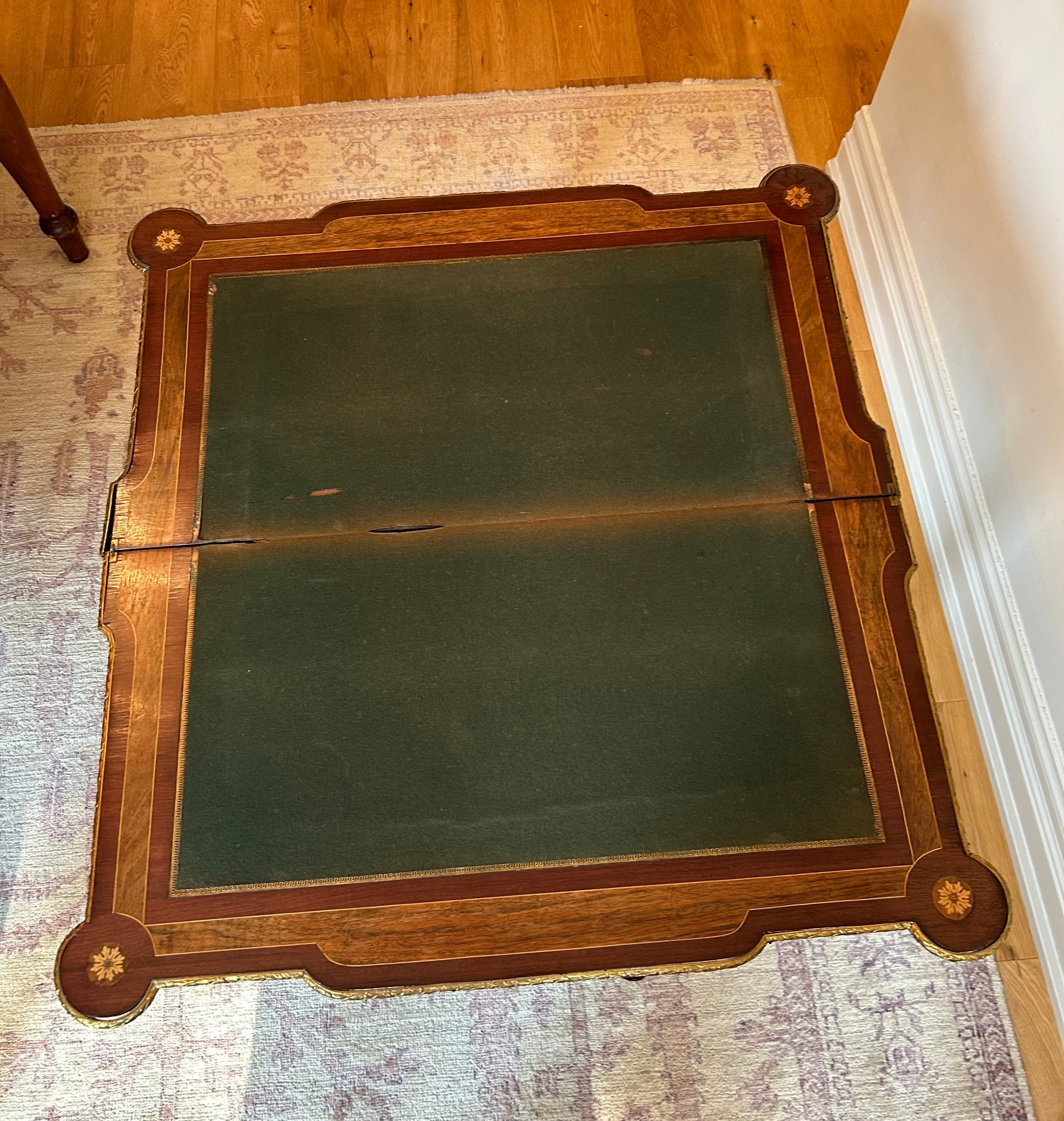 This is a stunning Napoleon III Style, Gilt Bronze Mounted Mahogany and Marquetry table, with a flip top that turns it into a games table with compartment inside.