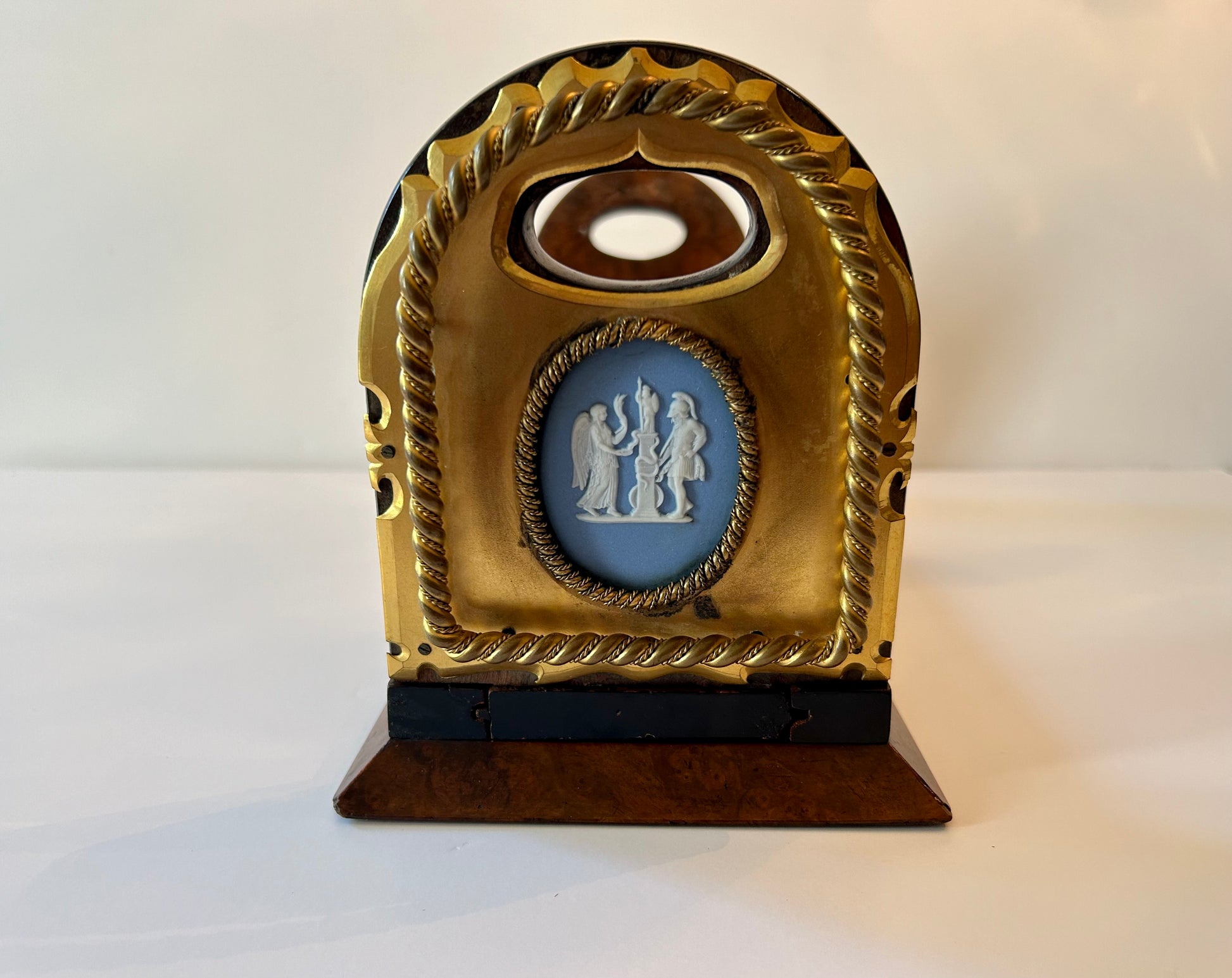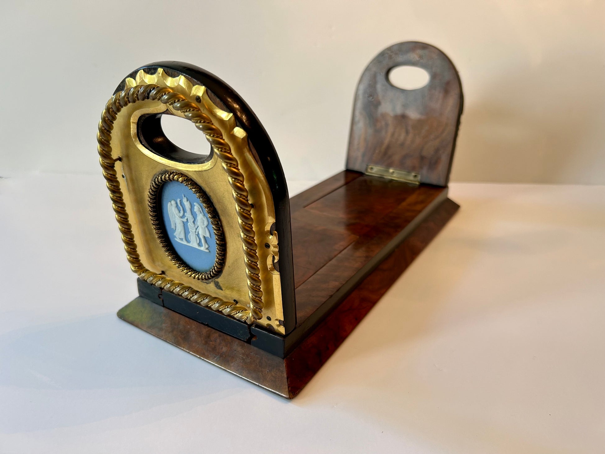 A lovely and very unusual expandable bookshelf, made of burled walnut with brass end plates featuring two Wedgwood Jasperware medallions. The end plates fold down when not in use, and the bookshelf expands easily to accommodate the number of books. Accompanied by a matching brass inkwell featuring more Jasperware along the bowl and a medallion on the lid.