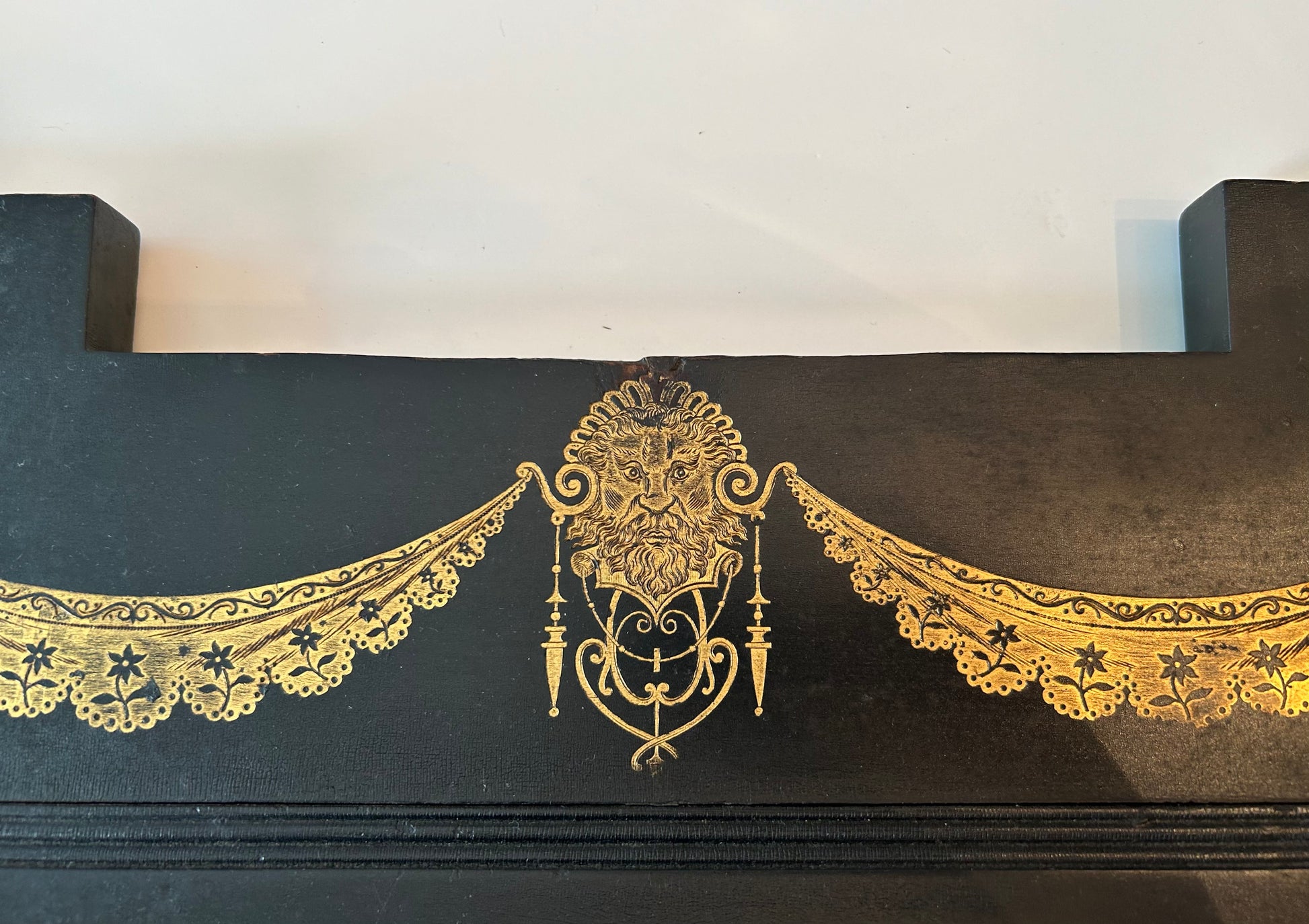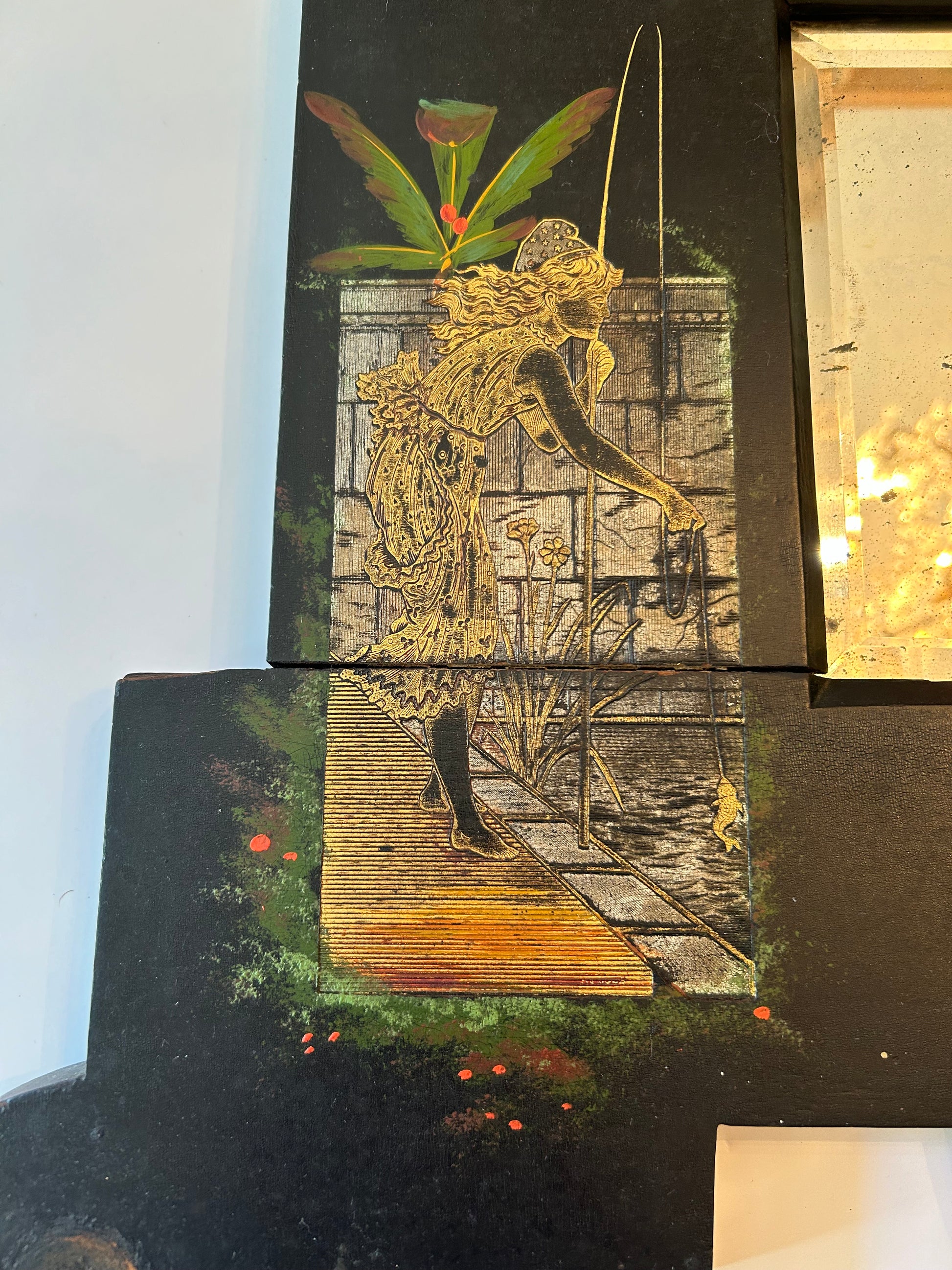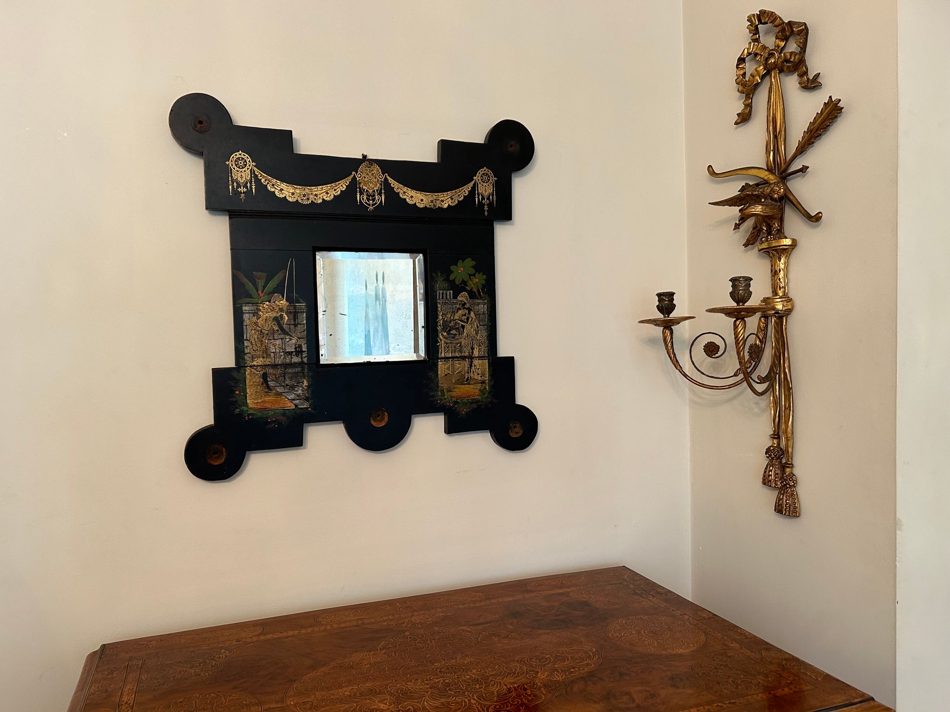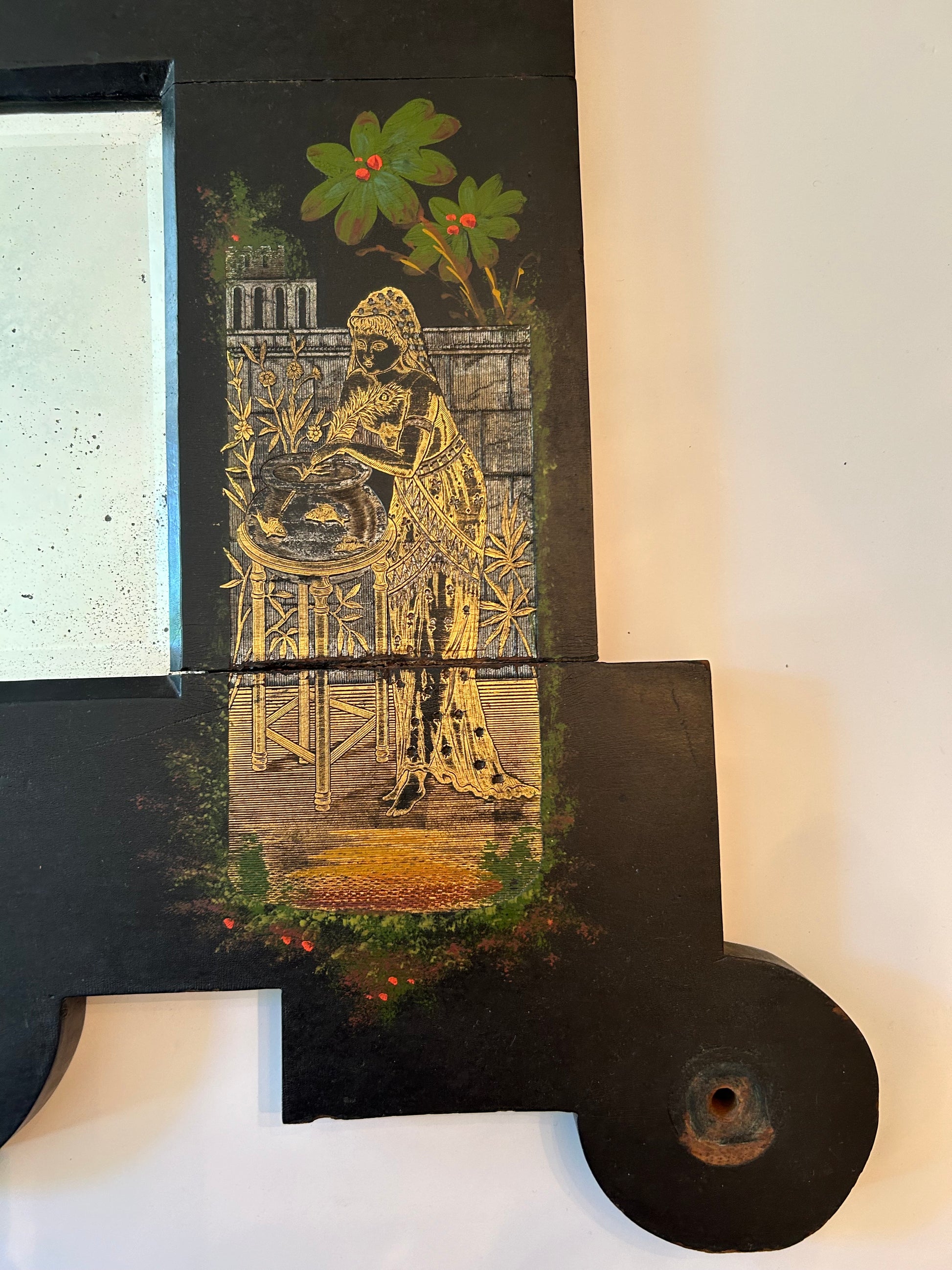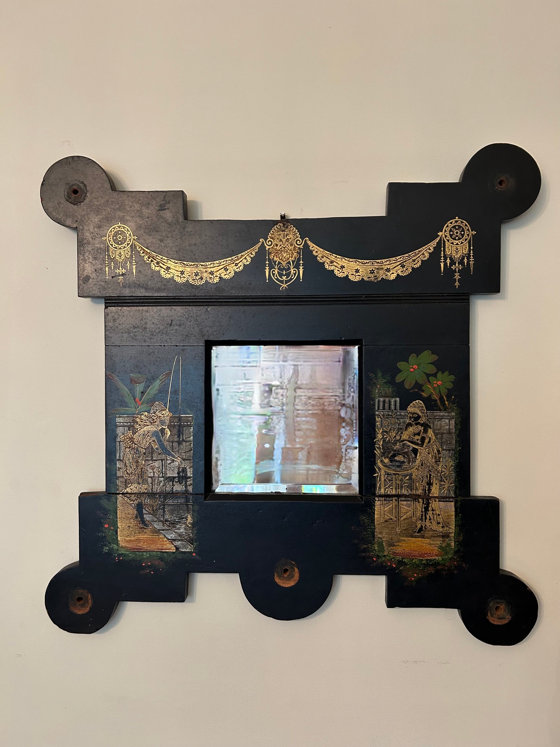 This is a fabulous aesthetic movement mirror from the late 19th century, probably English. The frame is ebonized and decorated with incised, hand-painted and gilded decorations featuring floral swags and a lion mask on the top, and a lovely maiden on either side of the glass. The mirror glass is 7.5 inches square and bevelled, and has wonderful patina. There are five visible boreholes around the perimeter of the frame which would have held coat hooks that are now absent.