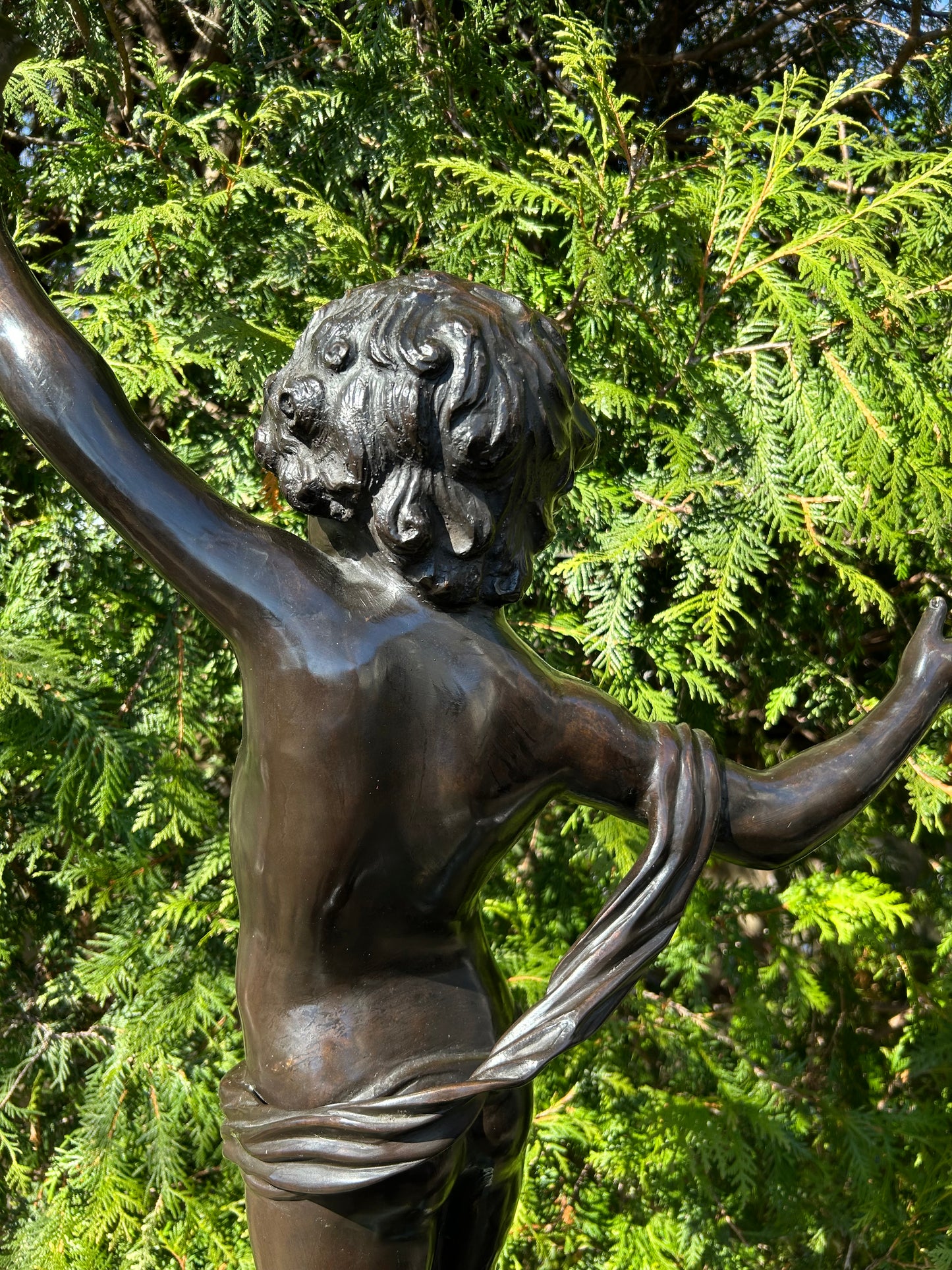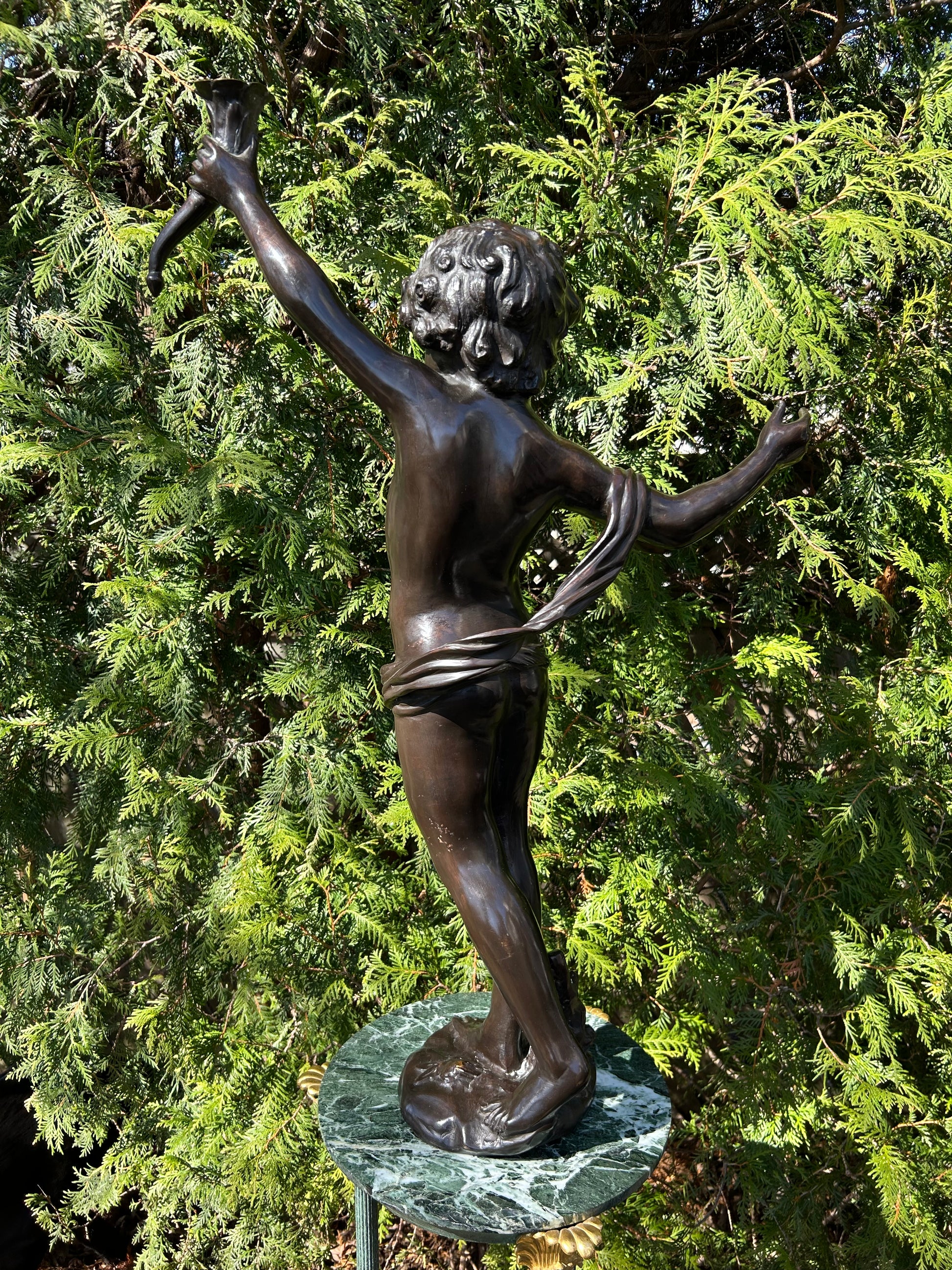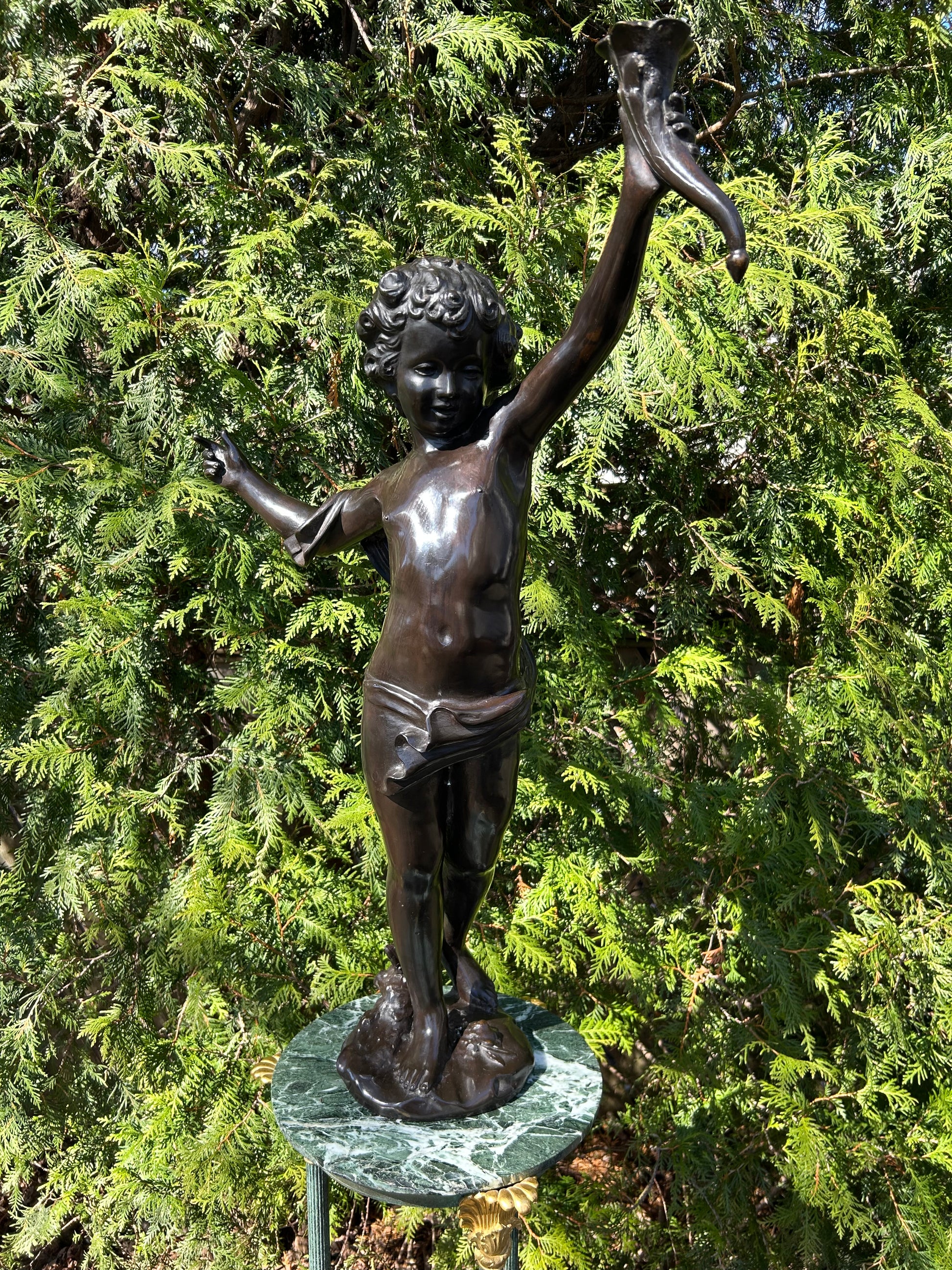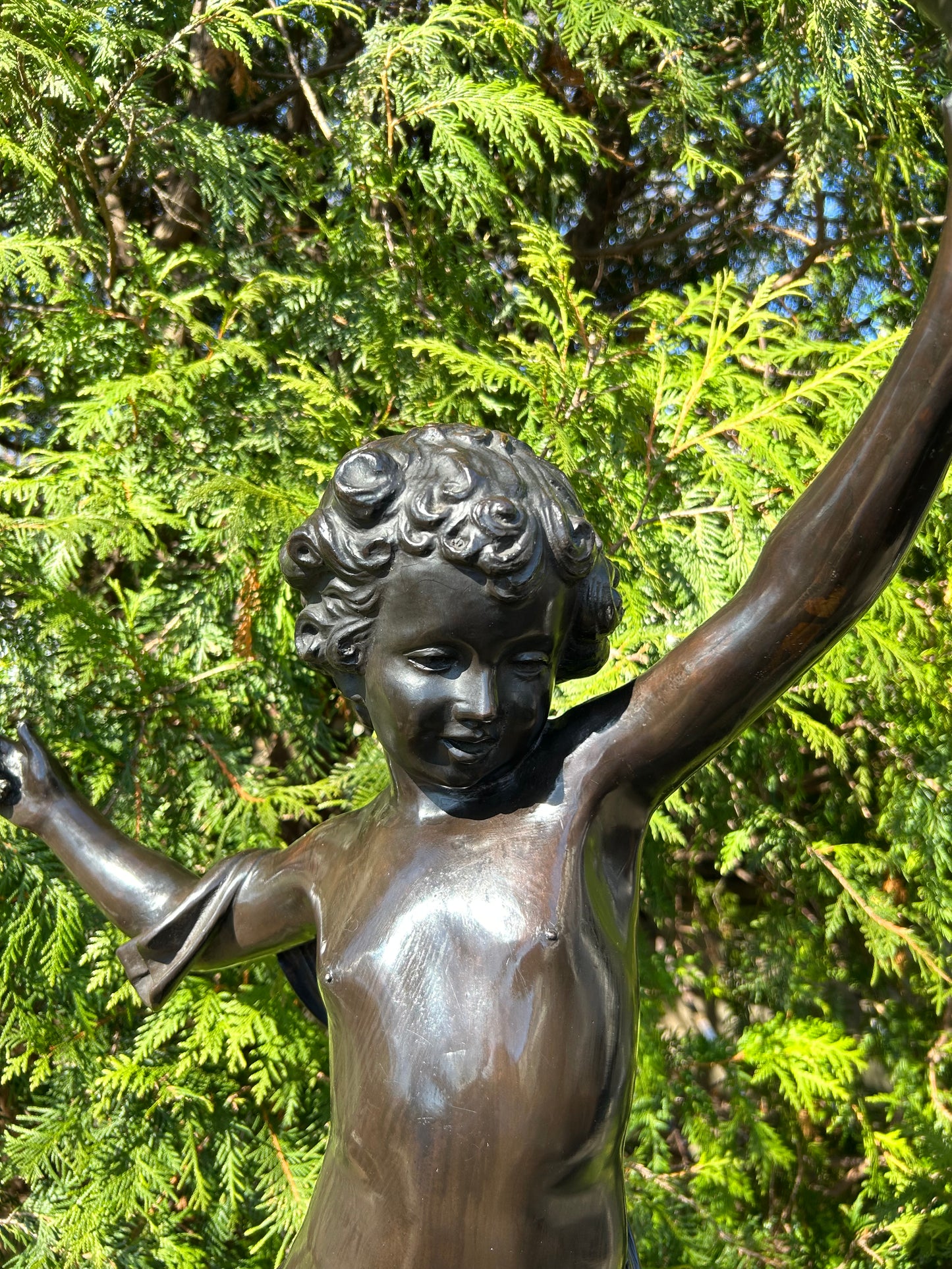 A stunning sculpture of a cherub holding a cornucopia, after Auguste Moreau. French, early 20th century. At 35" high, this is a beautifully substantial bronze in excellent condition. The cherub stands with one arm raised and the other outstretched, as a swirl of fabric drapes along his back. He wears a tender expression and has a lovely head of curls.