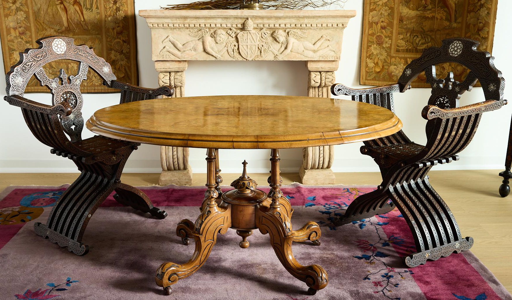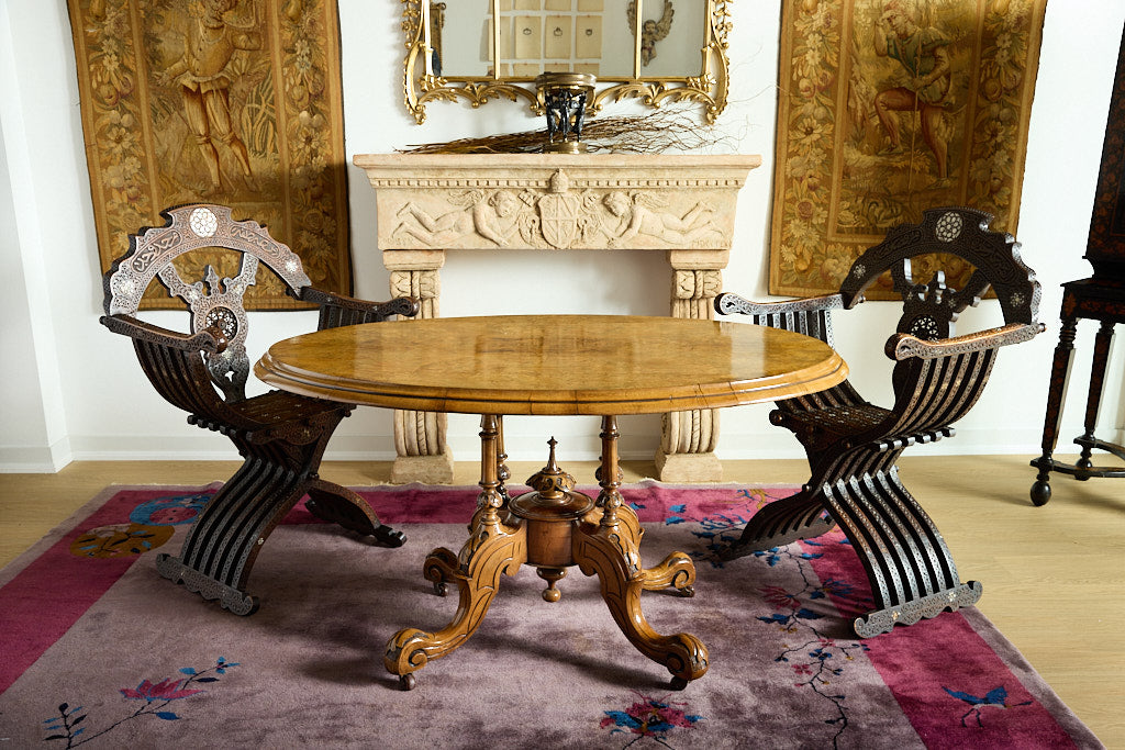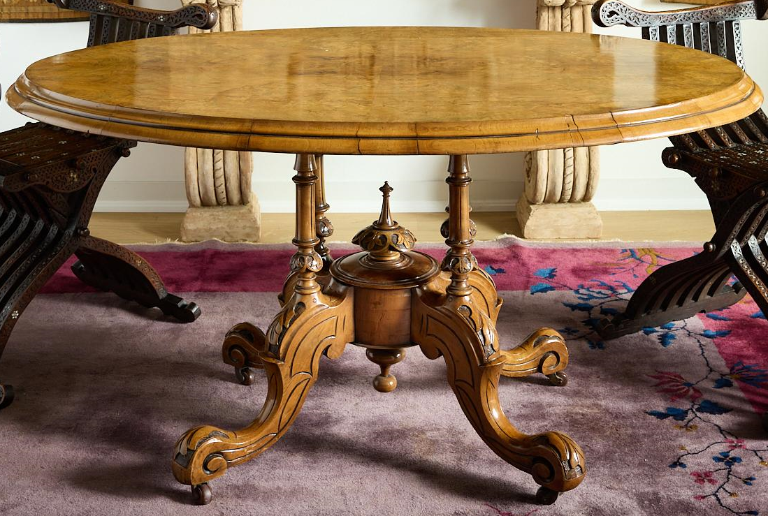 Pedestal form raised on casters, with lovely carved details on the pedestal and collapsible mechanism.