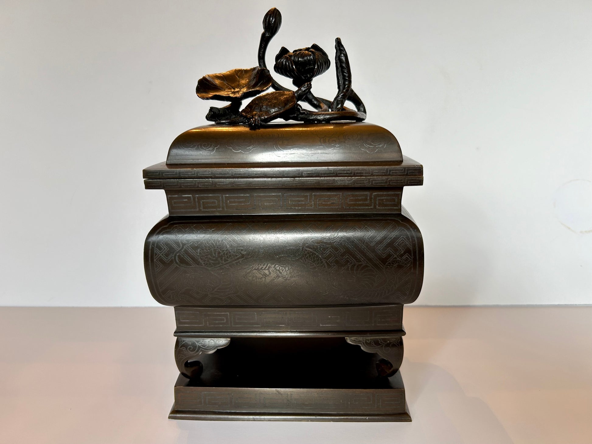 This is a wonderful Chinese, silver inlaid, solid Bronze incense burner from the late 19th century or early 20th century.
