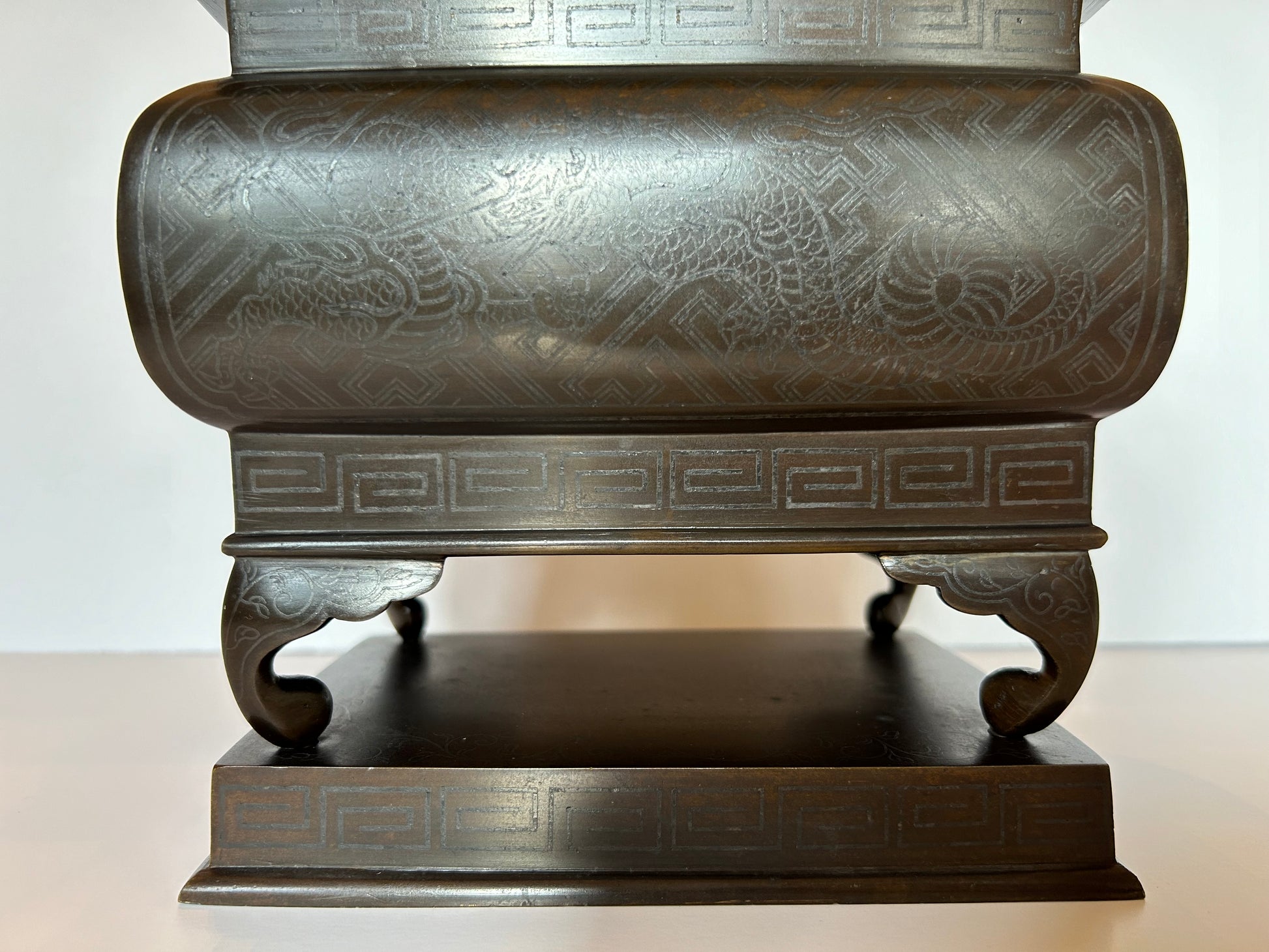The main body of the piece is intricately inlaid with geometric designs and a dancing dragon, the whole resting on C-shaped feet.