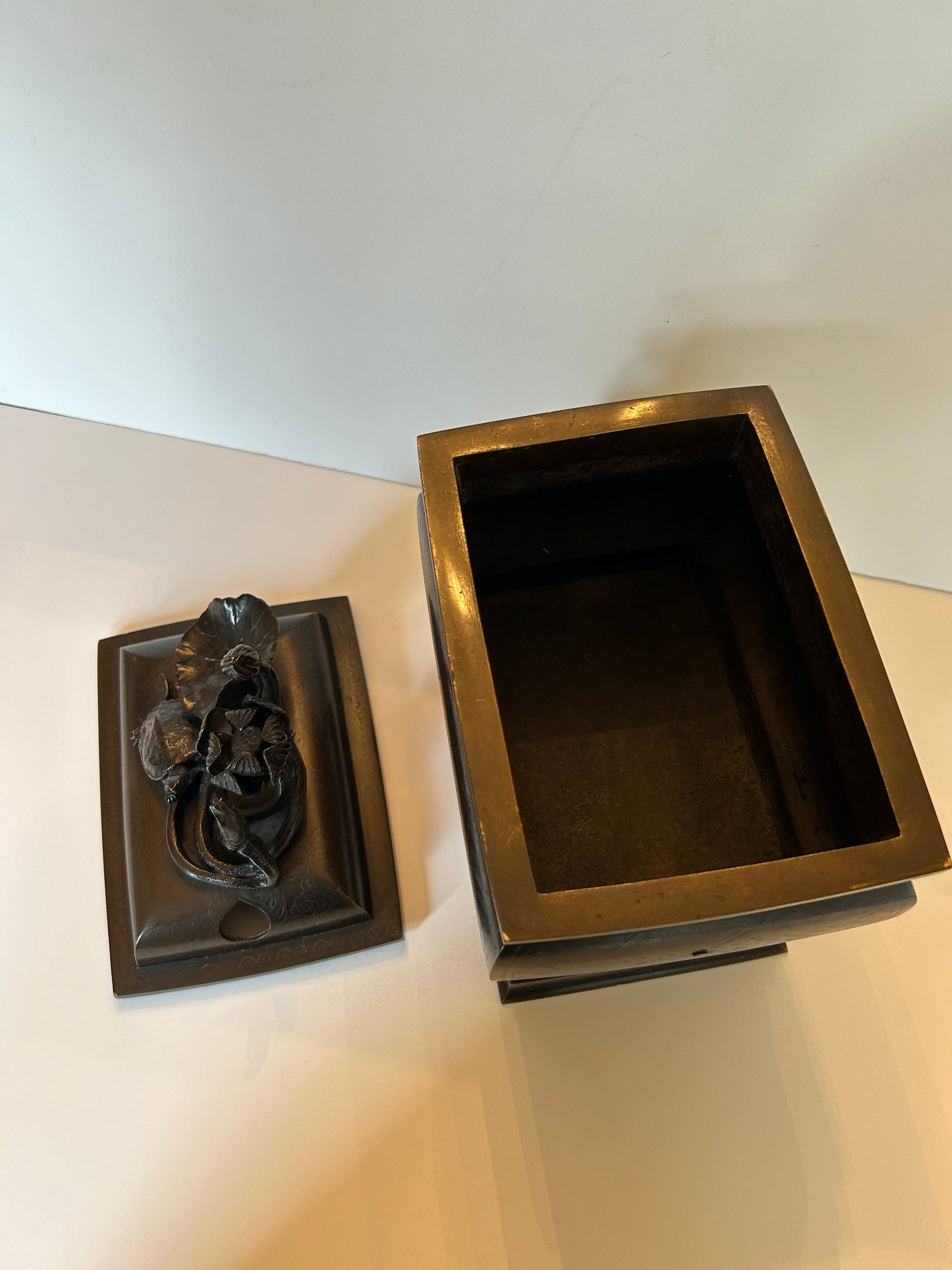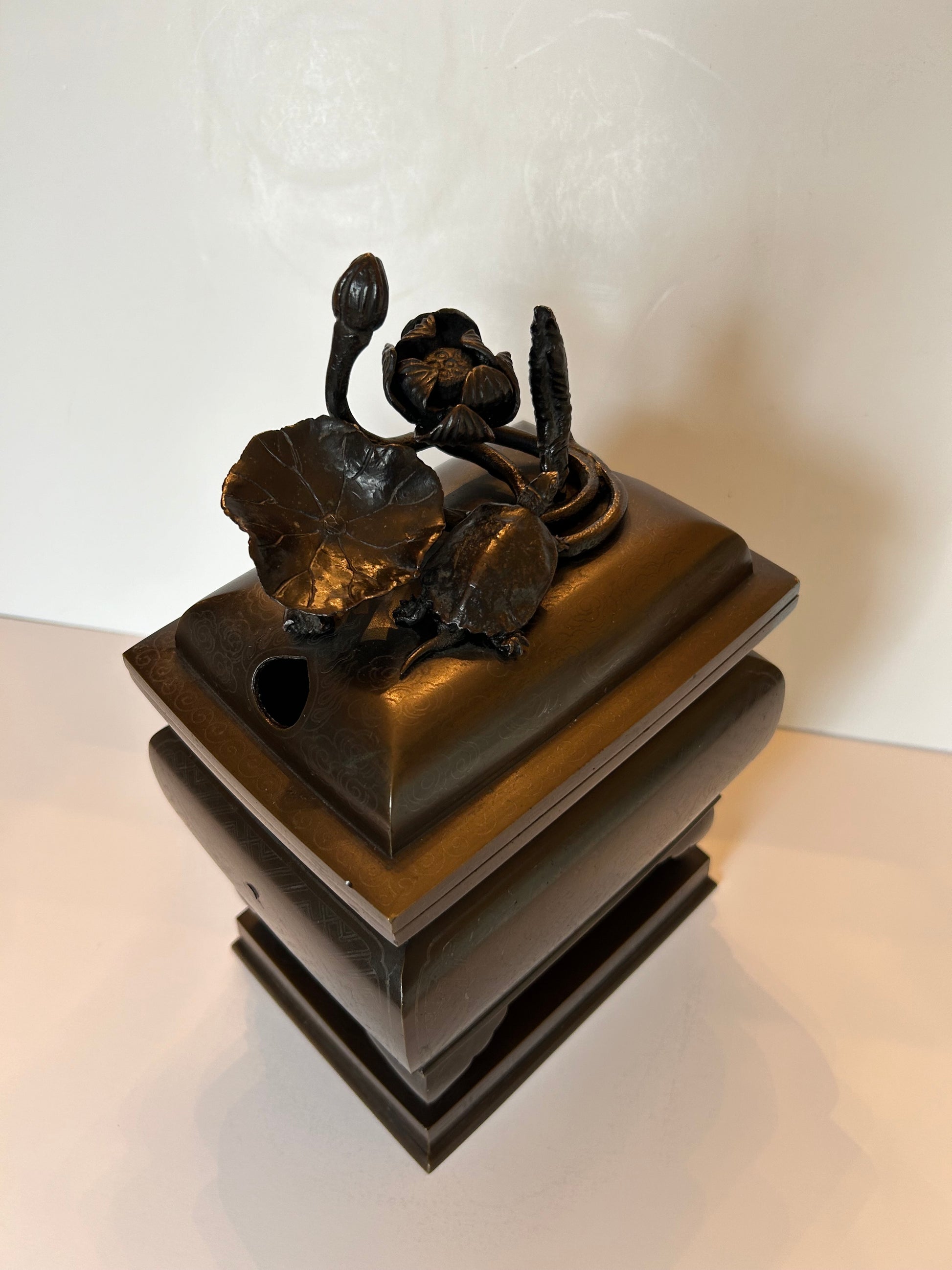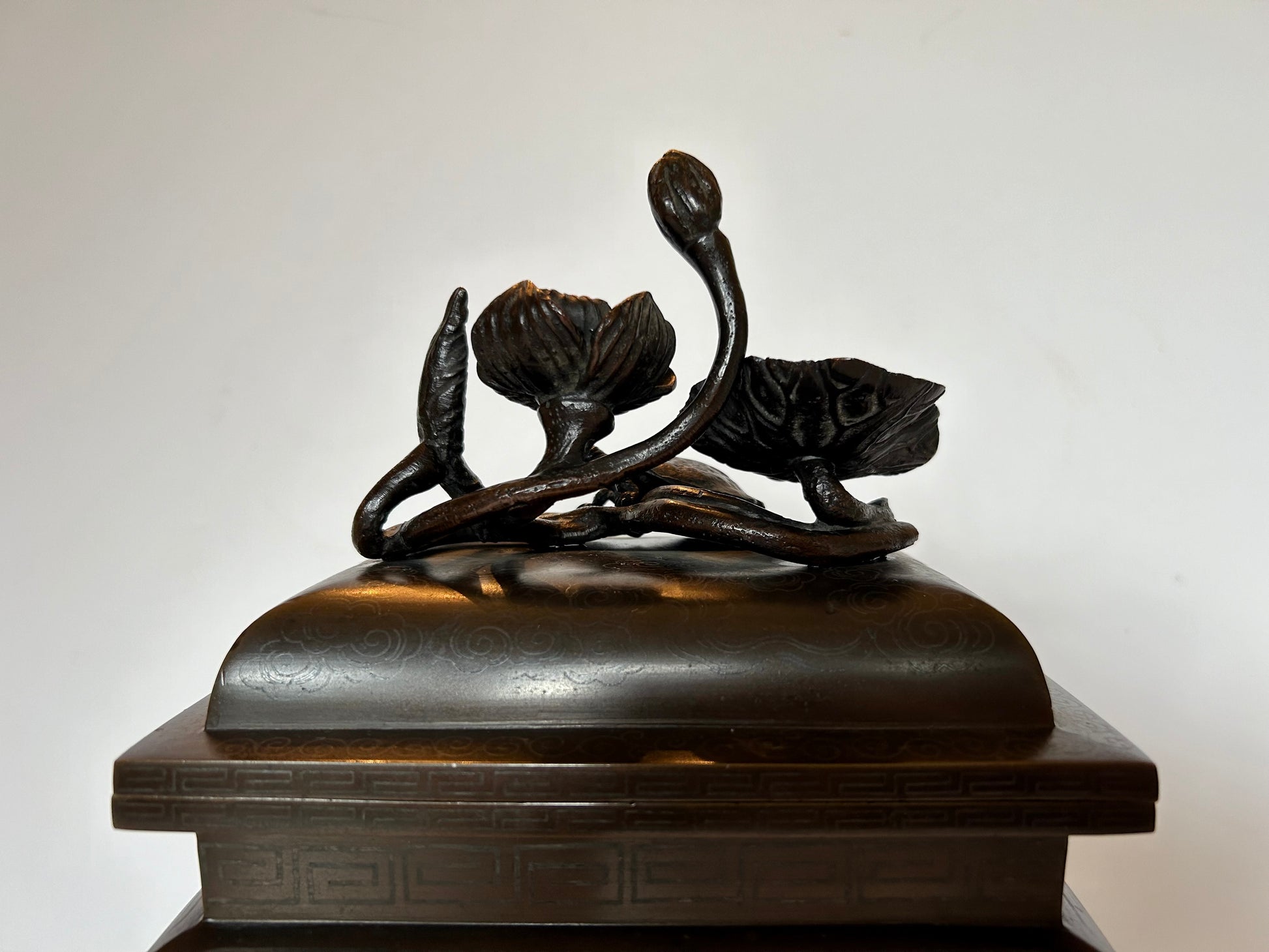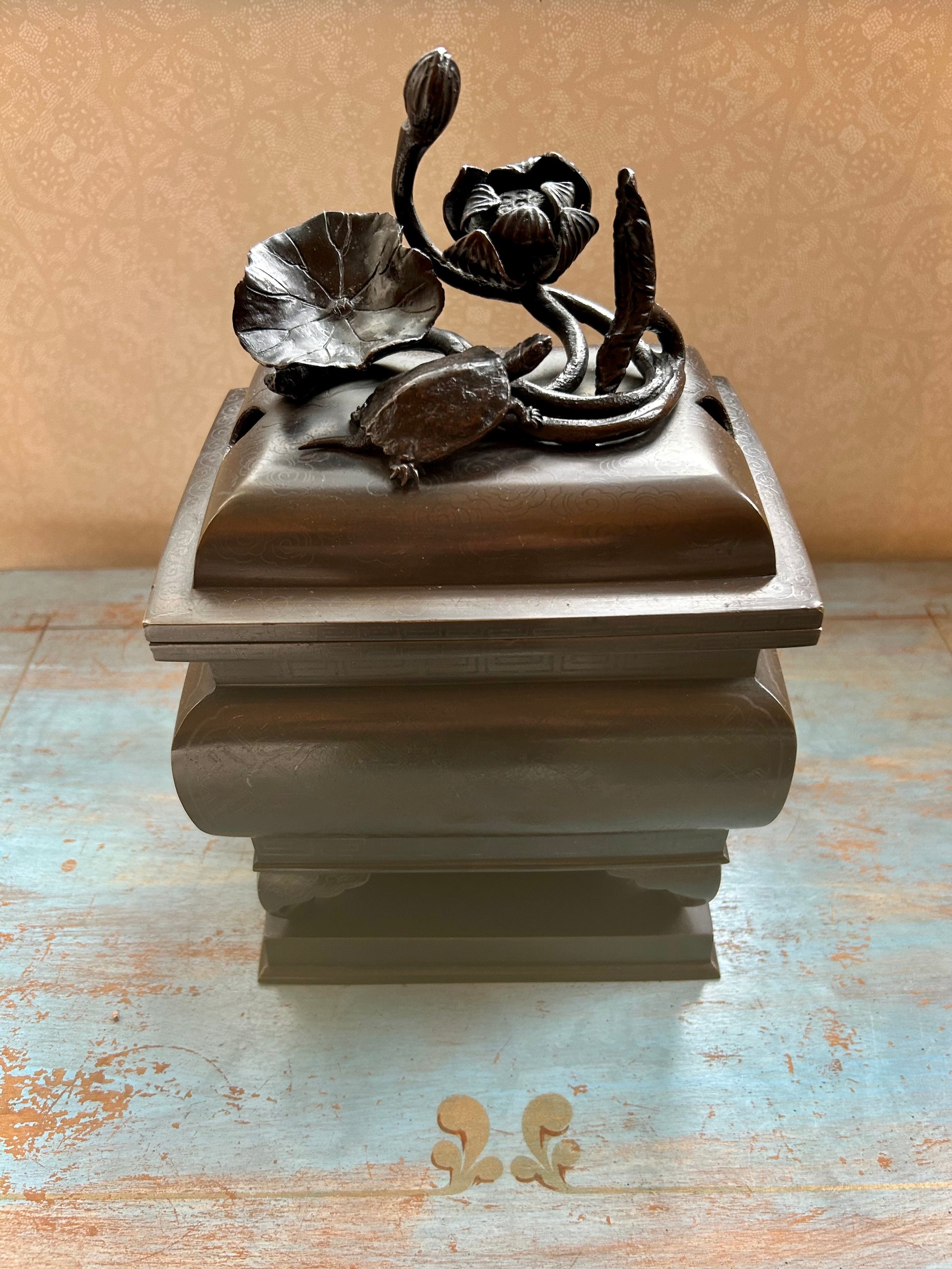 The removable lid features beautiful modelling of a small turtle climbing over lily pads whose flowers are about to burst into bloom. Below the flowers the lid is inlaid in swirling motifs of water and flowers.