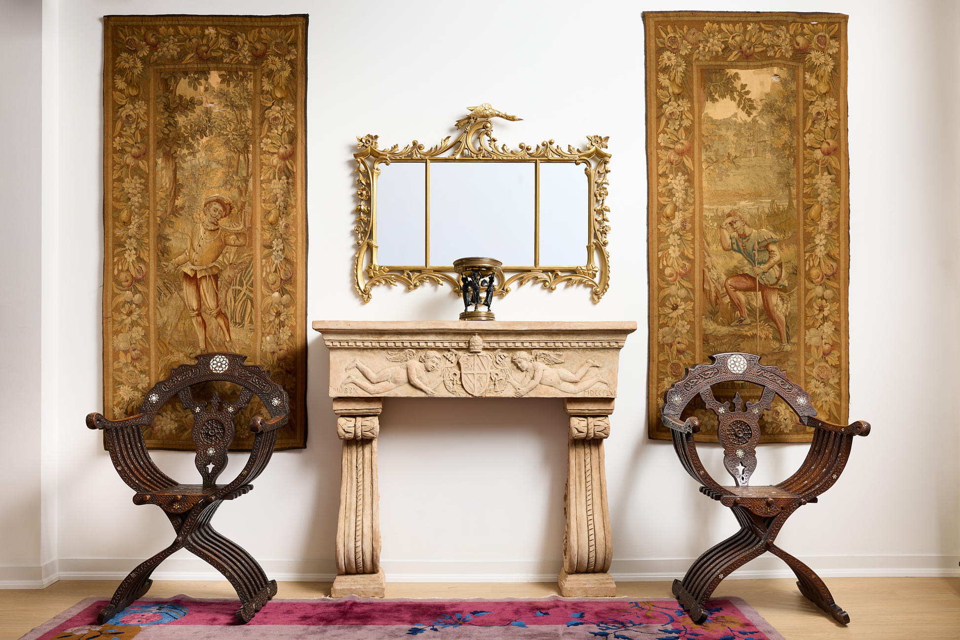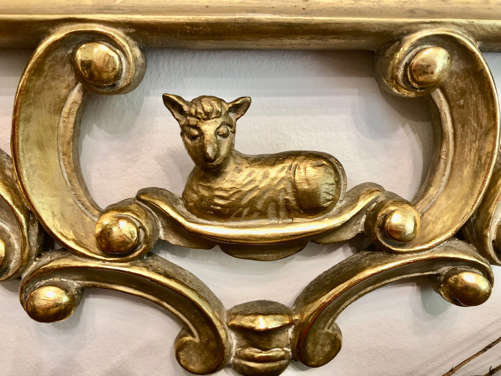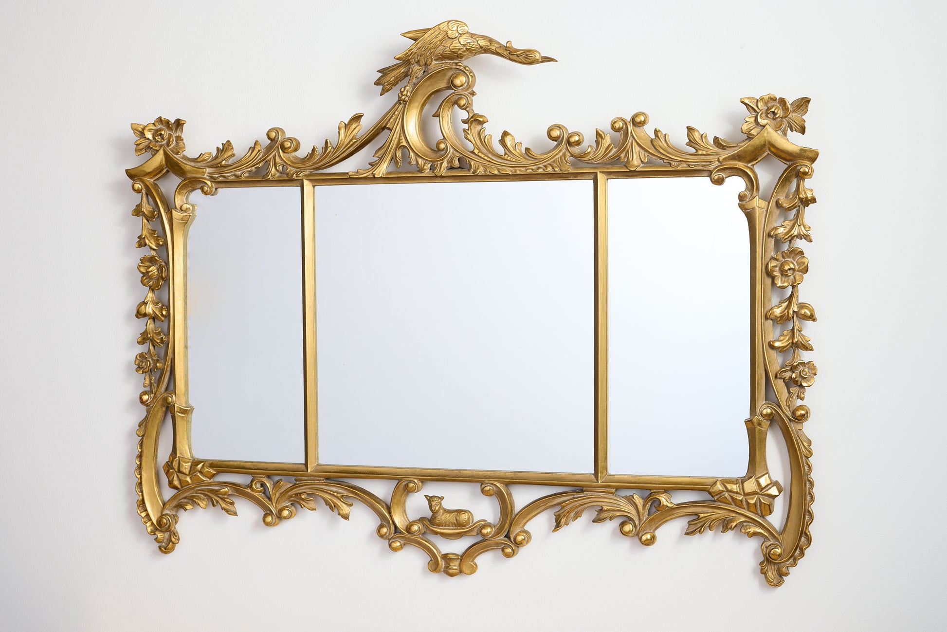 Three-panelled mirror set within a carved gilt wood frame with foliate details, C-scrolls, and surmounted with a bird.