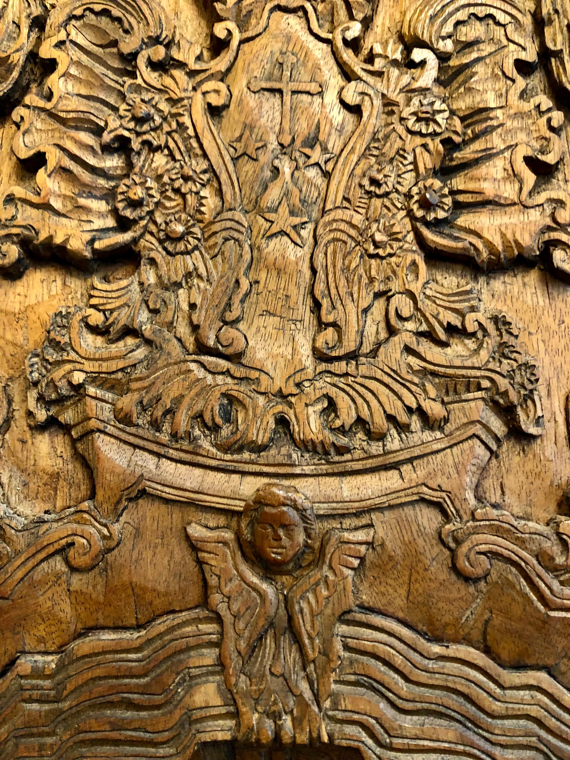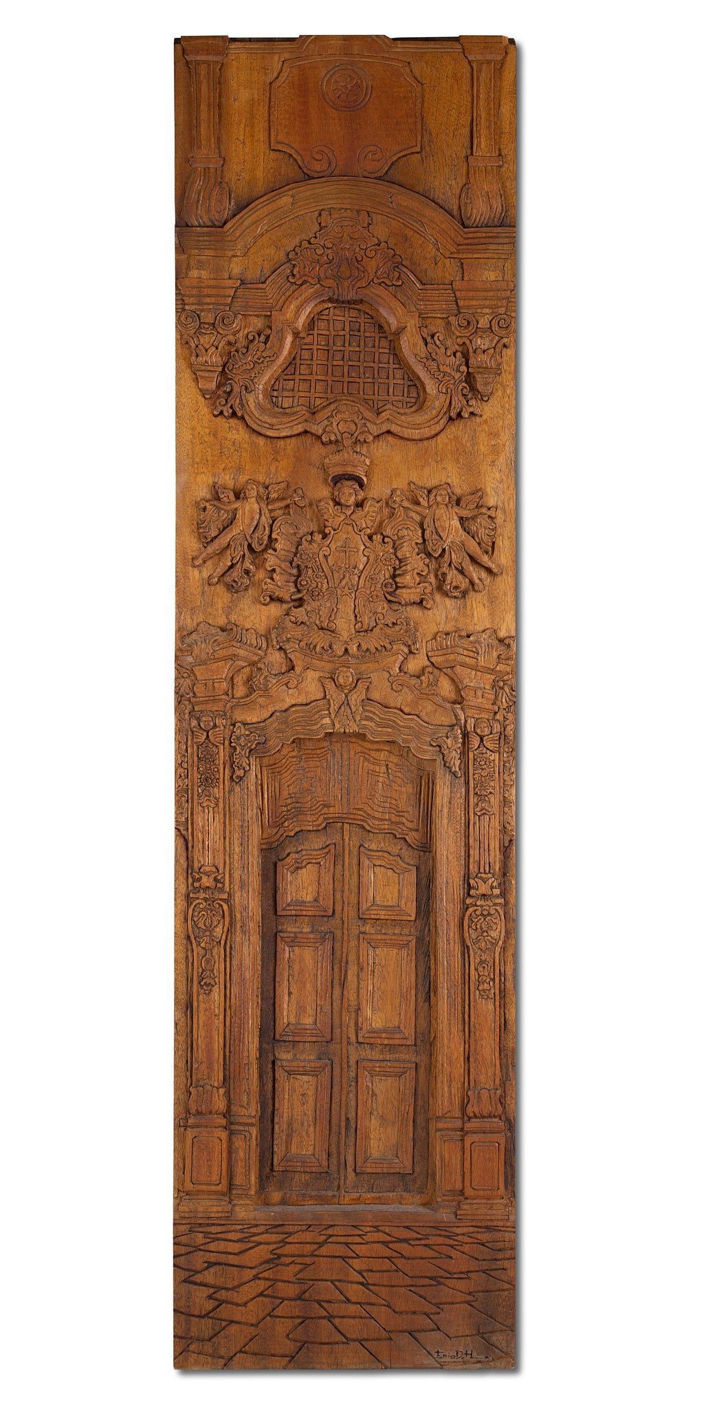 A decorative, classical carved oak panel with very intricate detail, depicting the facade of a church: a panelled doorway with fanciful columns on either side, surmounted by carved angels, scrolls and elaborate pediments. The bottom of the panel depicts a wonderful cobblestoned pavement in perspective.
