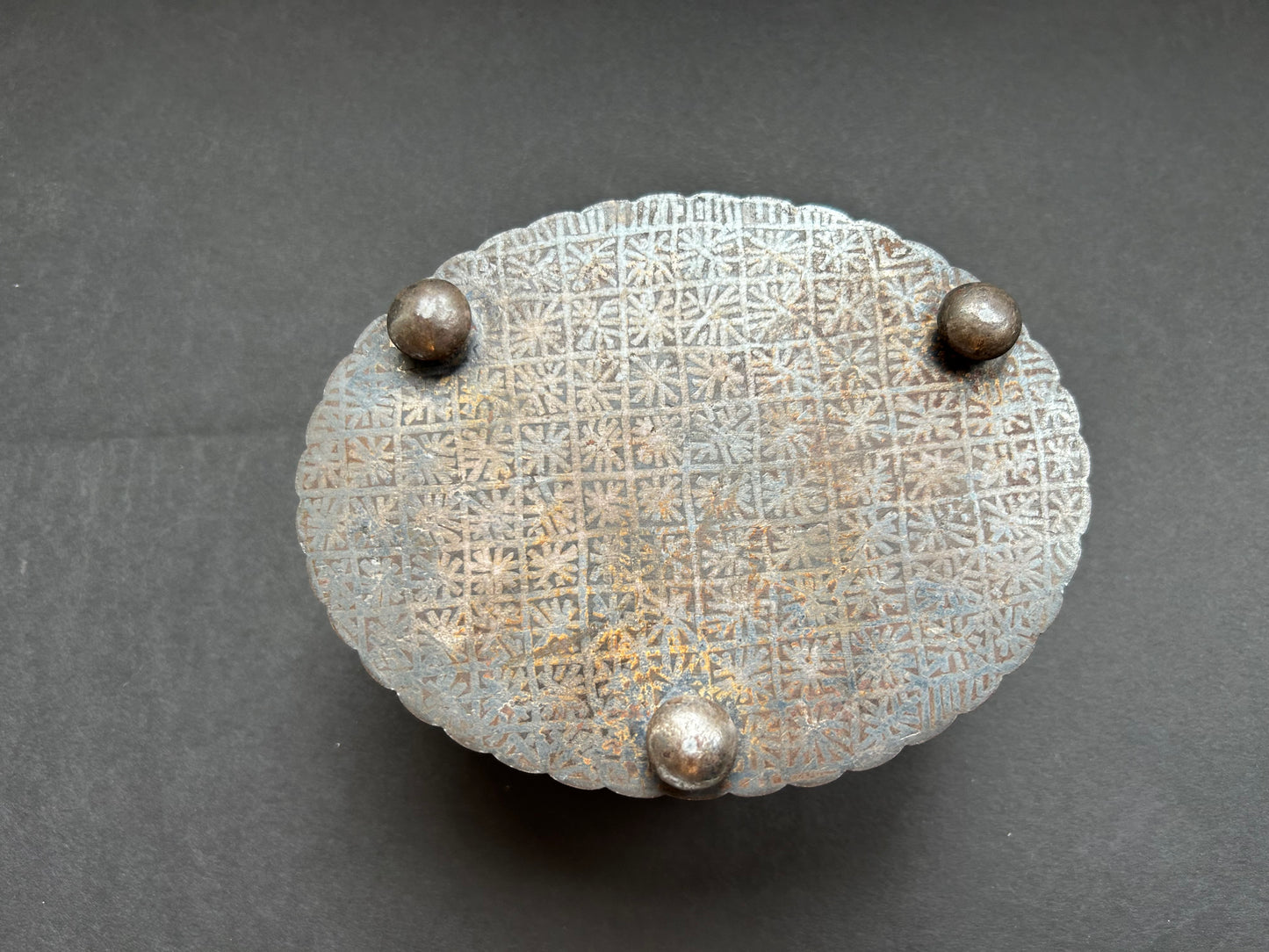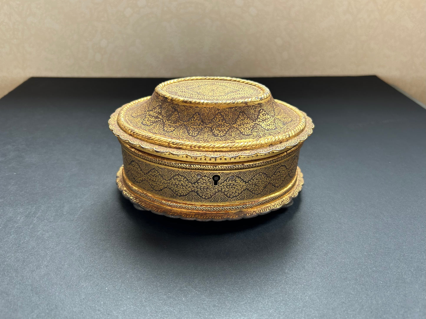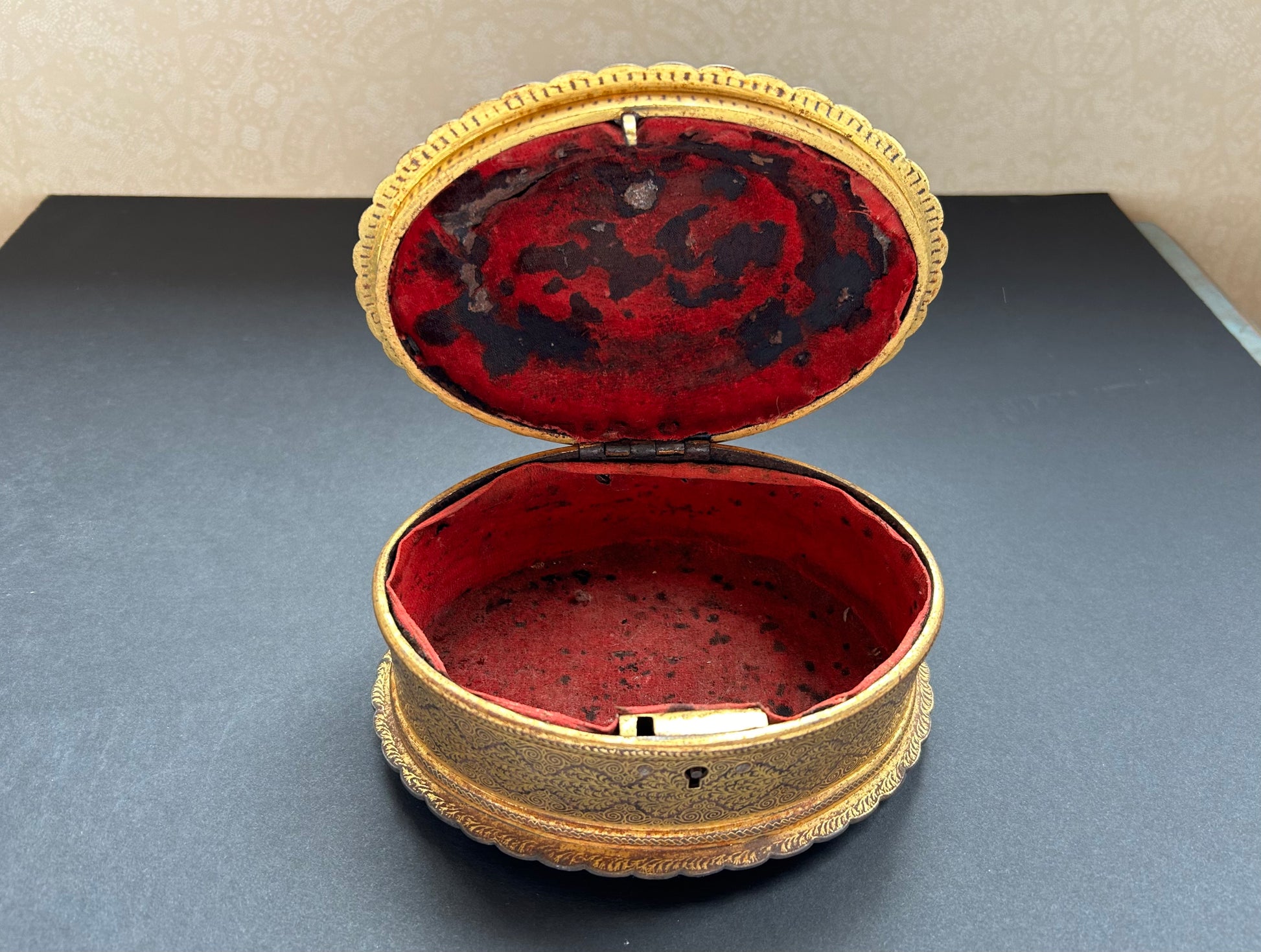 An exquisite Indian Koftgari work box, or jewelry box, circa 1900, in oval shape. Featuring very fine, gold thread decoration with three silvered bun feet and a silvered base. The lid opens to reveal a worn, red velvet interior, typical of luxury items of the period.