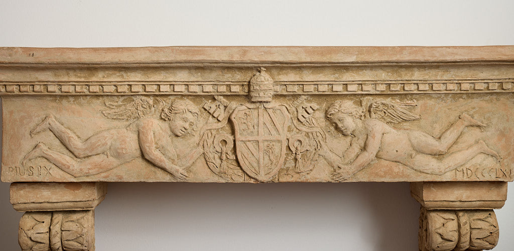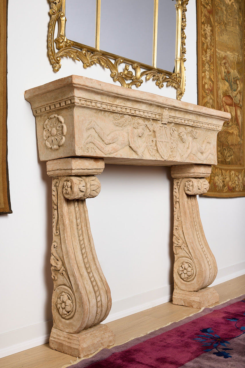 Incredible detail in an unusual material. Carving to all sides. This mantle comes in three separate pieces.