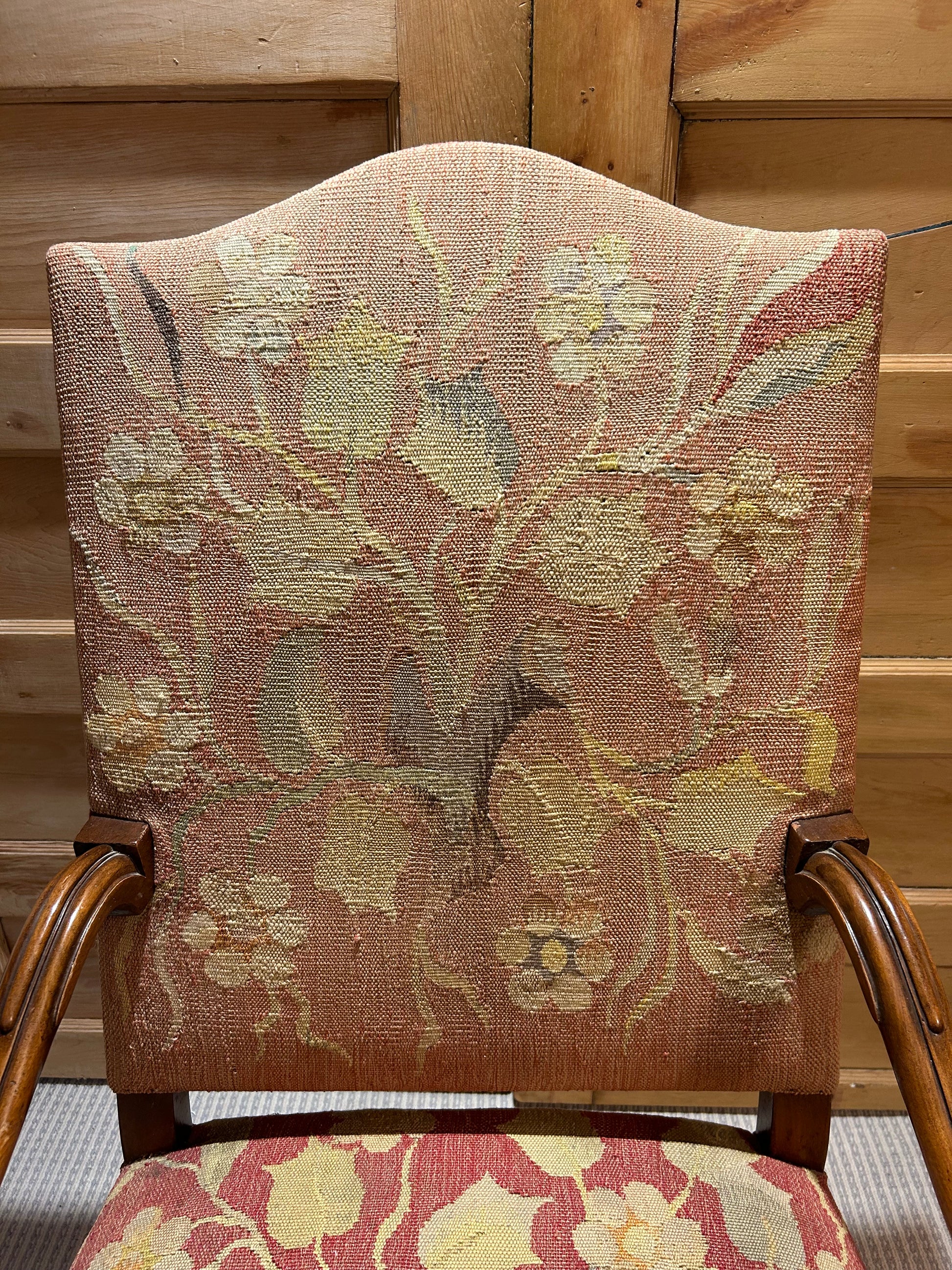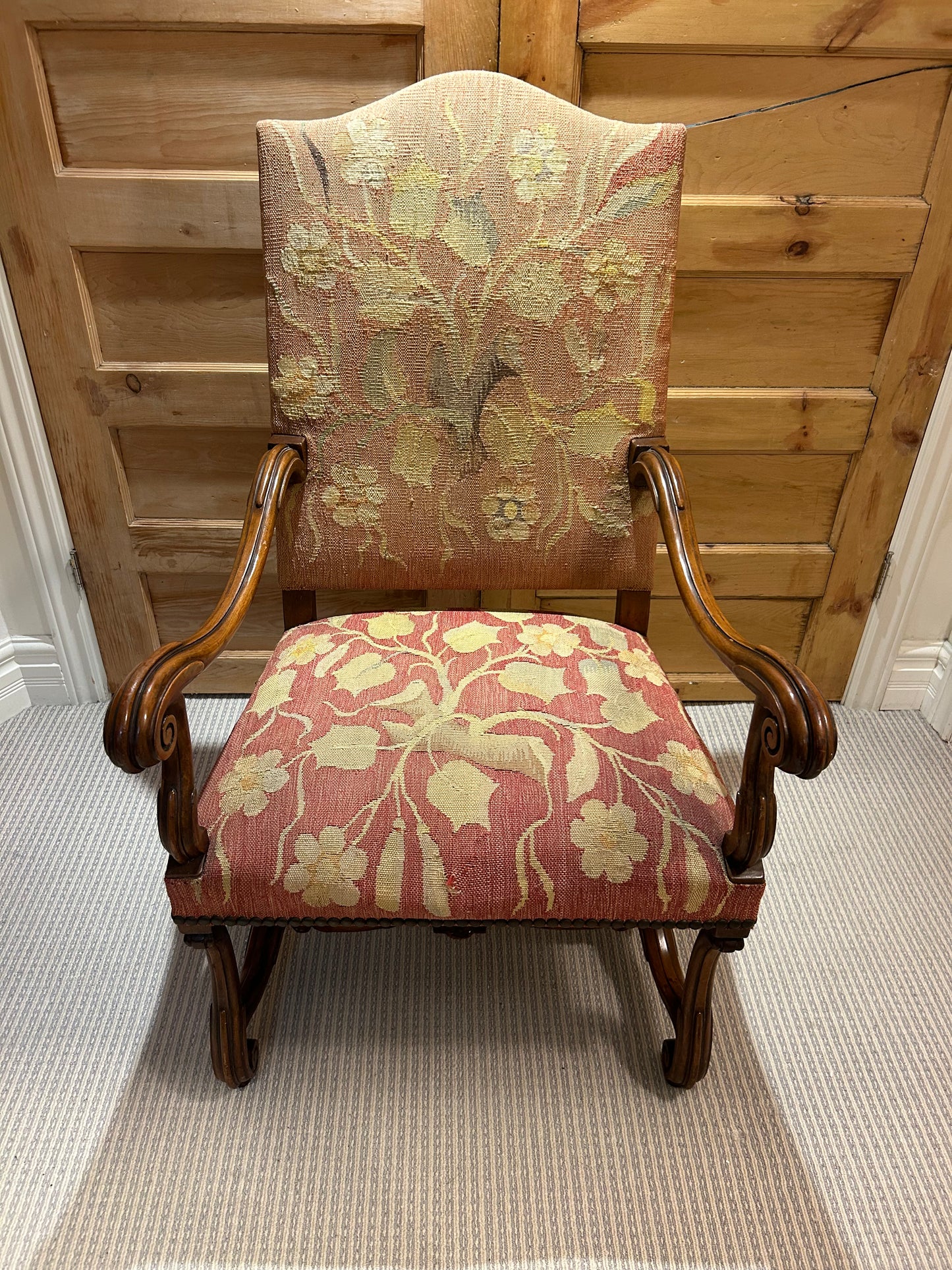 A spectacular Nineteenth Century, French fauteuil in the style of Louis XIV, upholstered in its original tapestry. Tapestry upholstered with studded details on a walnut frame with figured supports. The tapestry depicts lovely, sinuous motifs of lowers and branches on a pink ground.