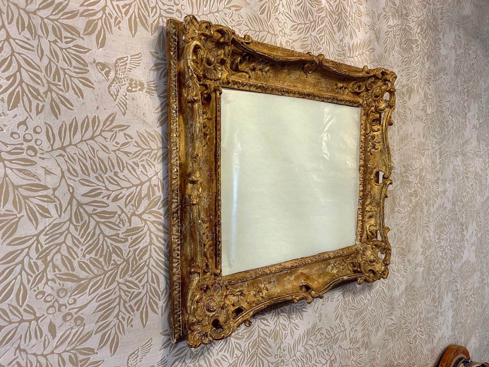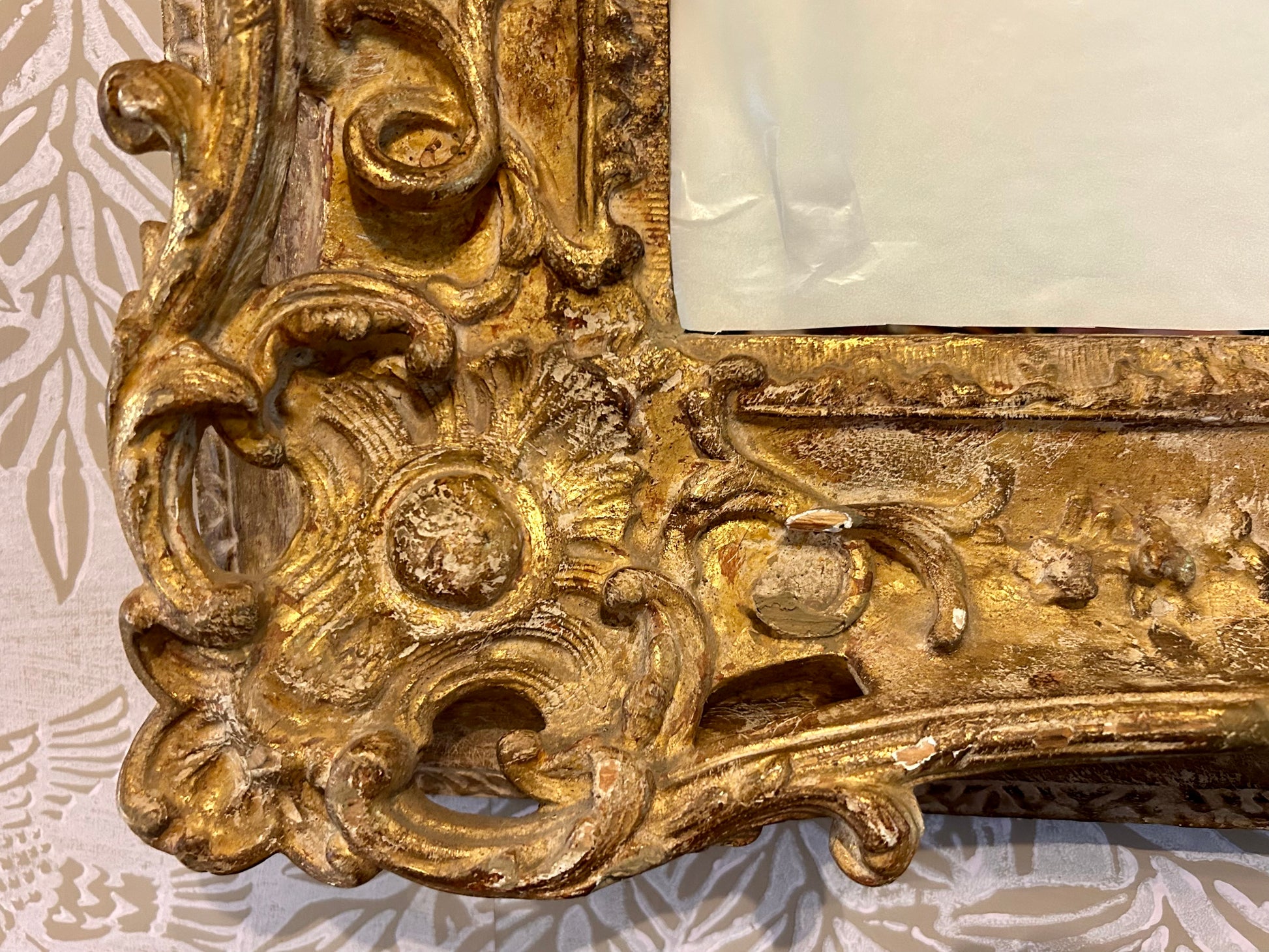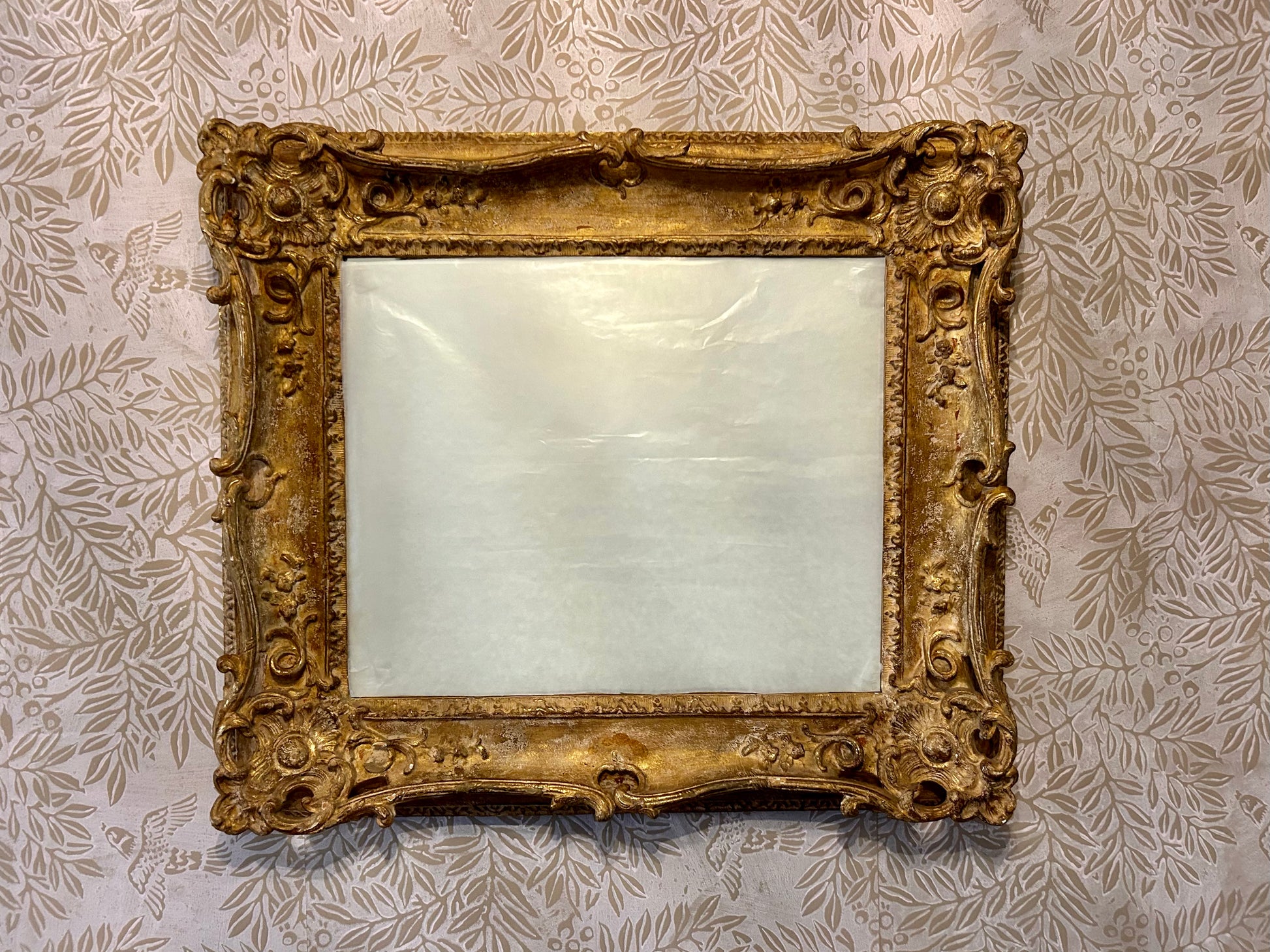 The frame is in great shape and solid. A few tiny scattered nicks to the gilt, commensurate with age. One vine has a tiny piece missing. (Lower left corner.)