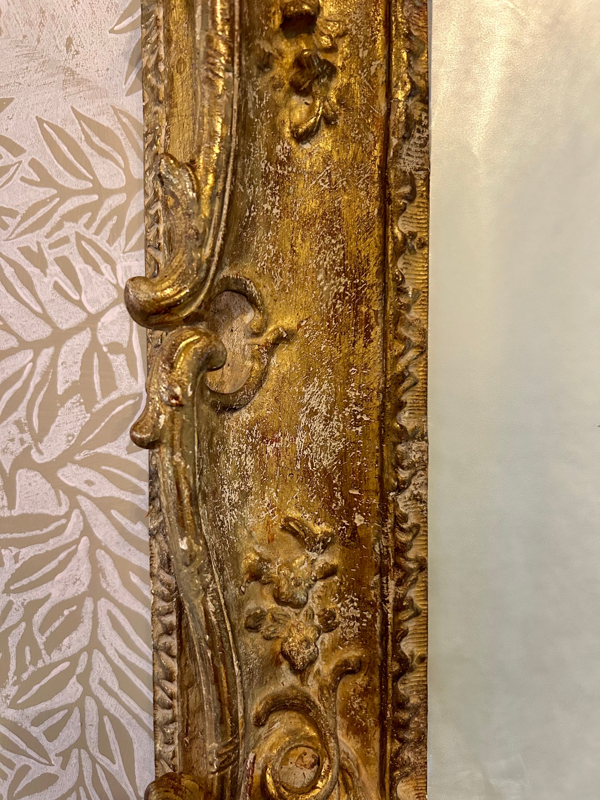 Photos don't do justice to the gorgeous patina of this frame, which is a very warm, light gold with undertones of umber and white. Beautifully hand carved with scrolls, vines and flowers. This piece has a substantial presence with three inches of depth, giving it a wonderful materiality on the wall.