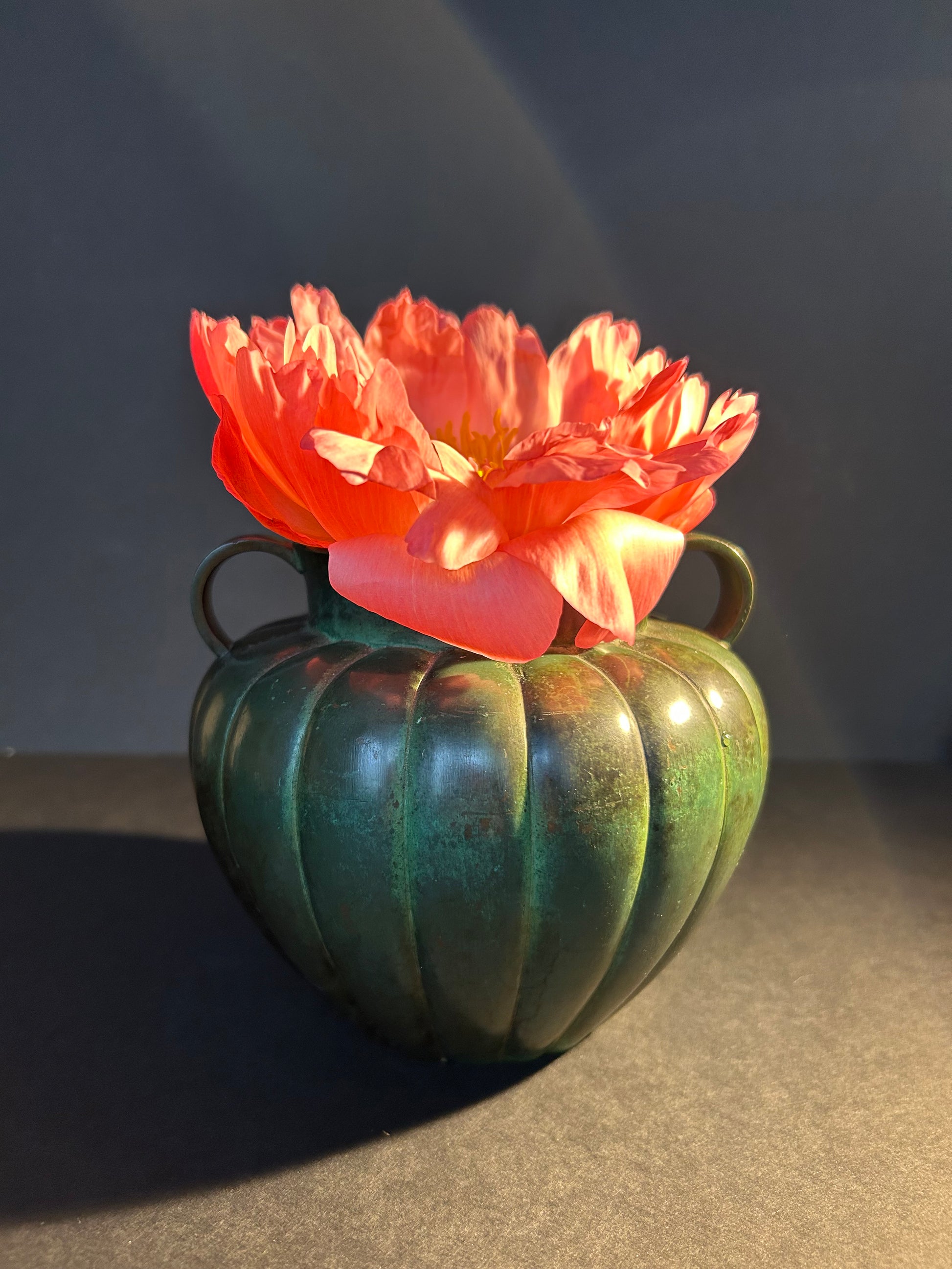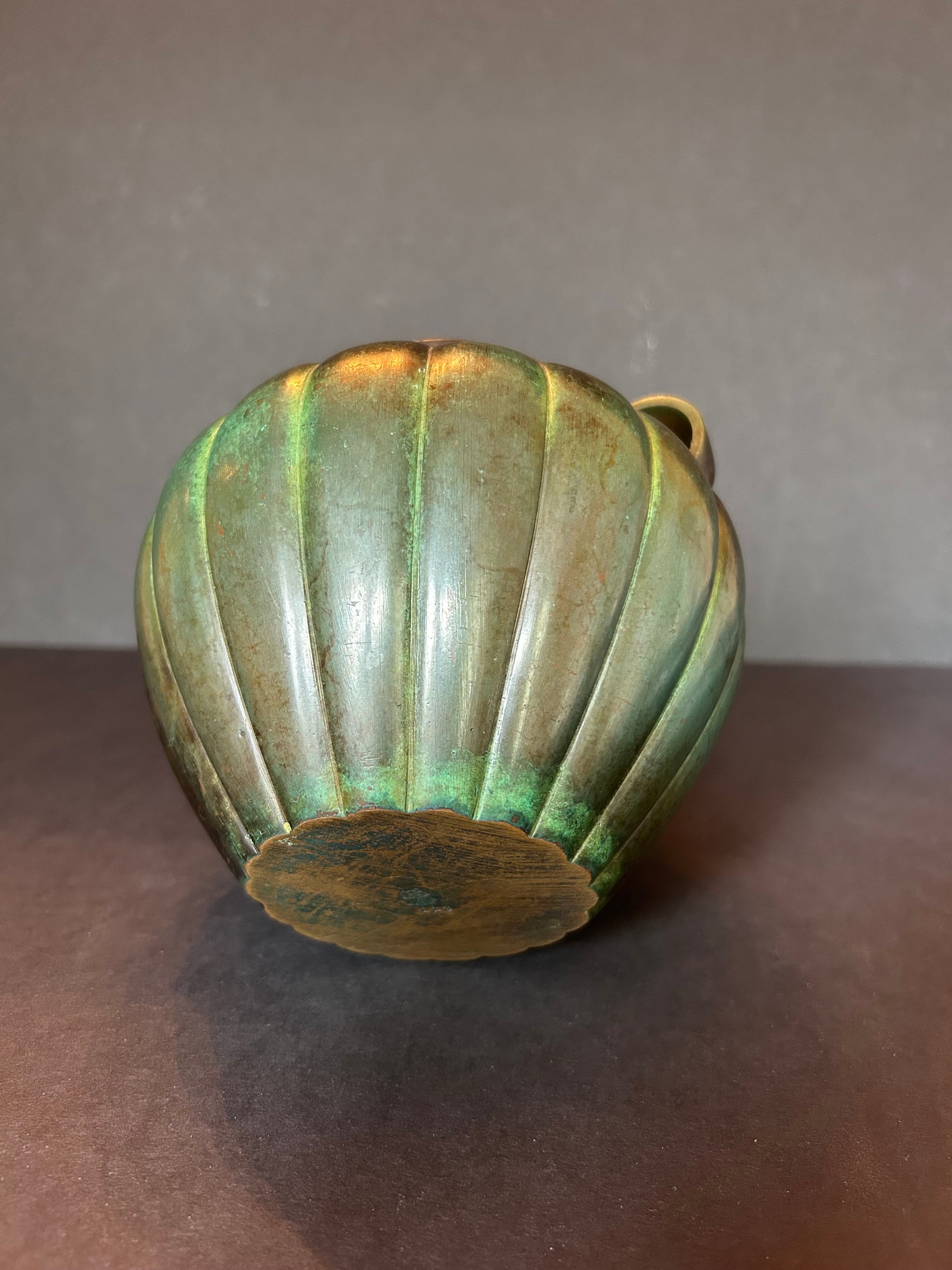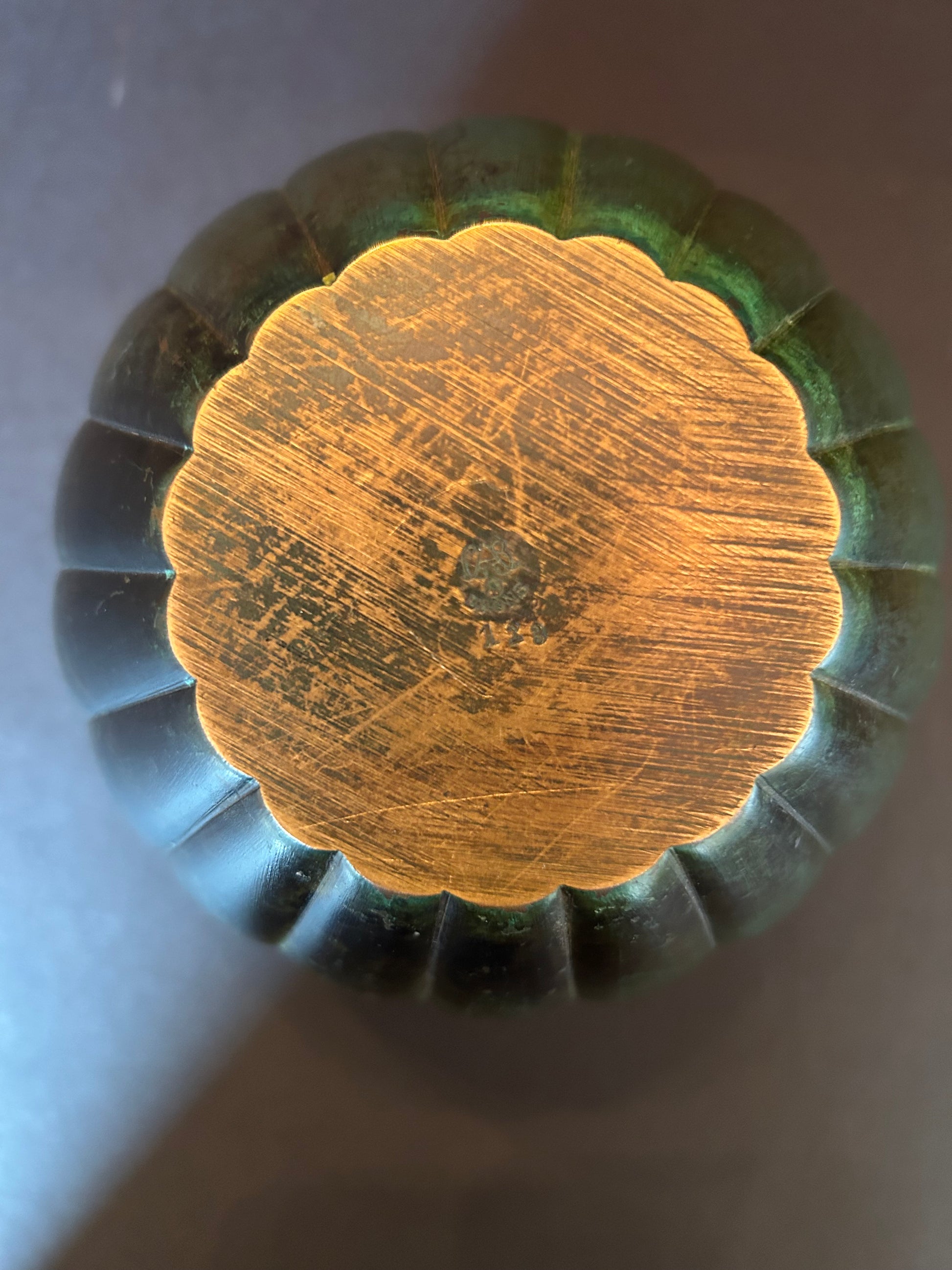 This vase has a lobed body and is impressed with the maker's mark to the base. It has a gorgeous green patina with bronze tones and verdigris highlights. Beautifully made of solid bronze, it has a substantial weight for its size, weighing approximately 3.8 lbs. (1.7kg.)