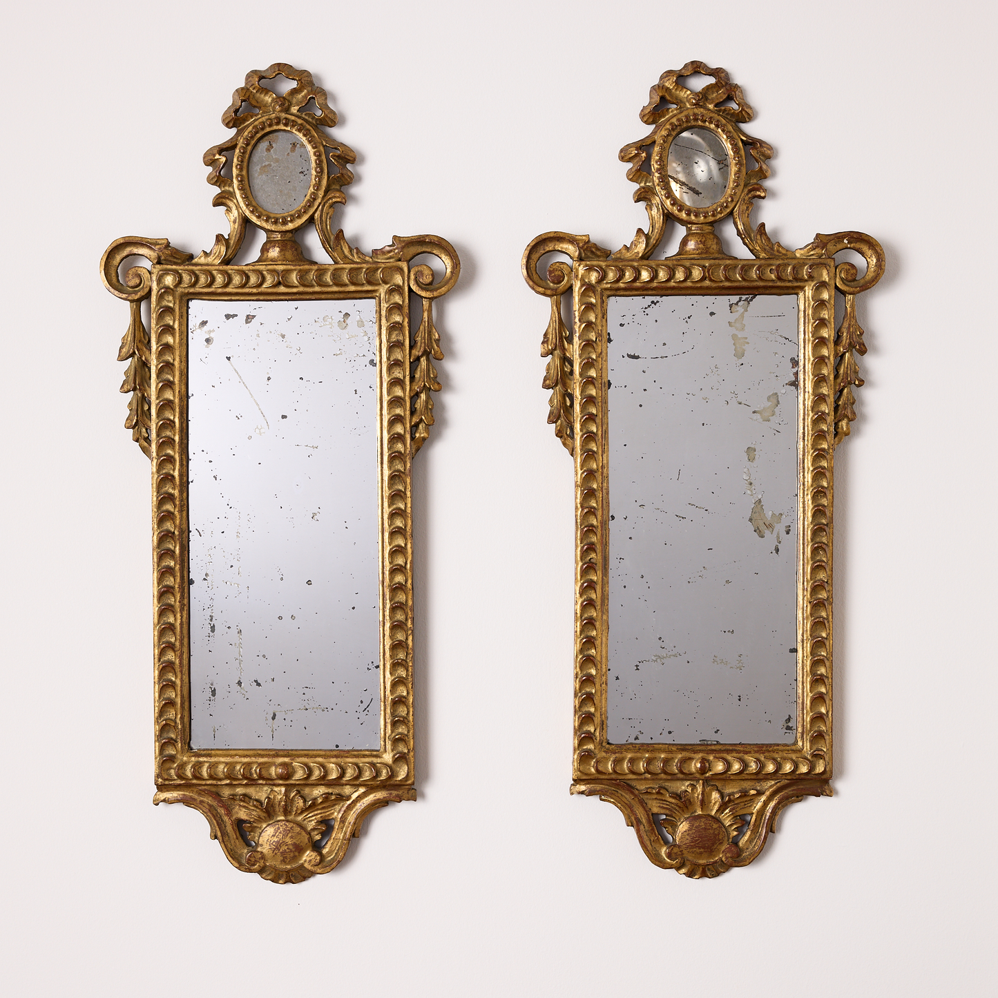 Rectangular framed mirror surmounted with oval mirror and ribbon details.