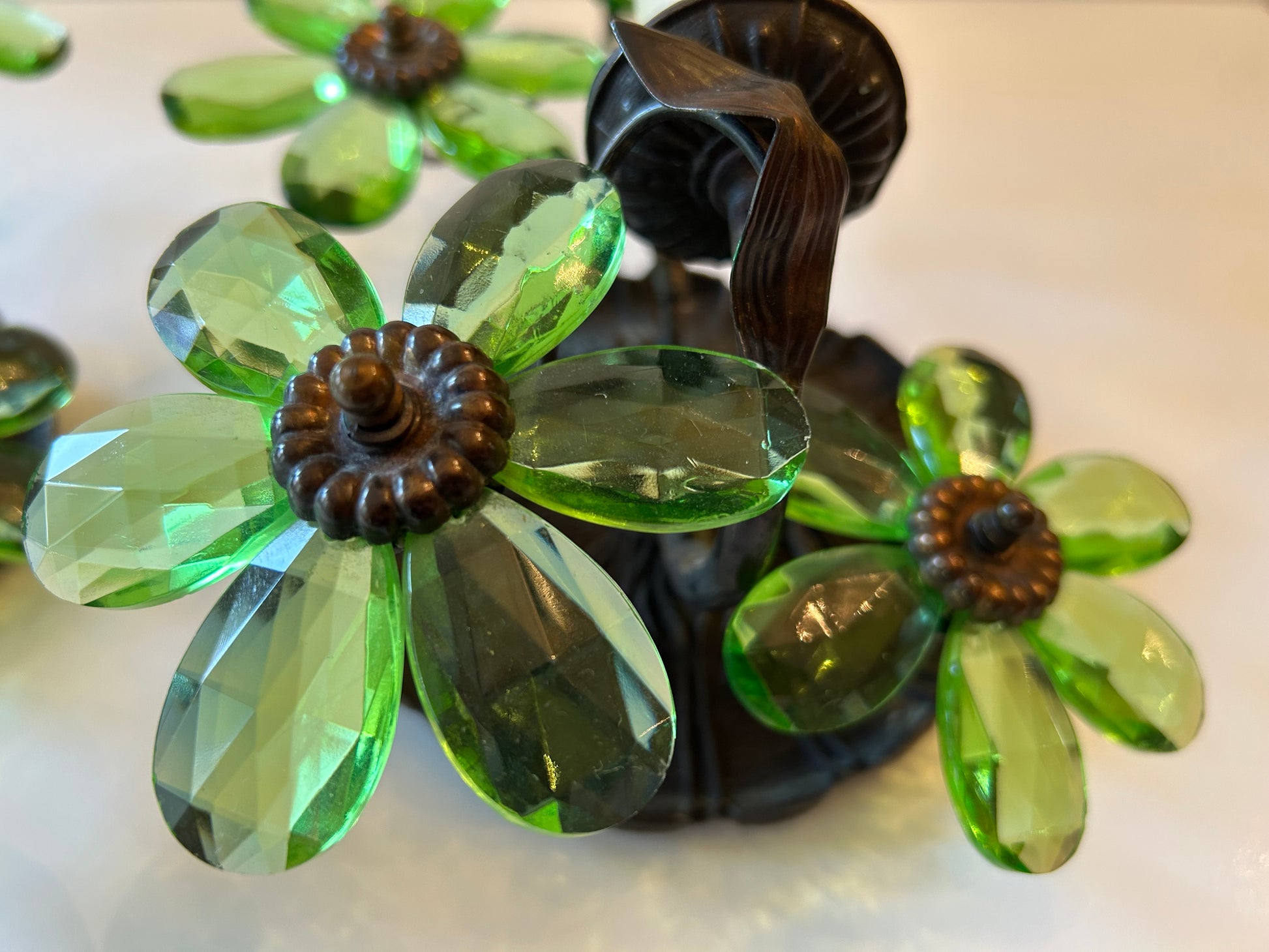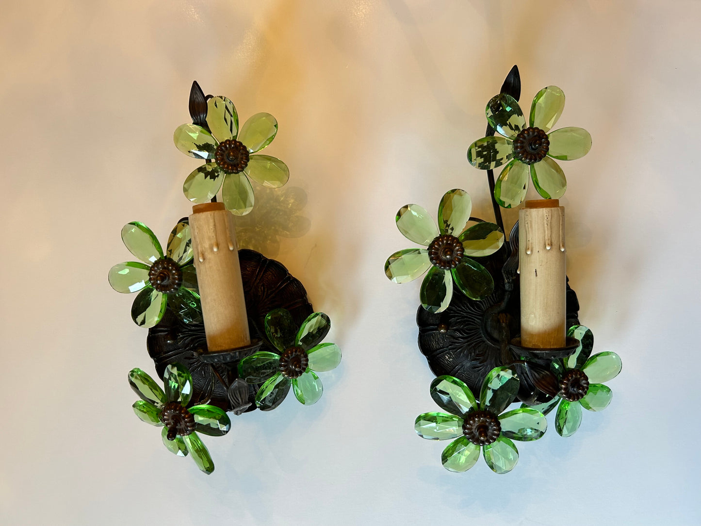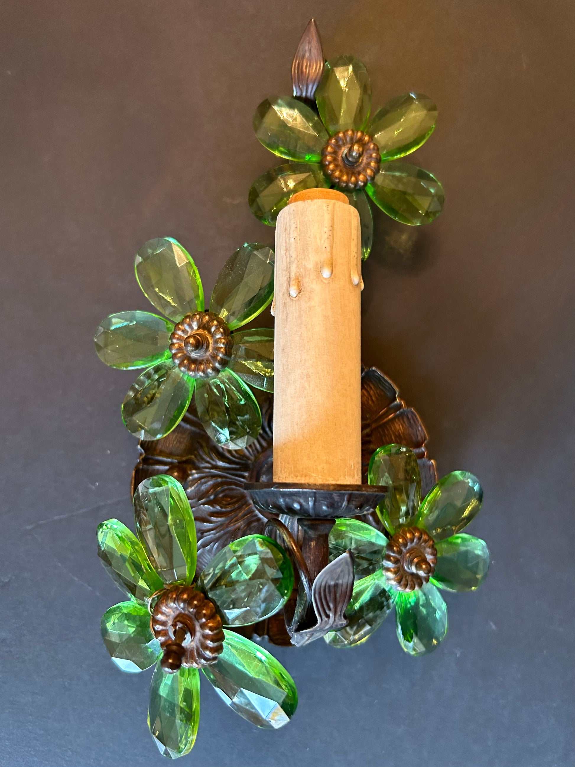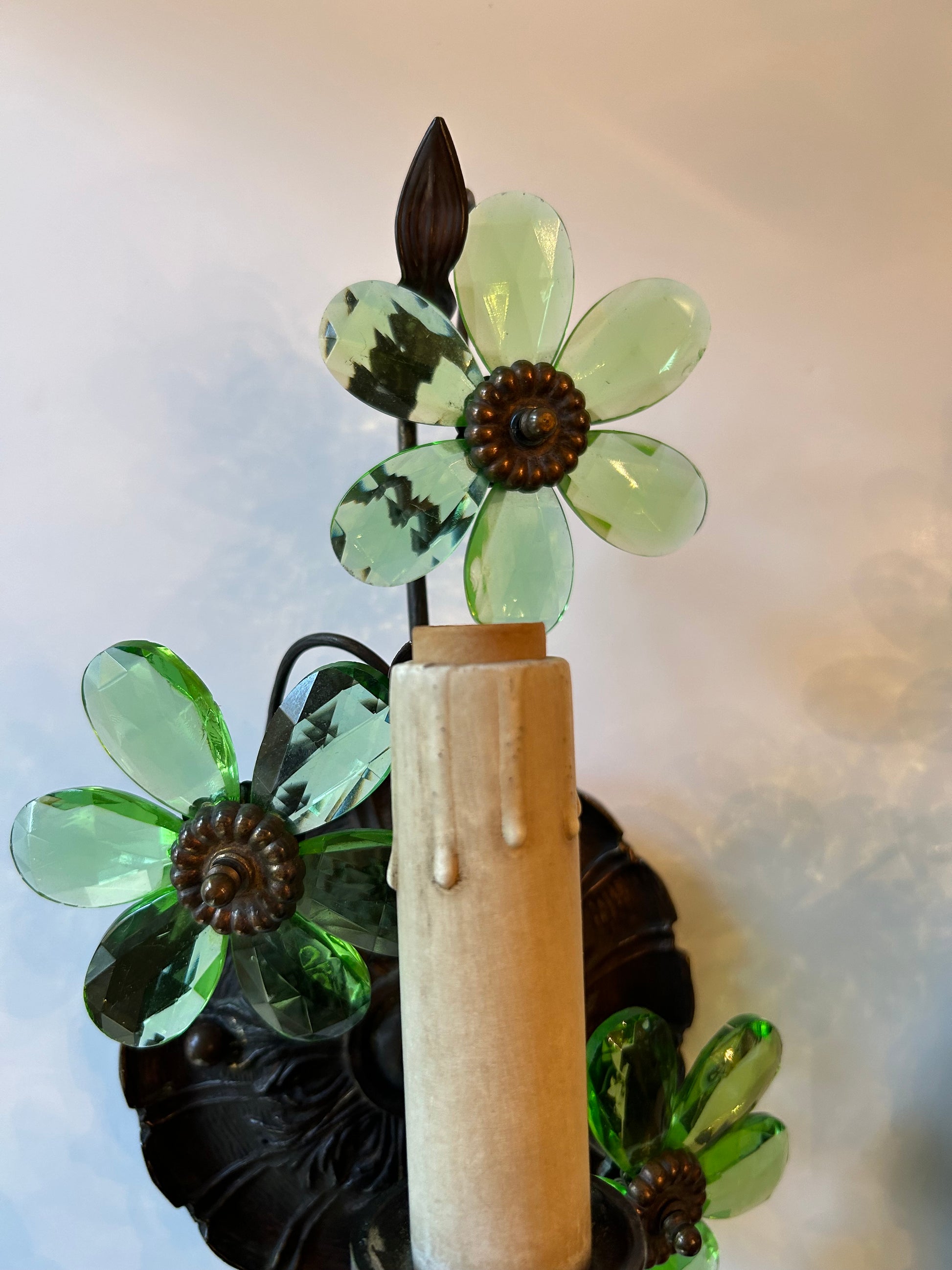 A wonderful pair of vintage Hollywood Regency style sconces made of metal and glass, showcasing sinuous leaves and bright green glass petals. In good condition, with all glass petals intact. Each sconce has one socket for a chandelier type bulb.