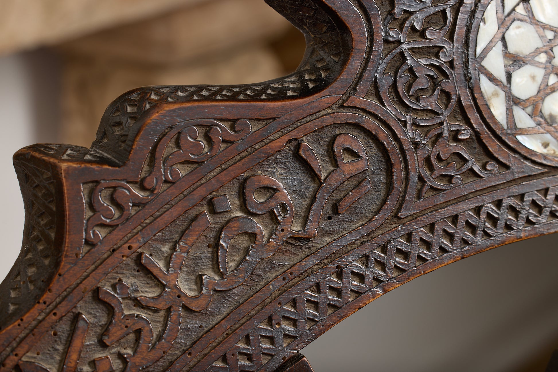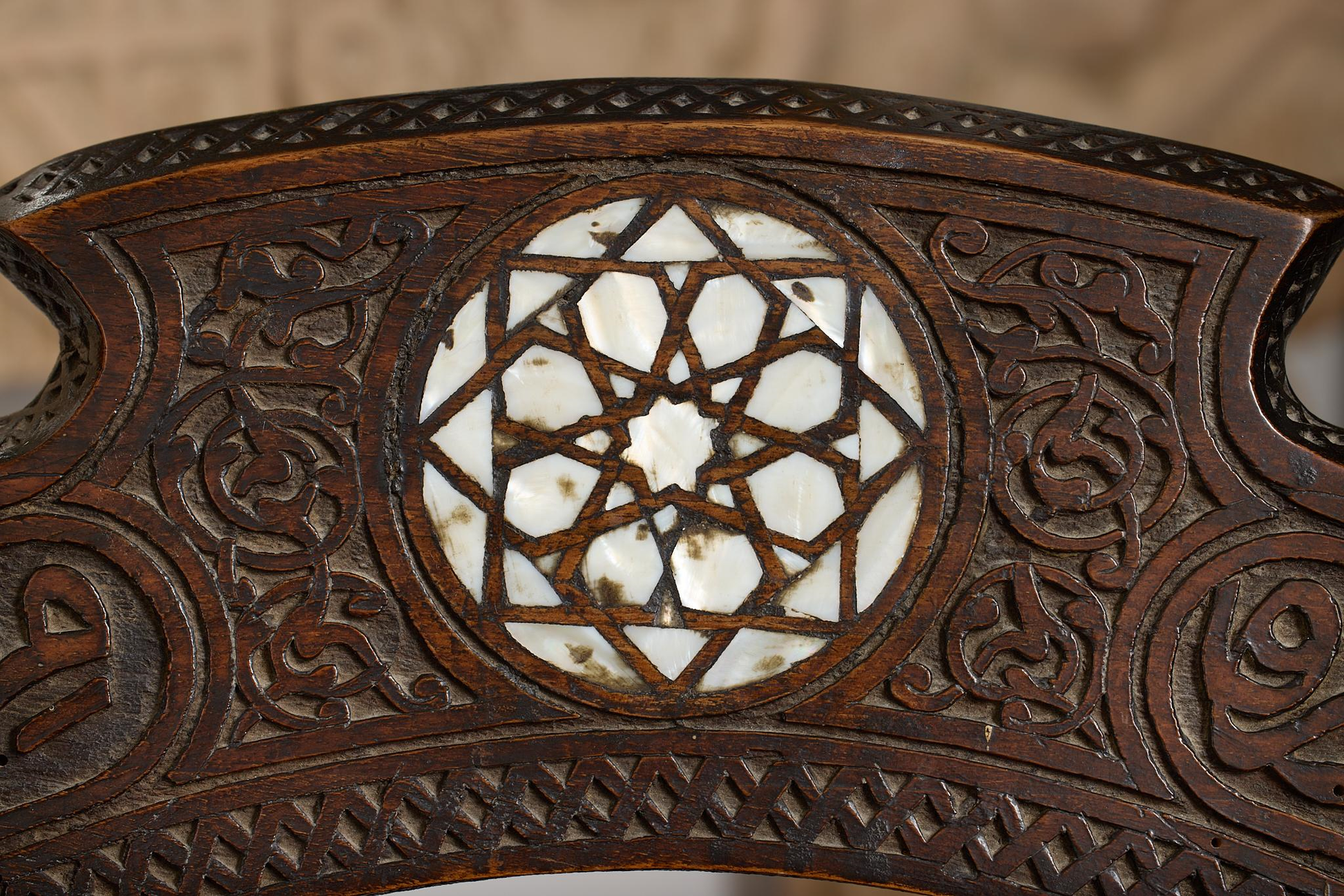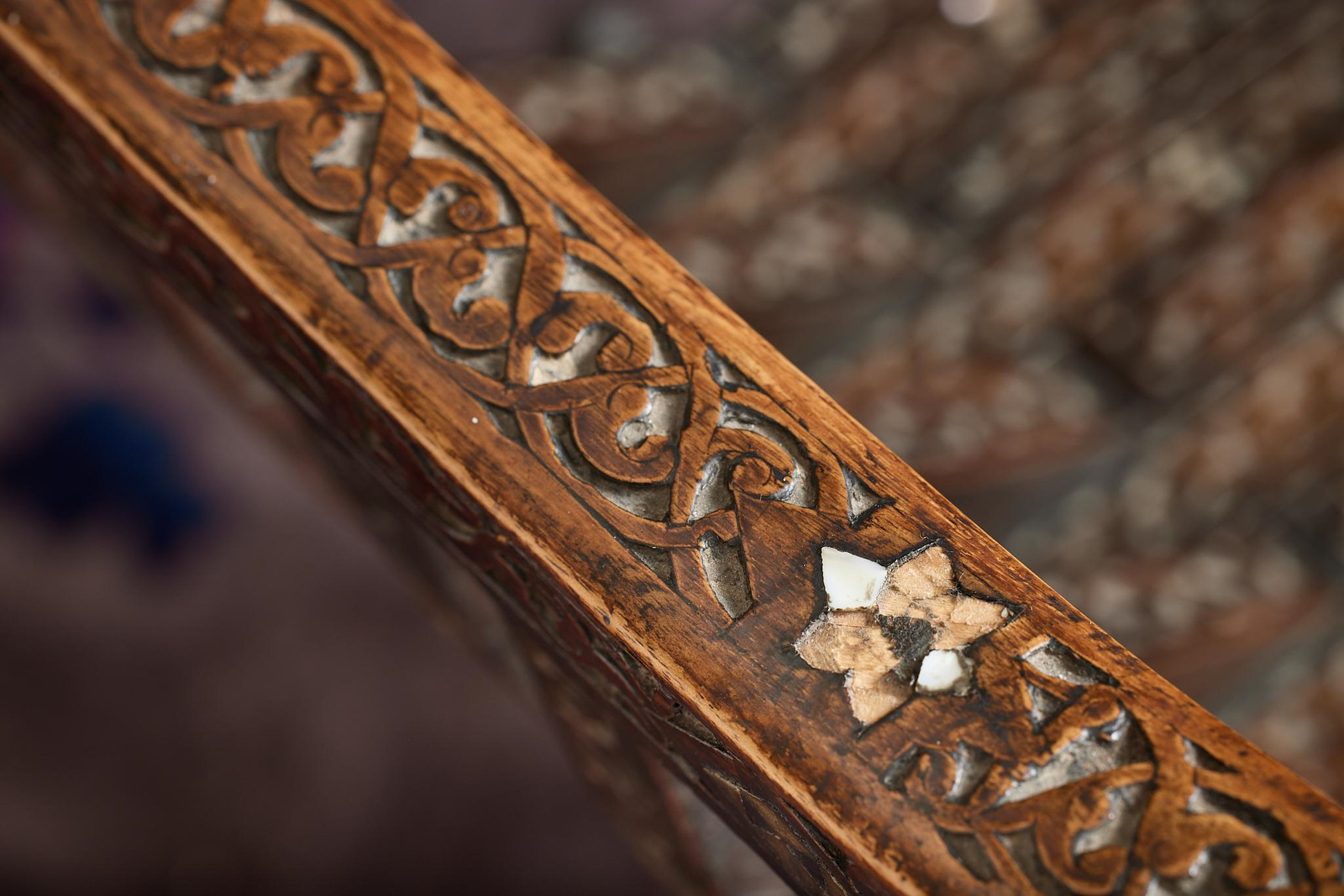 With intricate carved and inlay detail. Arabic text inscribed along the back rail.