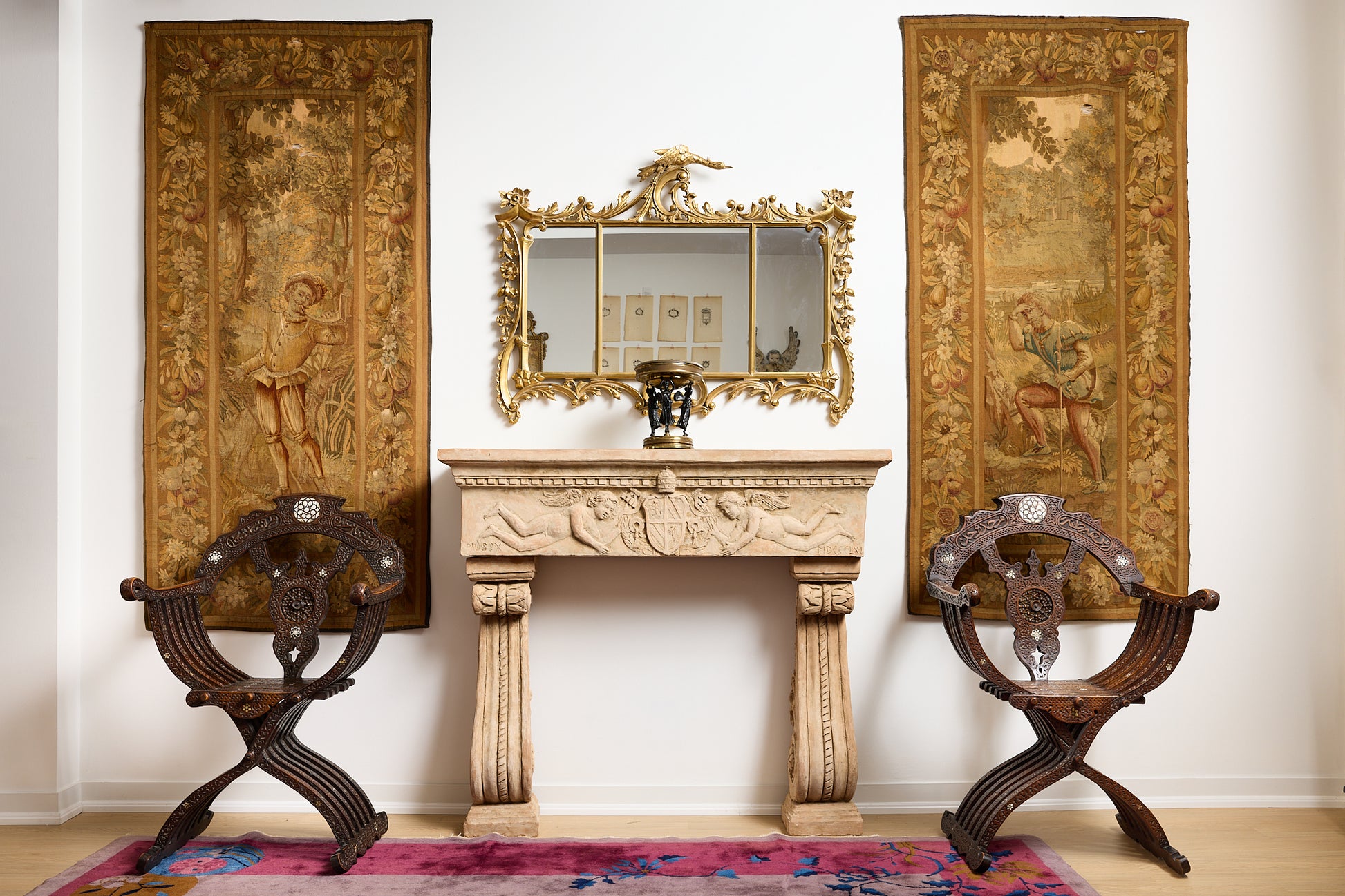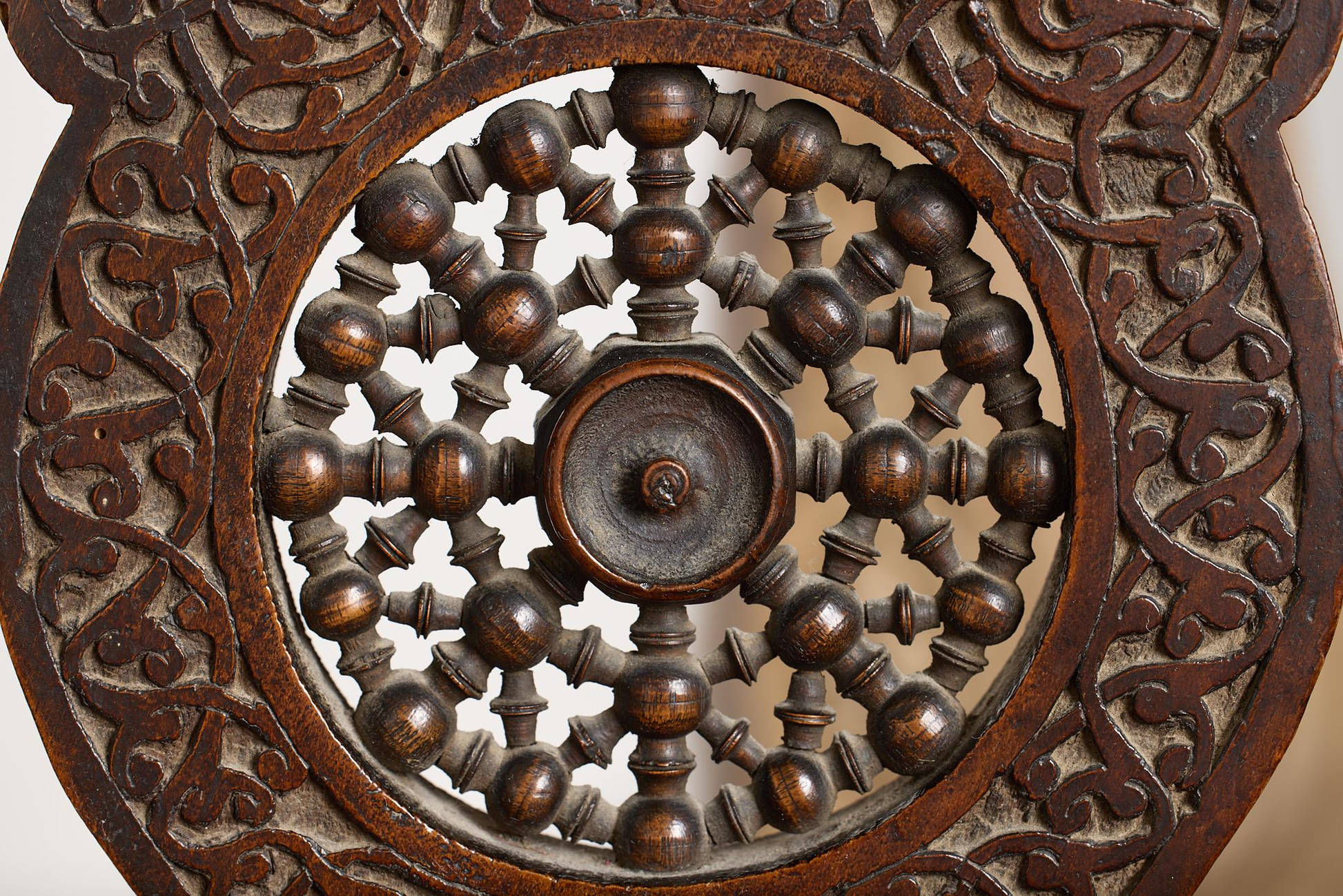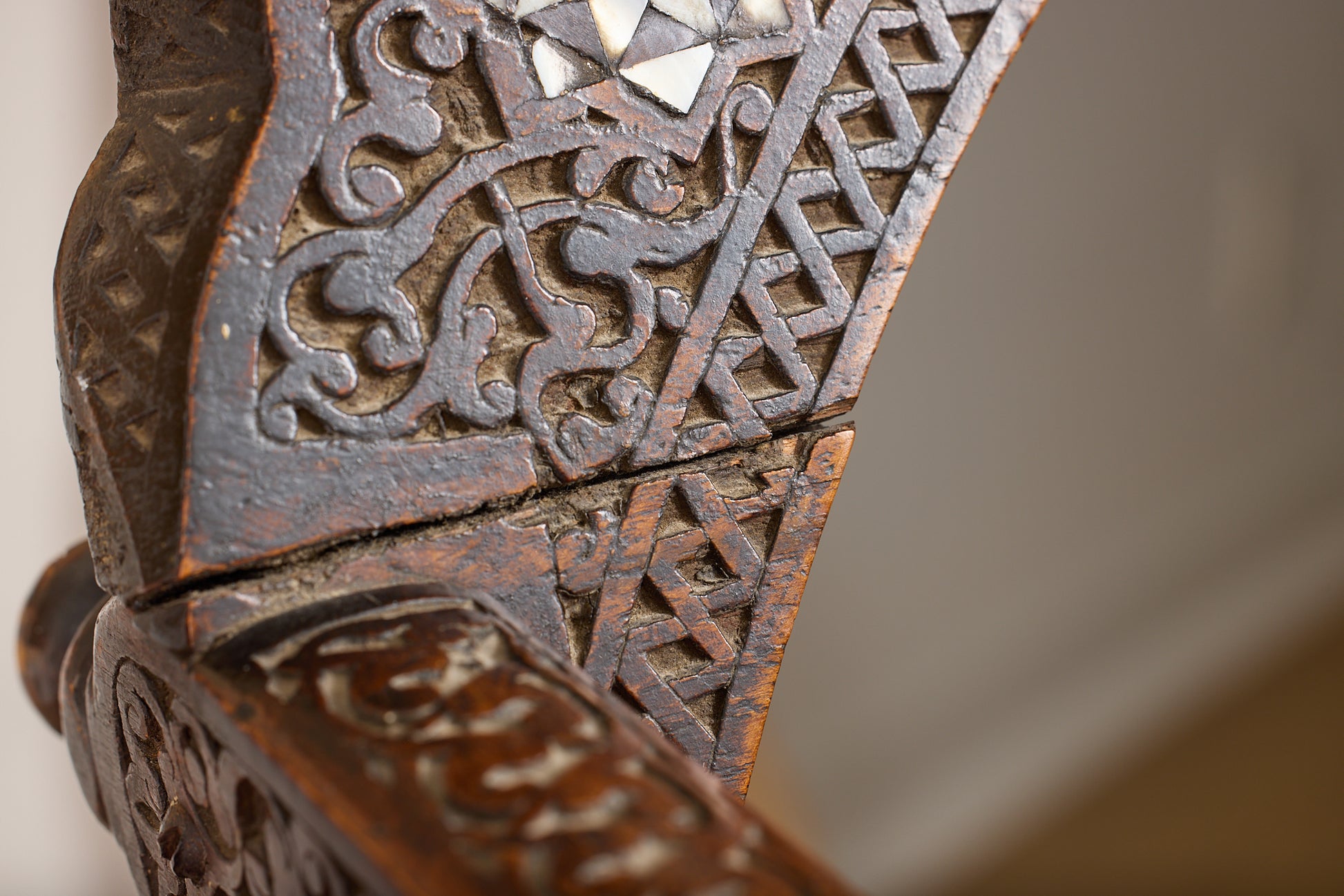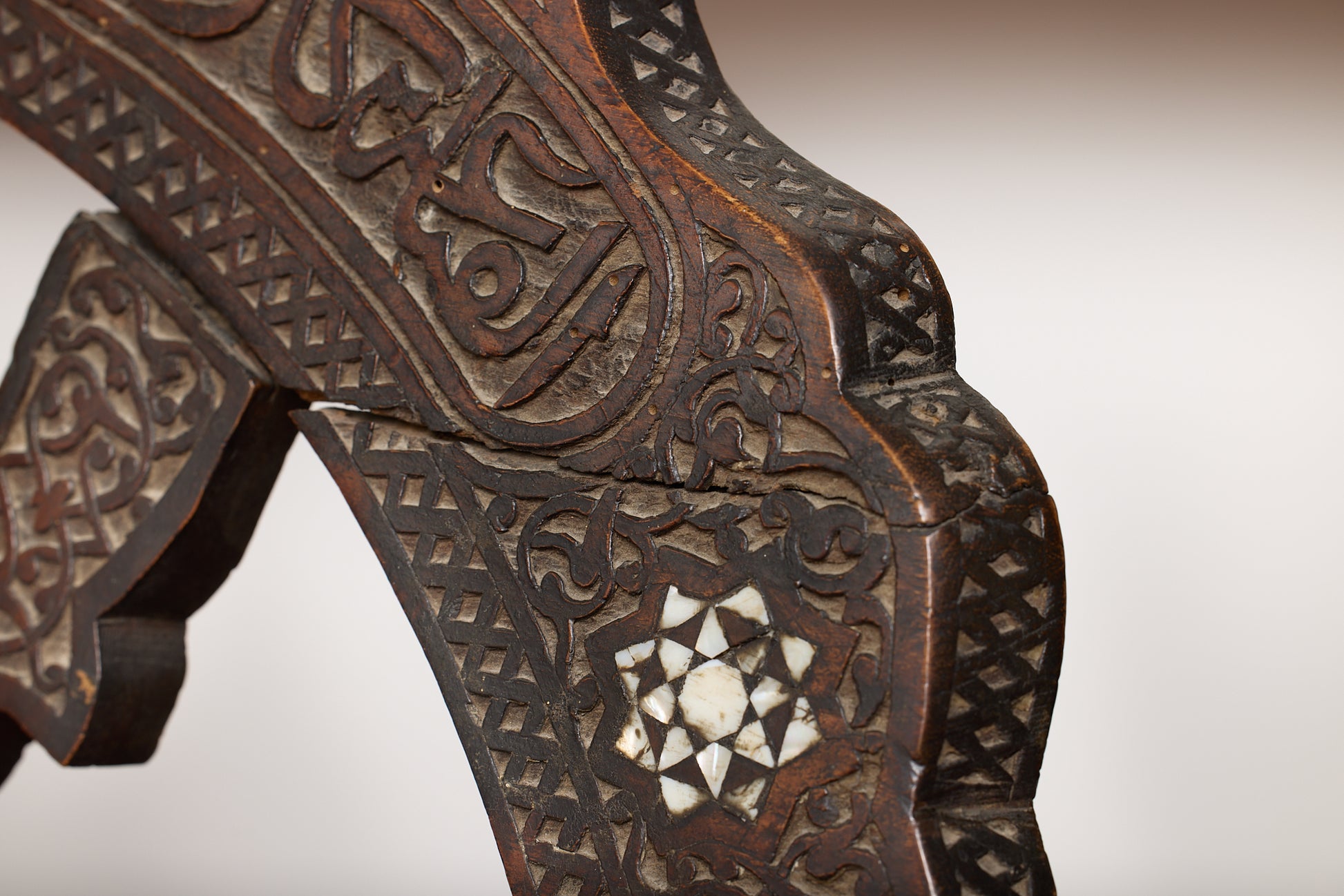 With intricate carved and inlay detail. Arabic text inscribed along the back rail.