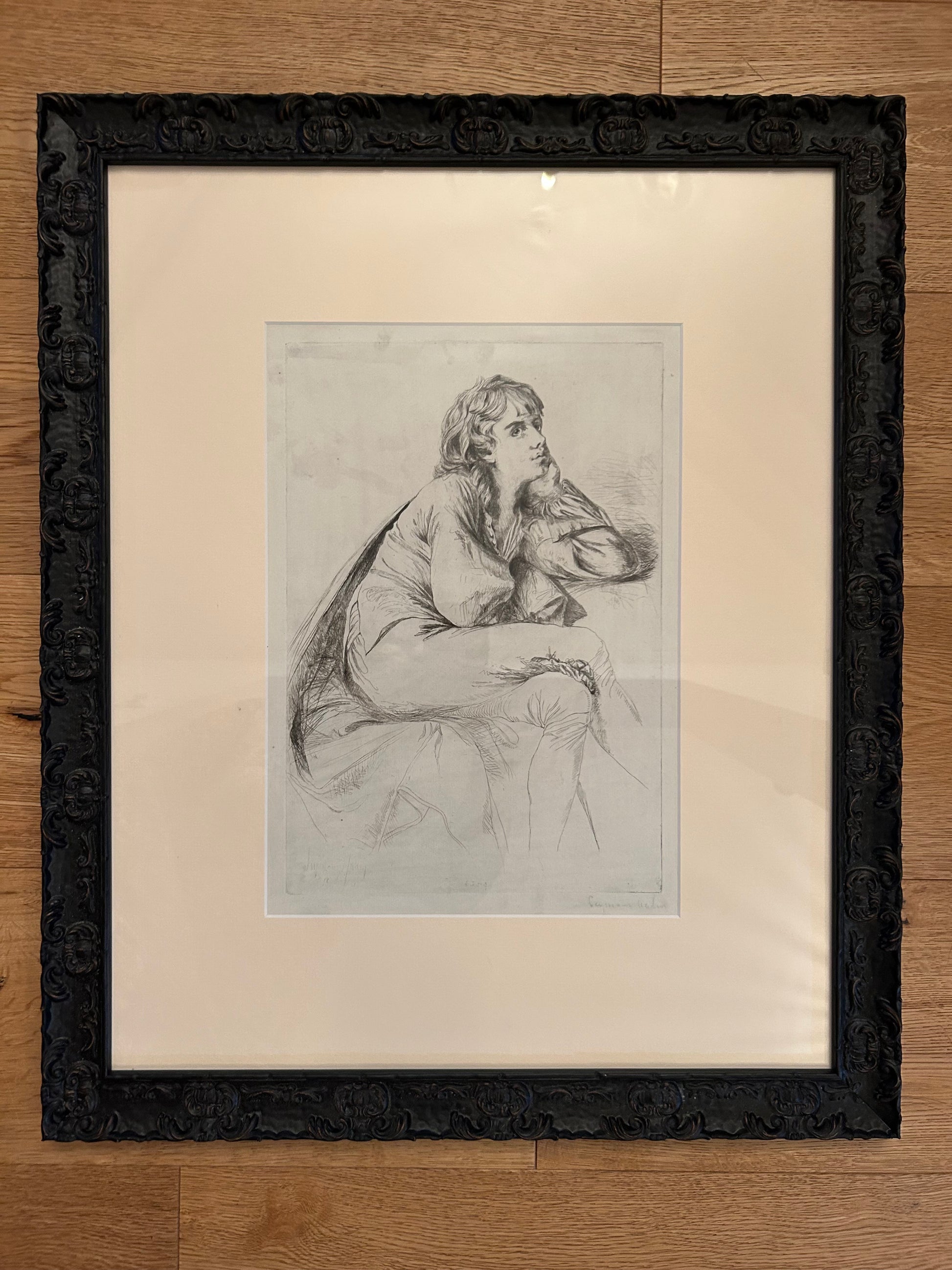 This print is after the painting 'Edwin the Minstrel' by Joseph Wright of Derby. The painting was exhibited at the Royal Academy in 1778 and 1781 and was a portrait of a living person, Thomas Haden.