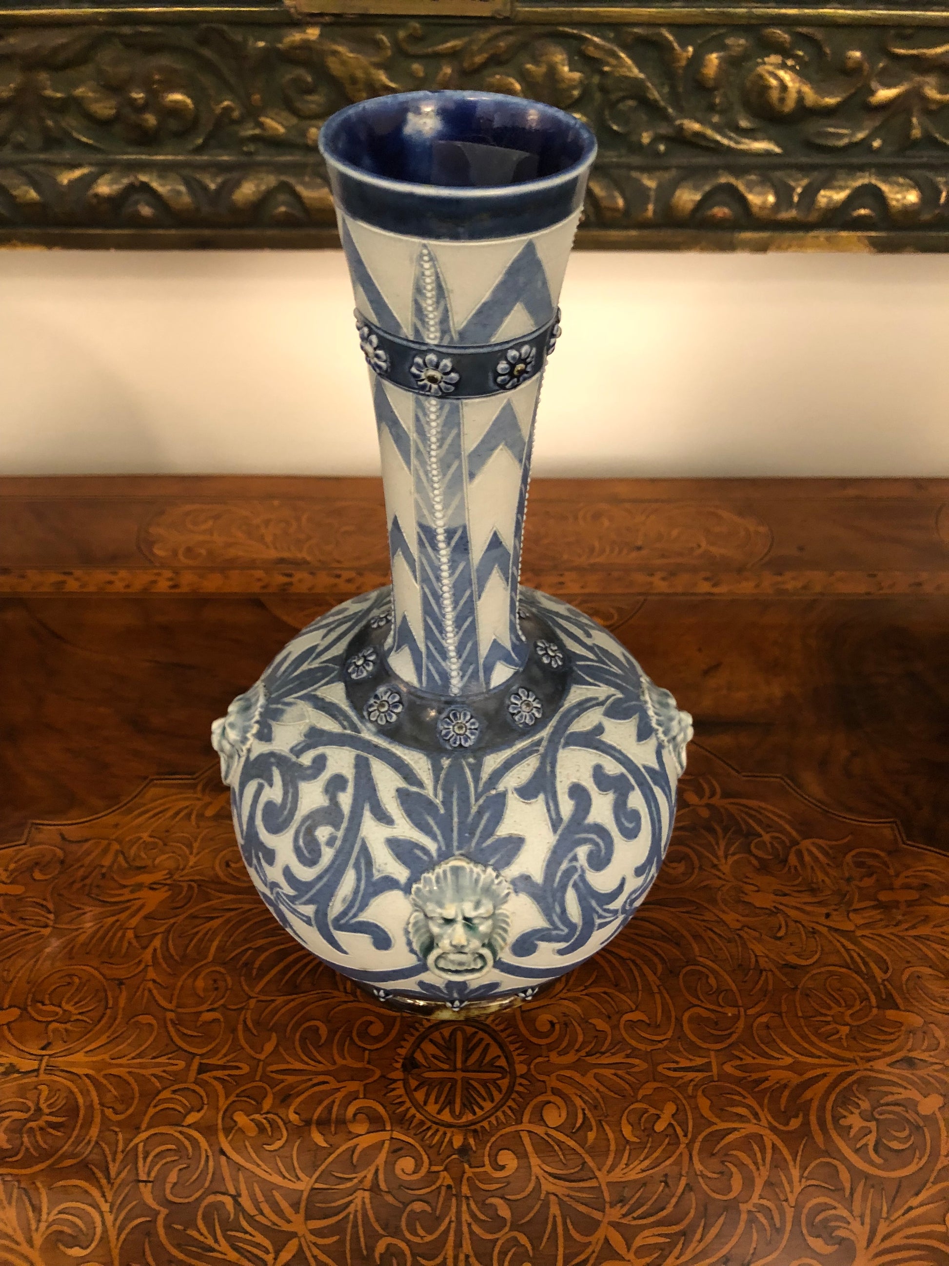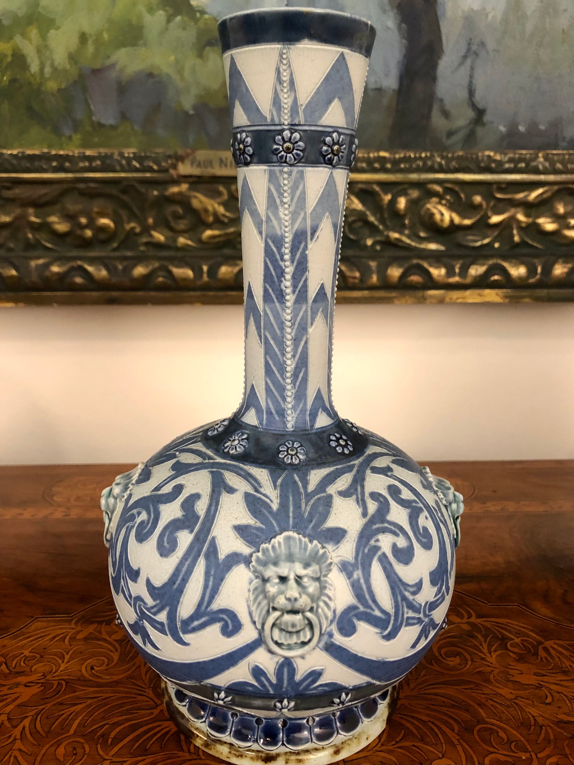 A stunning indigo and white, Doulton Lambeth stoneware vase, with incised decoration and applied lion masks. There are multiple signatures on the bottom, including Frank Butler. The vase is dated 1877 and is in pristine condition, with no cracks, scratches or losses.