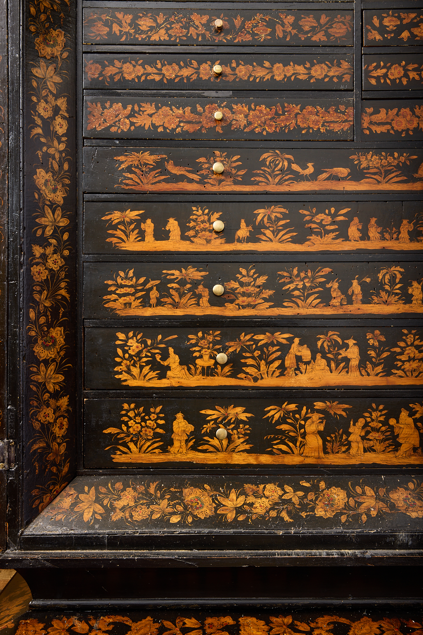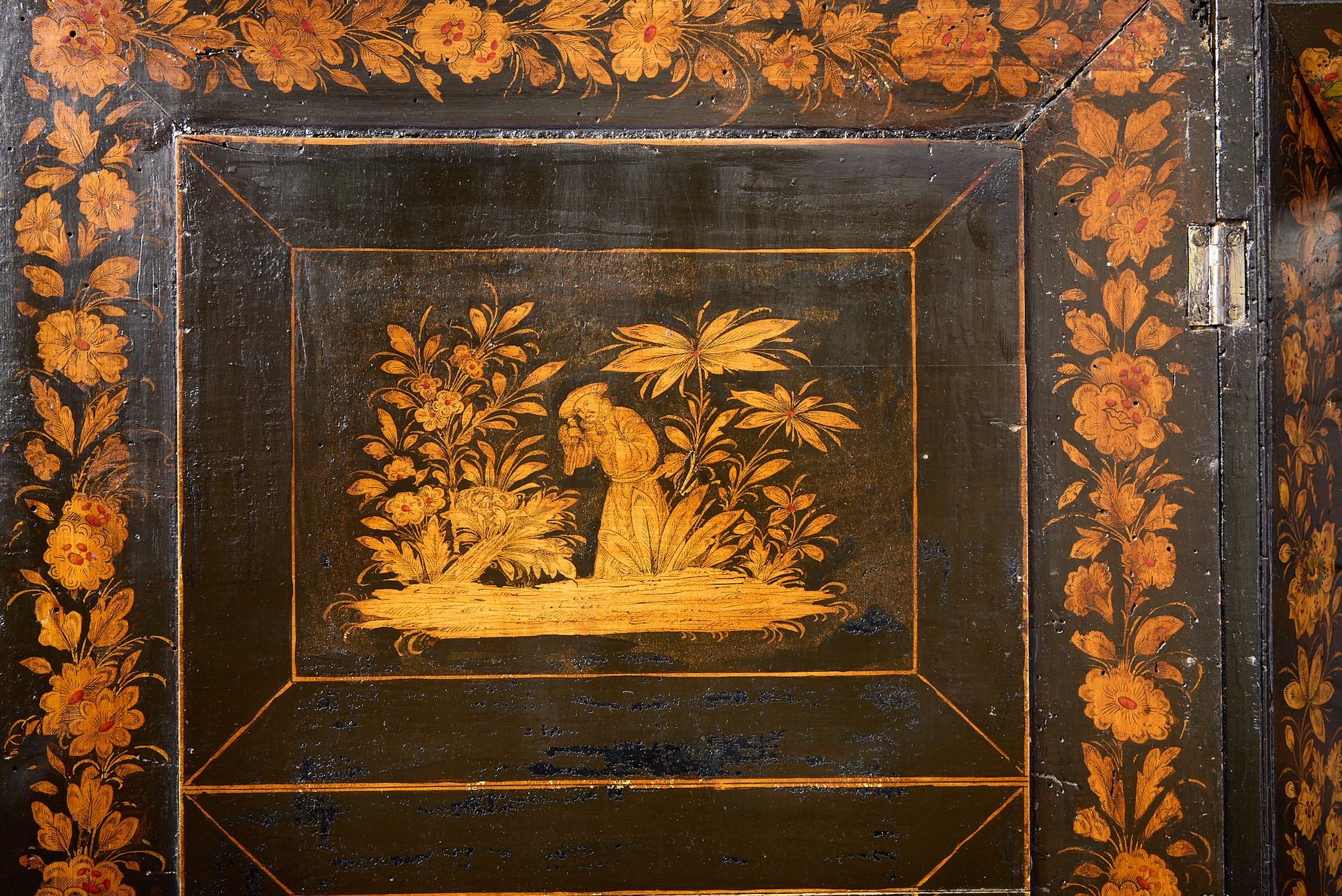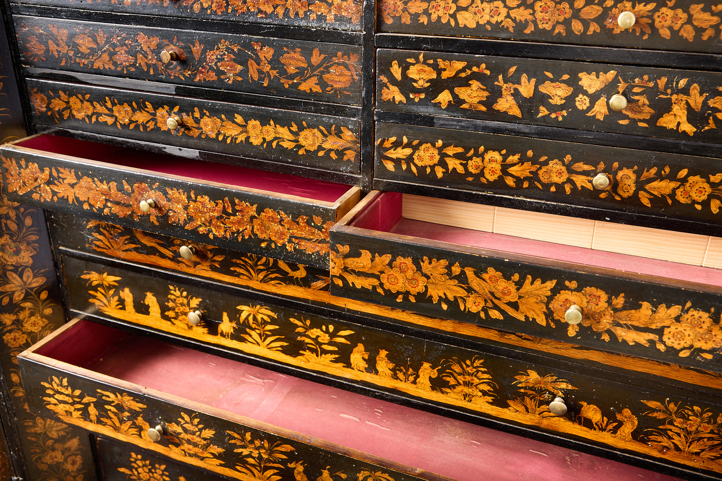 A period English cabinet, circa 1800, in lacquer with penwork figural decoration. Double doors open to reveal fifteen fitted drawers.