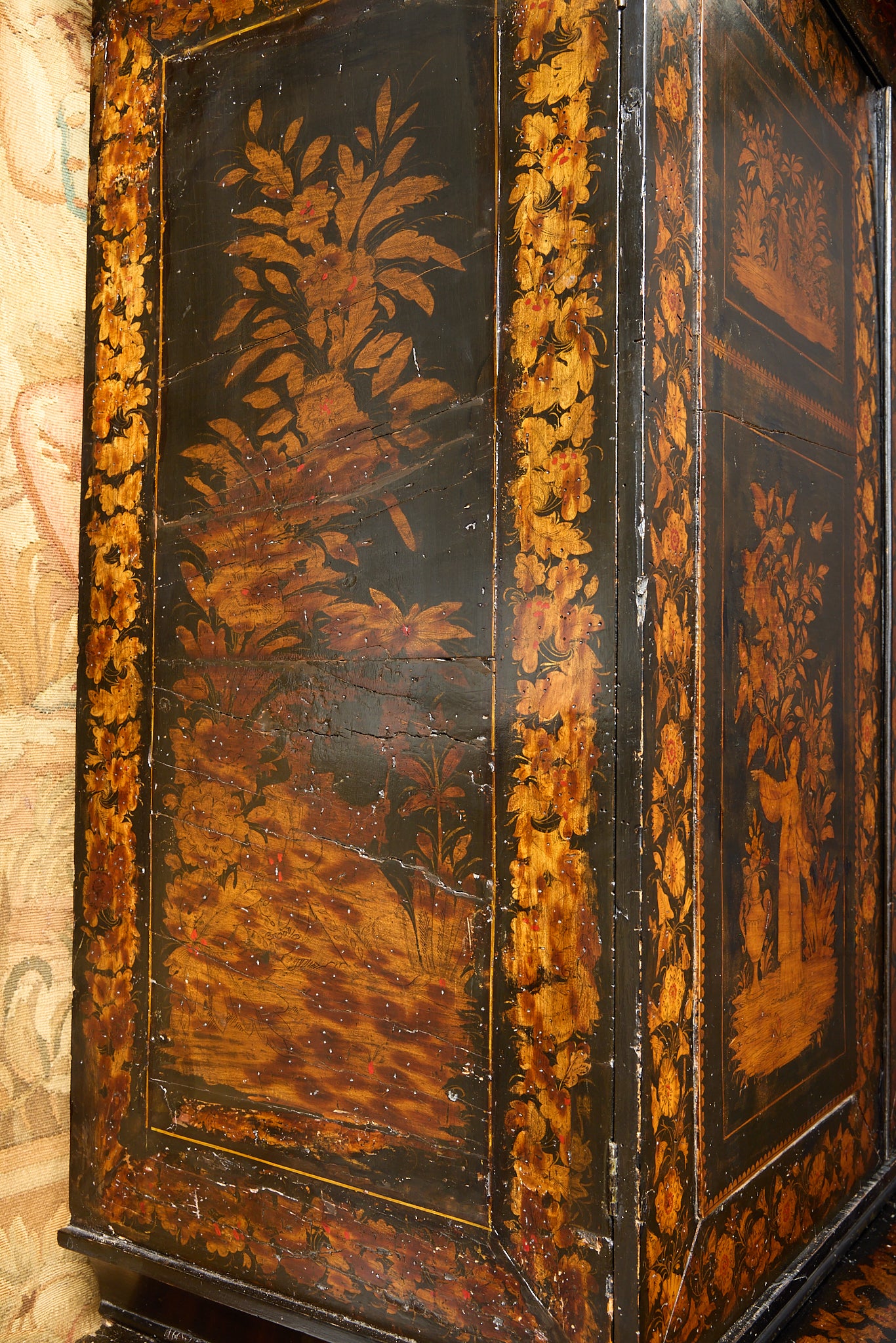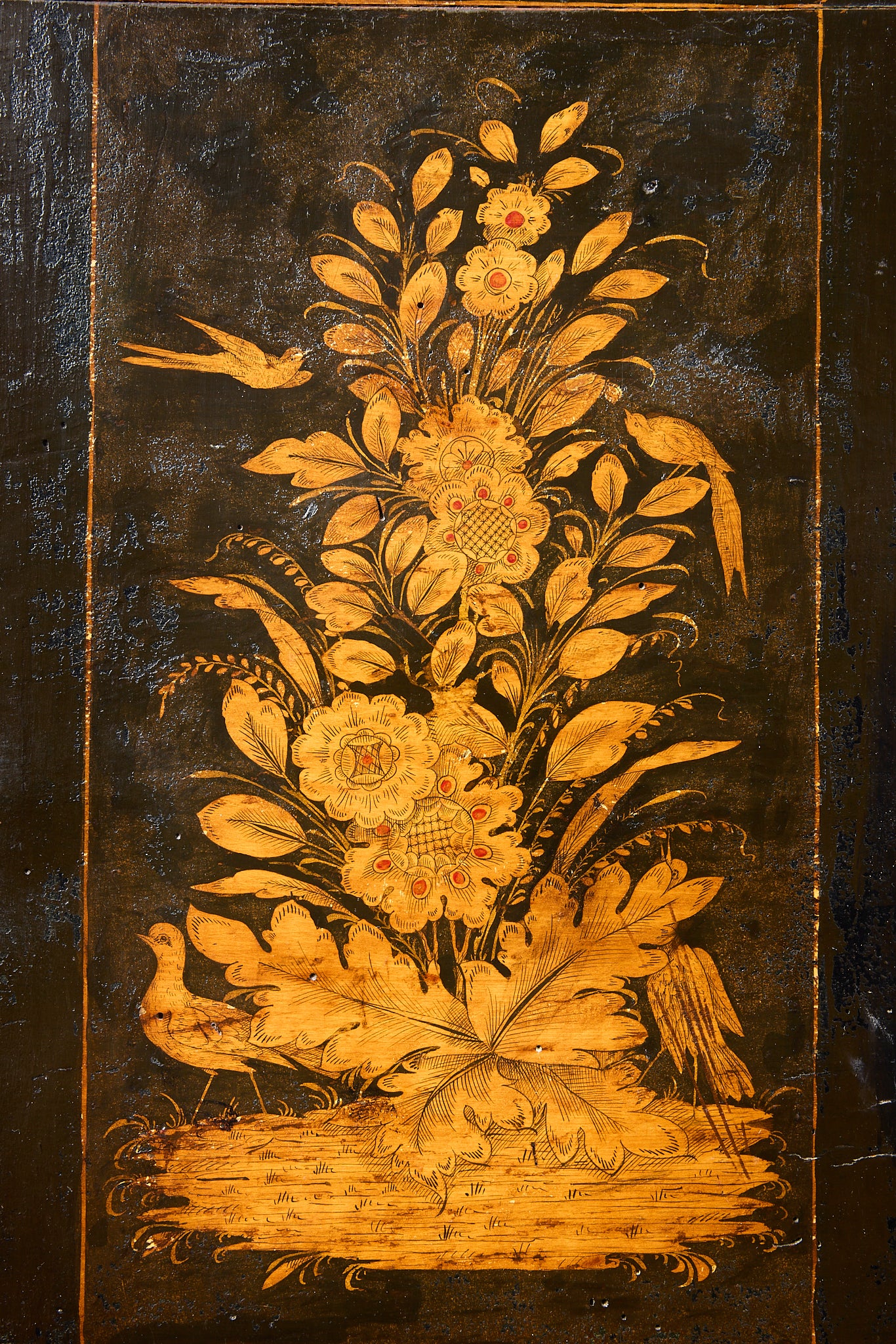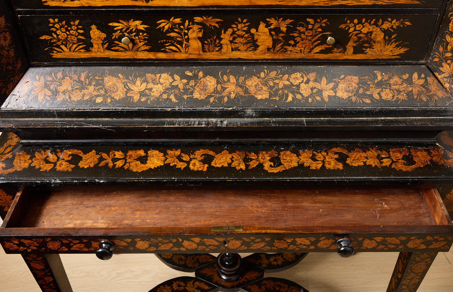 A period English cabinet, circa 1800, in lacquer with penwork figural decoration. Double doors open to reveal fifteen fitted drawers.
