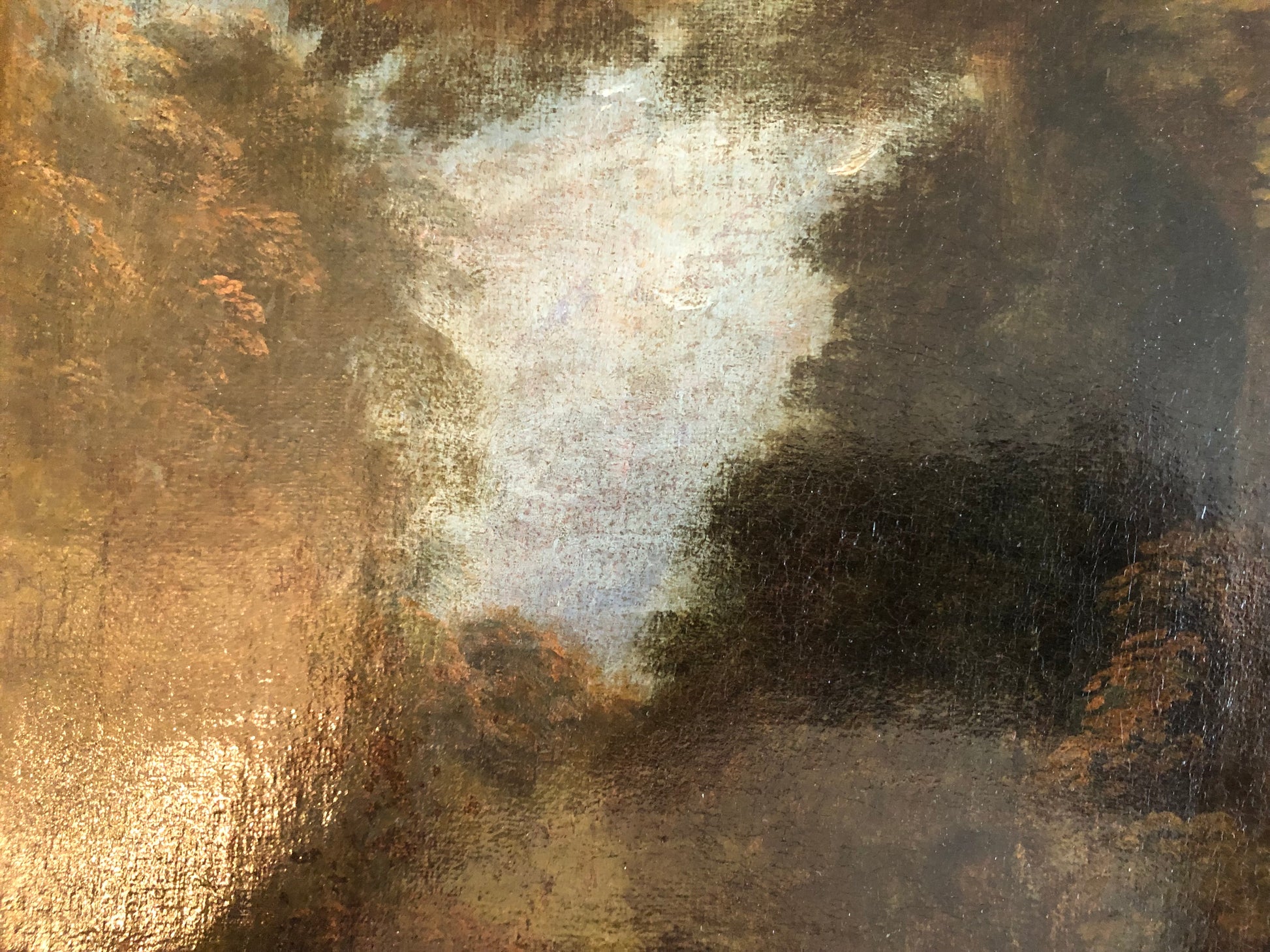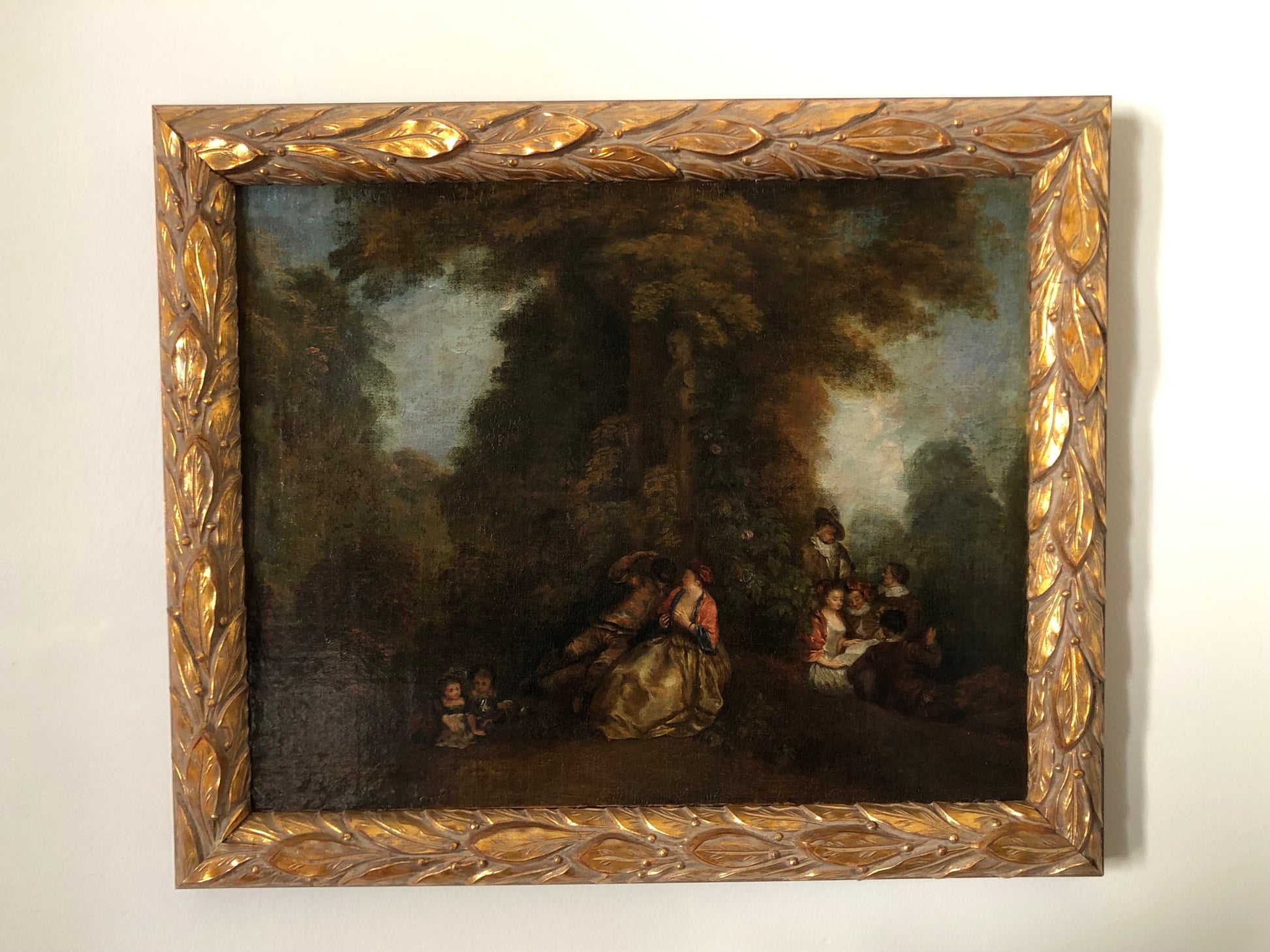 18th Century Oil on canvas depicting a garden scene typical of the period, in a contemporary gilt wood frame.