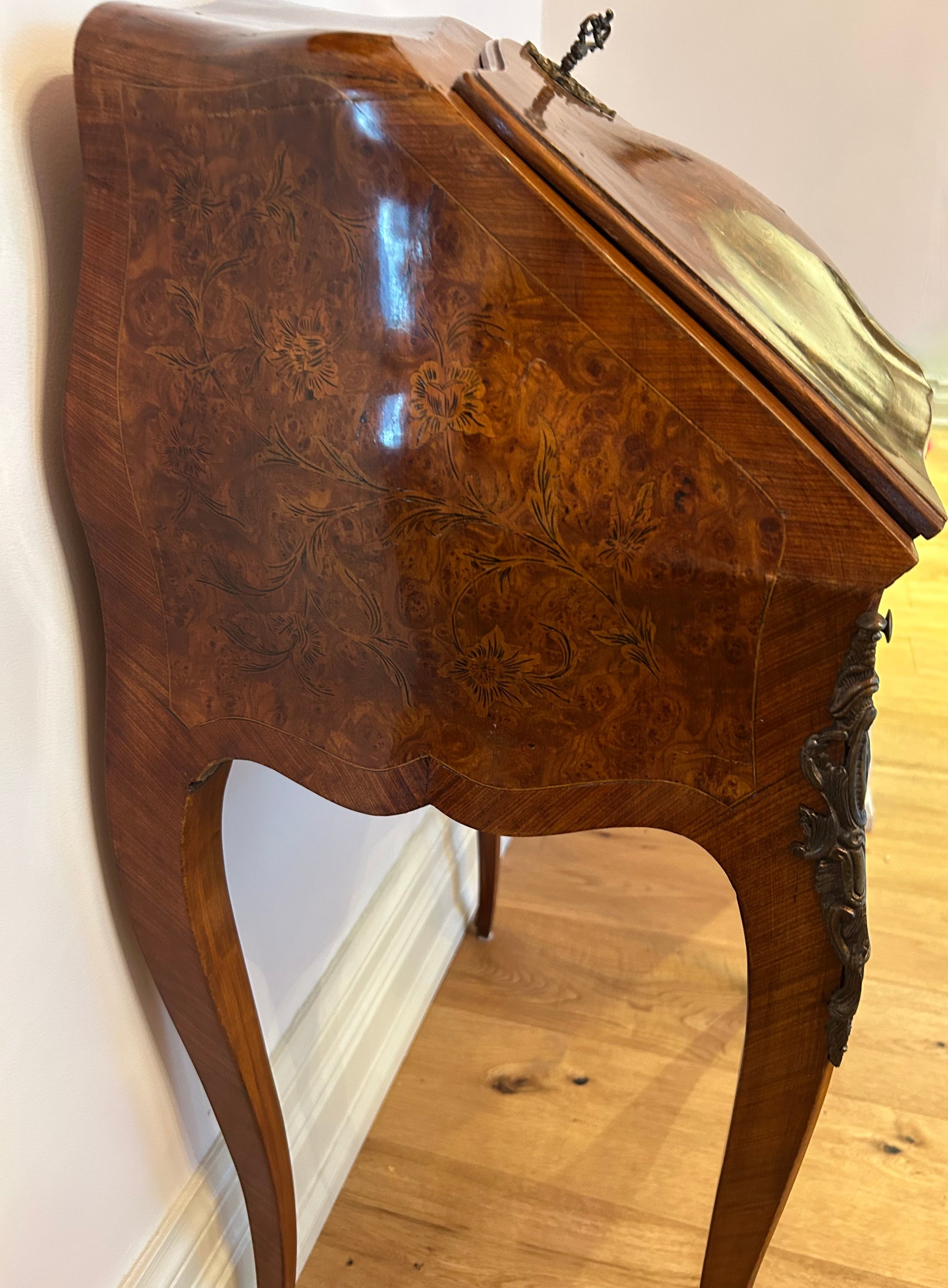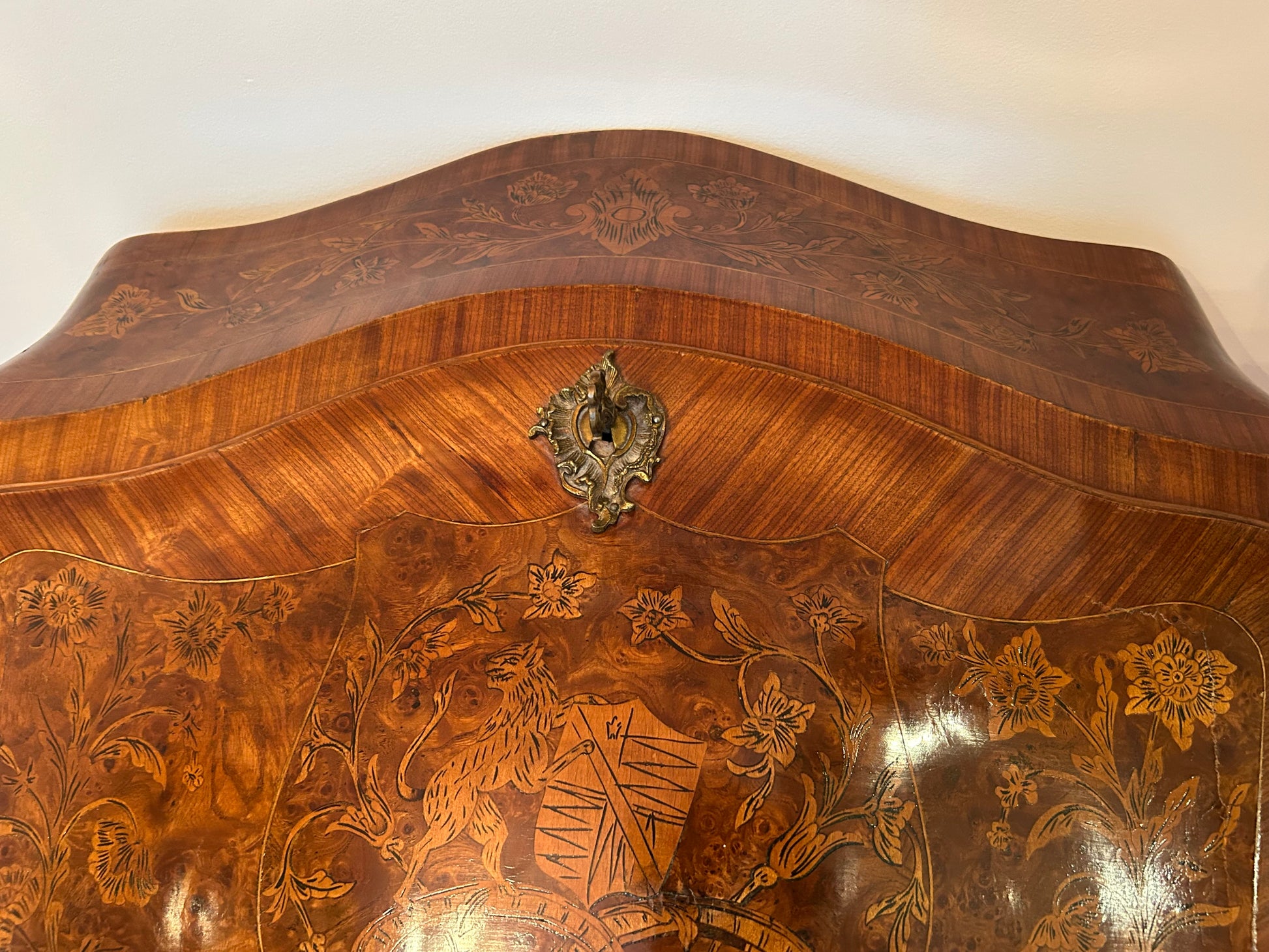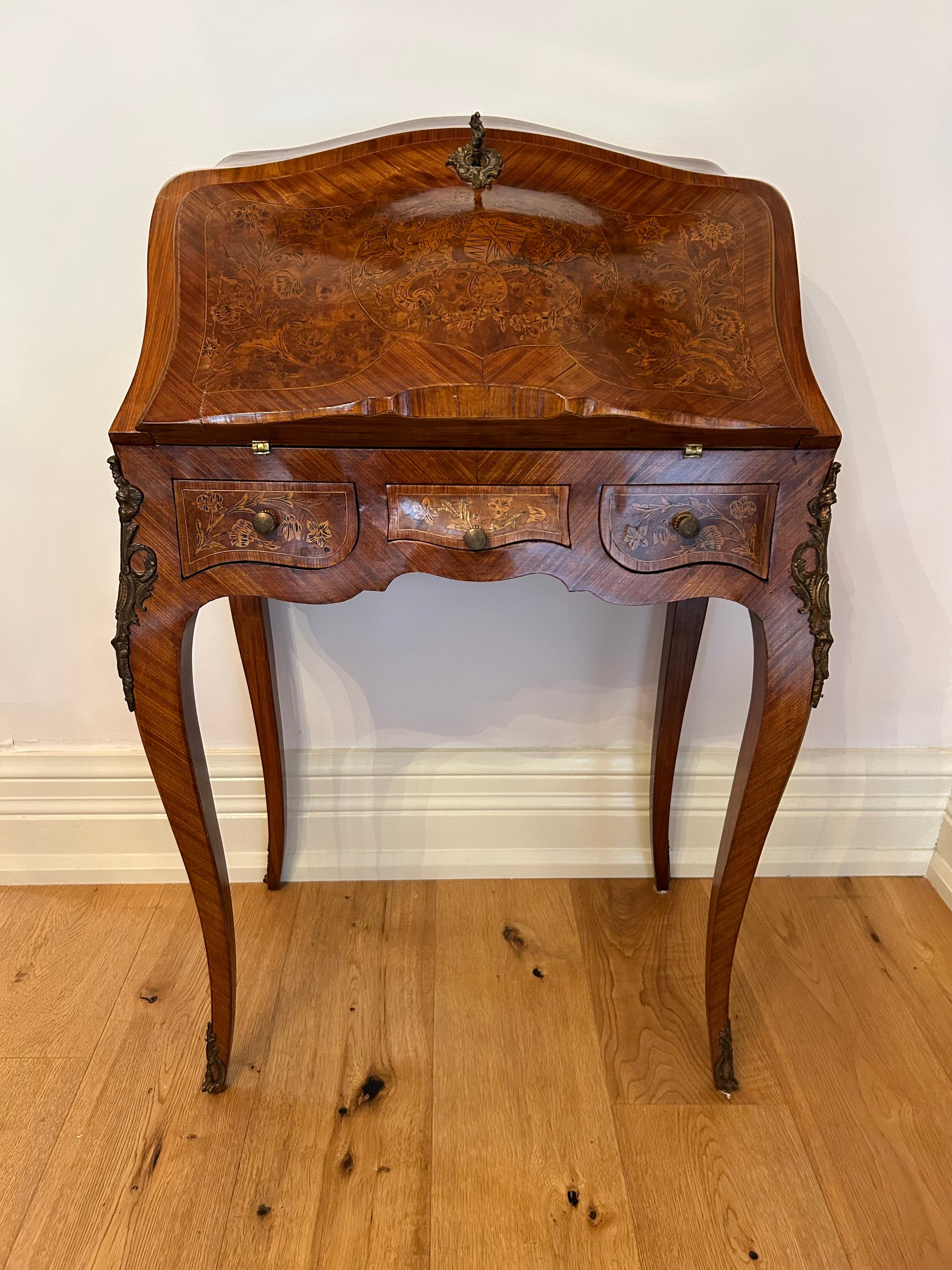 This is a glorious, petite, French lady's desk from France, with exquisite marquetry details and undulating, bombé forms. The front of the desk features three small drawers and a closed, sloped top on which flowers and scrolls surround the figure of a lion holding a heraldic shield, the whole on a background of burl wood surrounded by striated, satin wood veneers. The lid is topped by a very intricate escutcheon and original key, both in bronze.