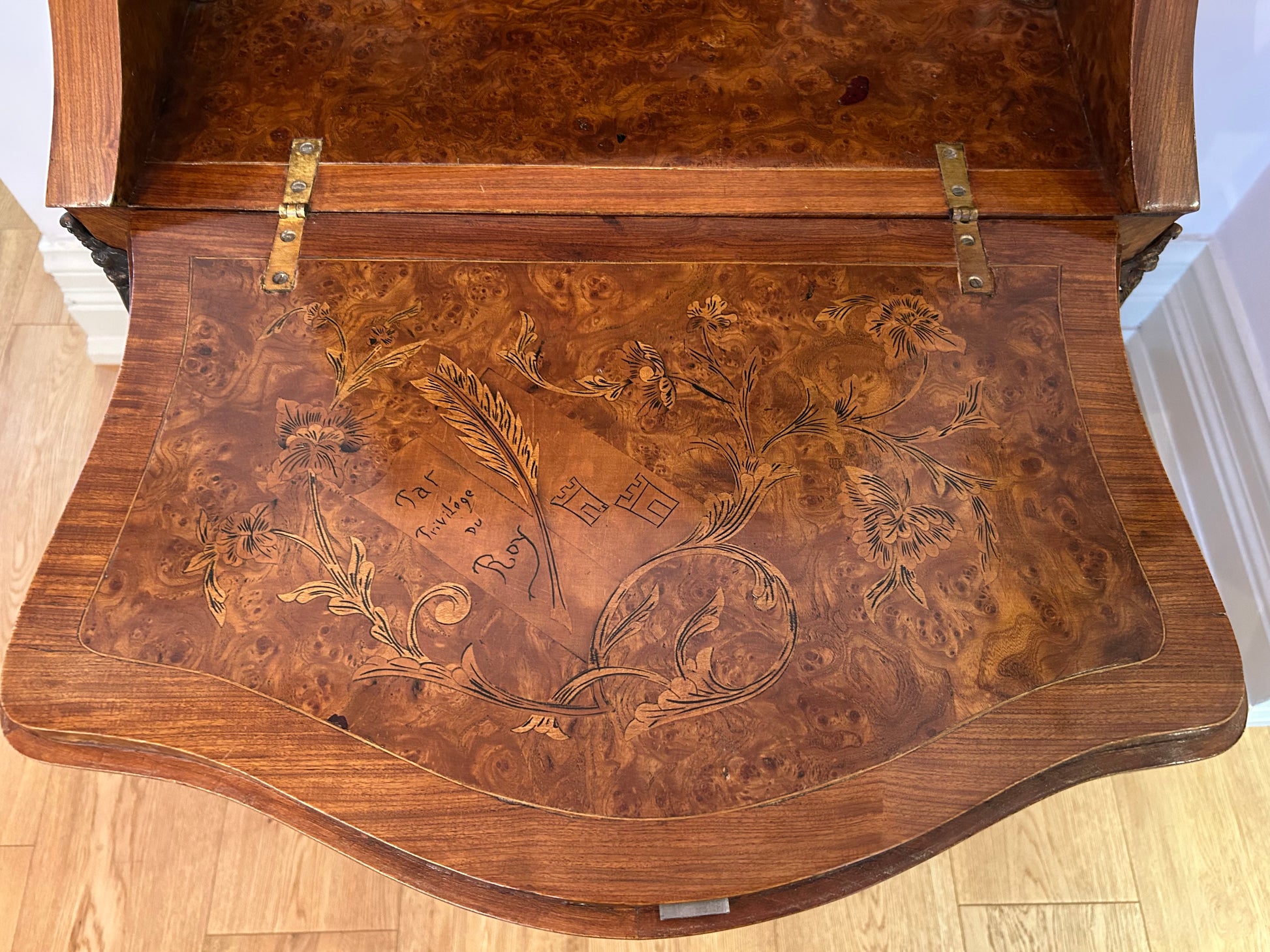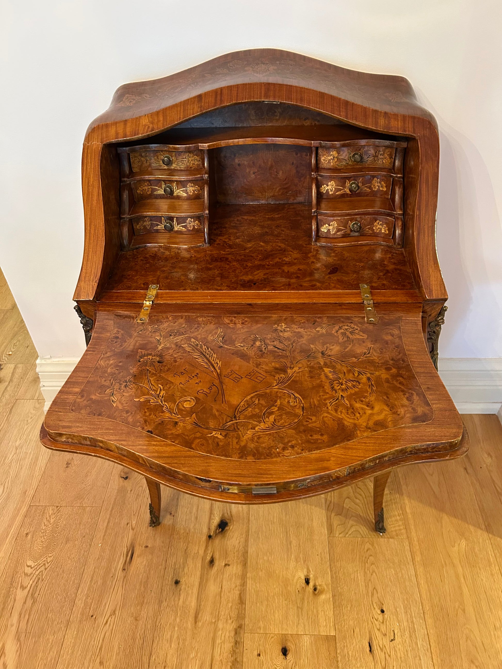 The interior opens to reveal six lovely, graduated drawers and an open top shelf. The interior side of the desk top features more gorgeous marquetry including a figured banner on which is inscribed "Par Privilege Du Roi" (By Favour of the King) alongside two crenelated towers.