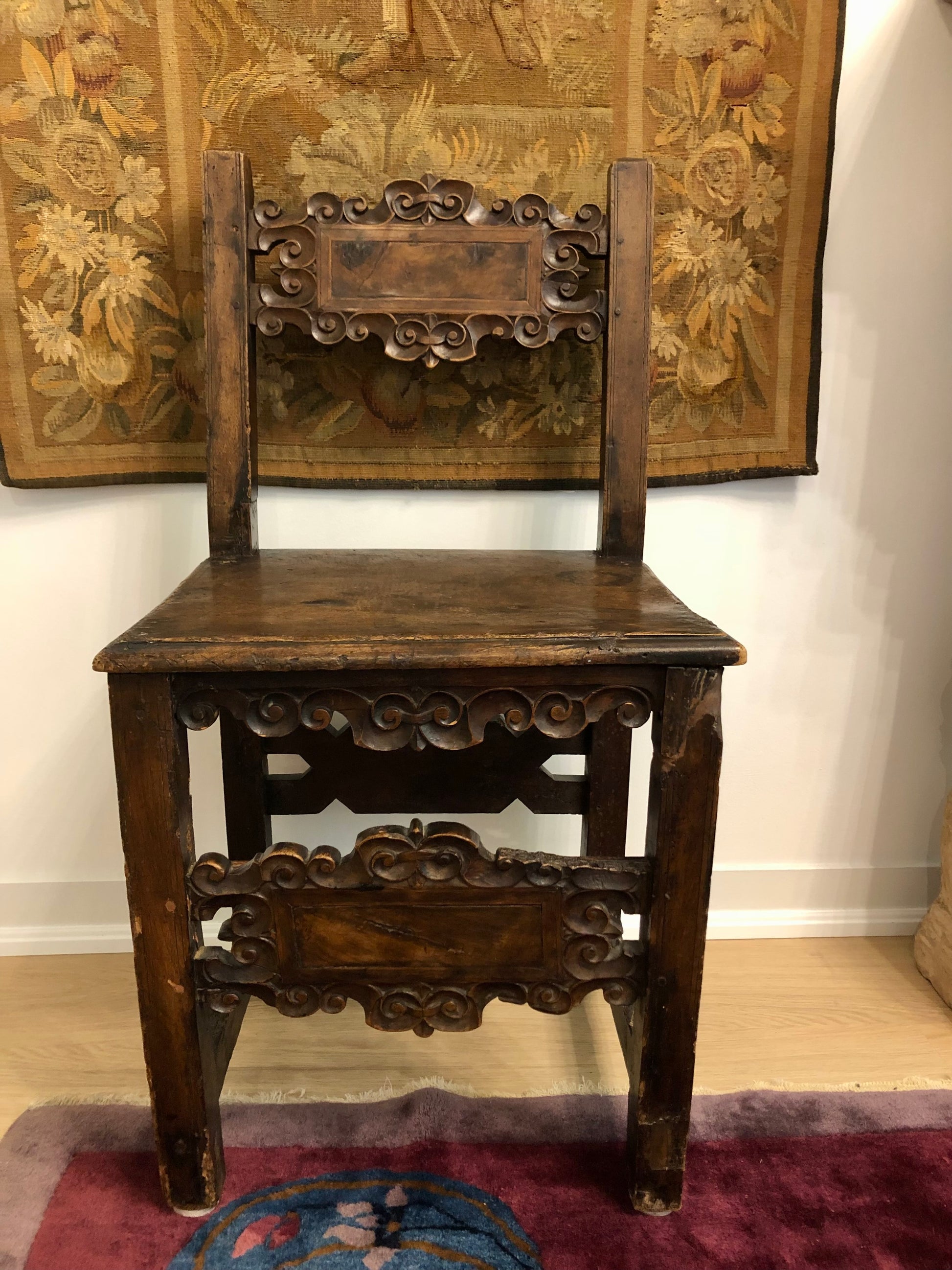Spanish Carved Walnut Side Chair, possibly 17th century.