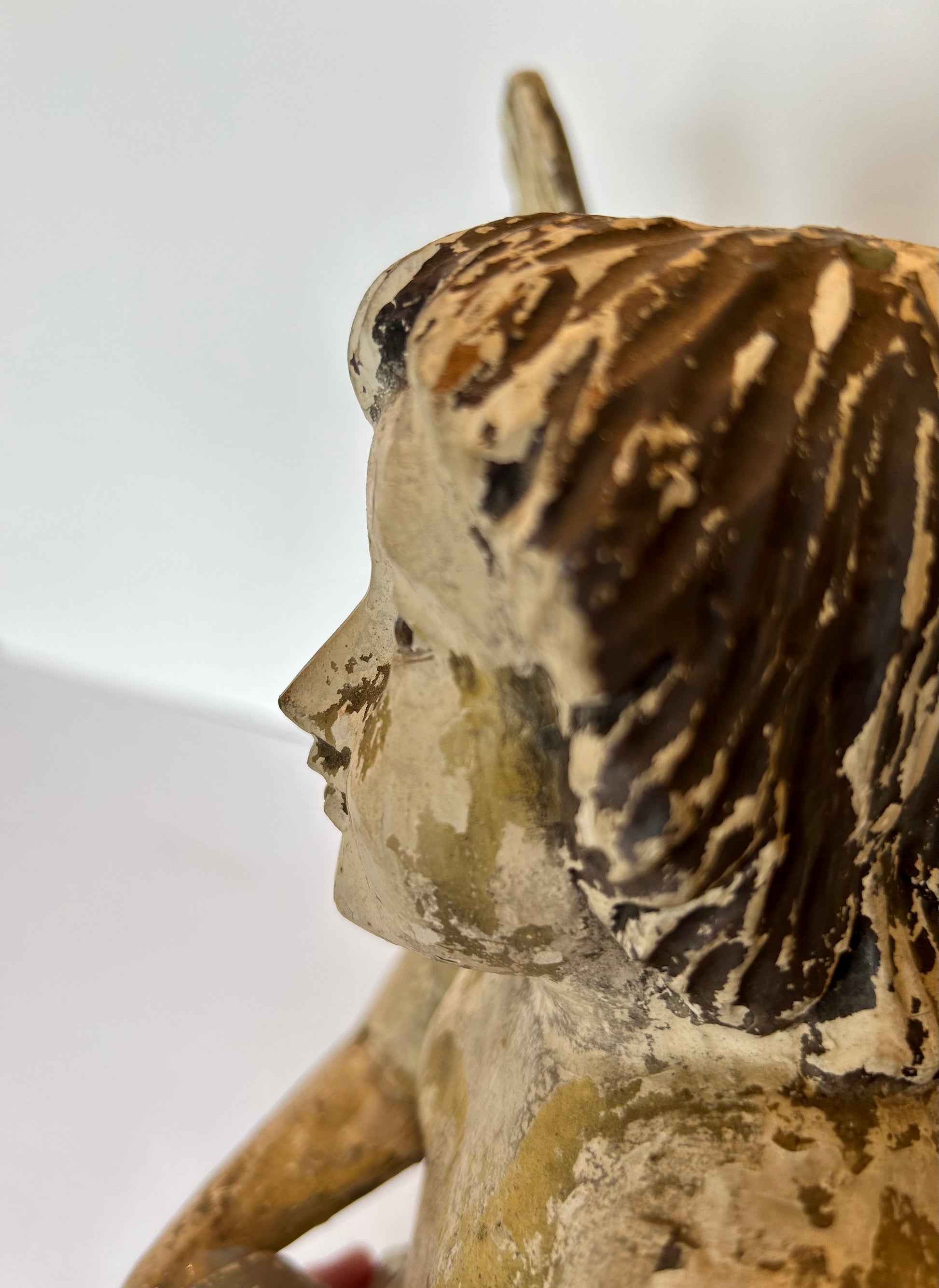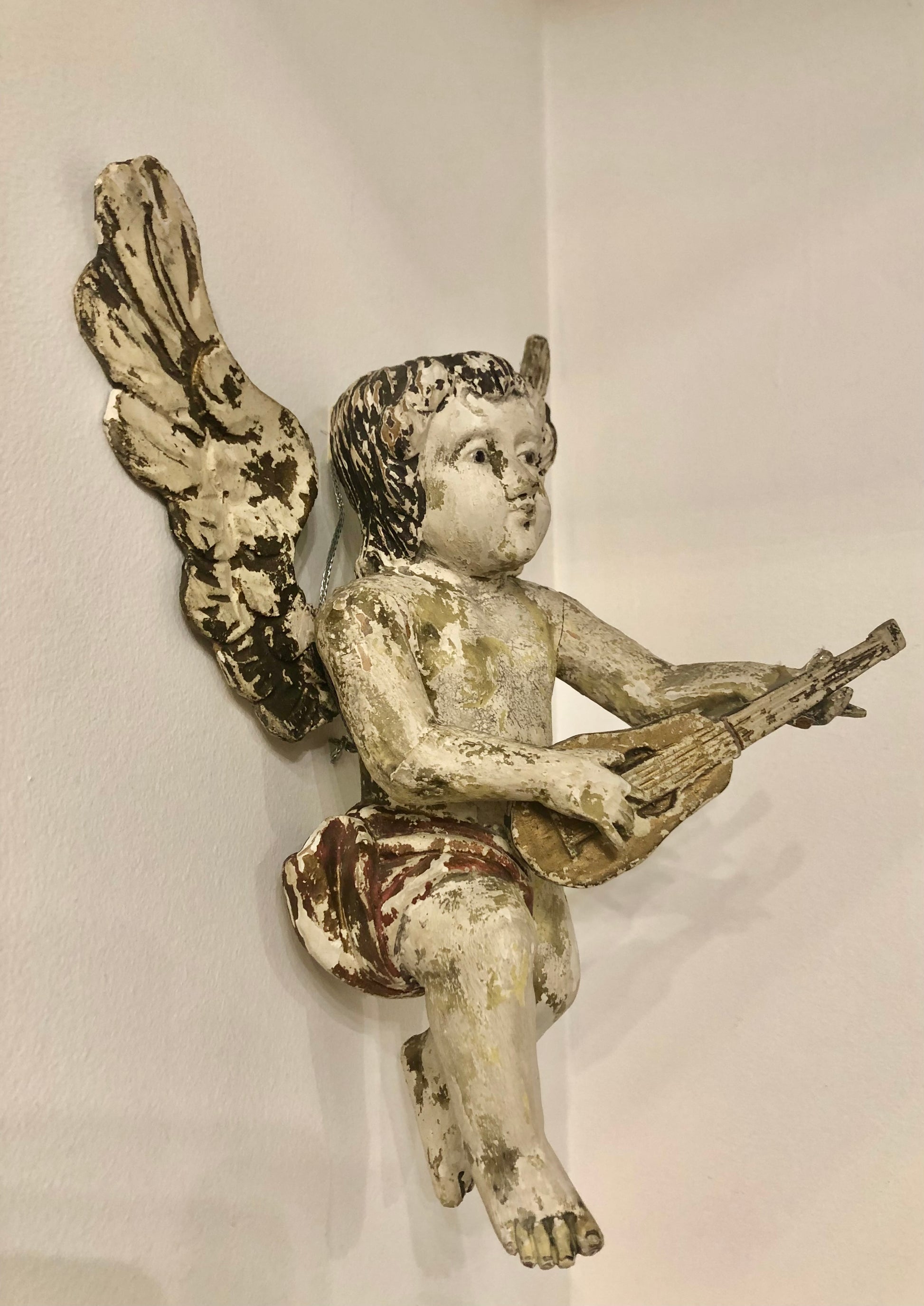 A beautiful early 19th Century polychrome winged cherubim, or angel, holding a guitar or mandolin. This angel would have most probably hung in a church.