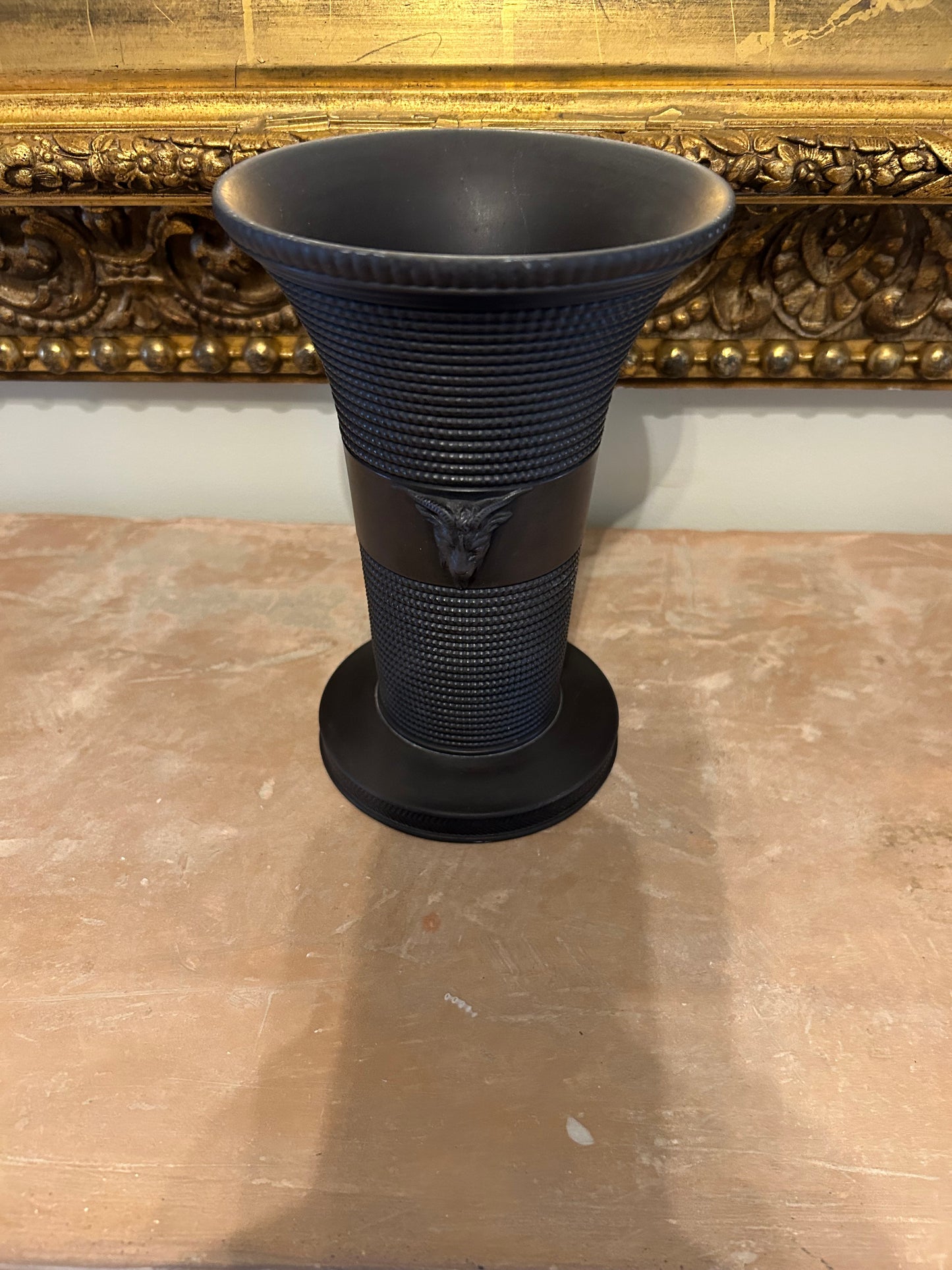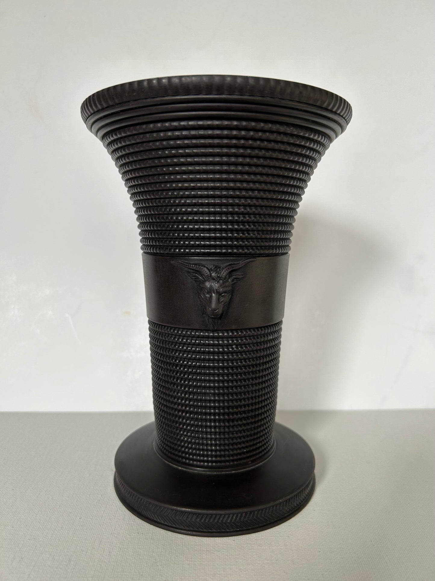 This is a Neoclassical Basalt Wedgwood vase, circa 1956, with a flaring shape, matte black colour and ram heads applied to either side. Marked 'Wedgwood', 'Made in England', and BW.